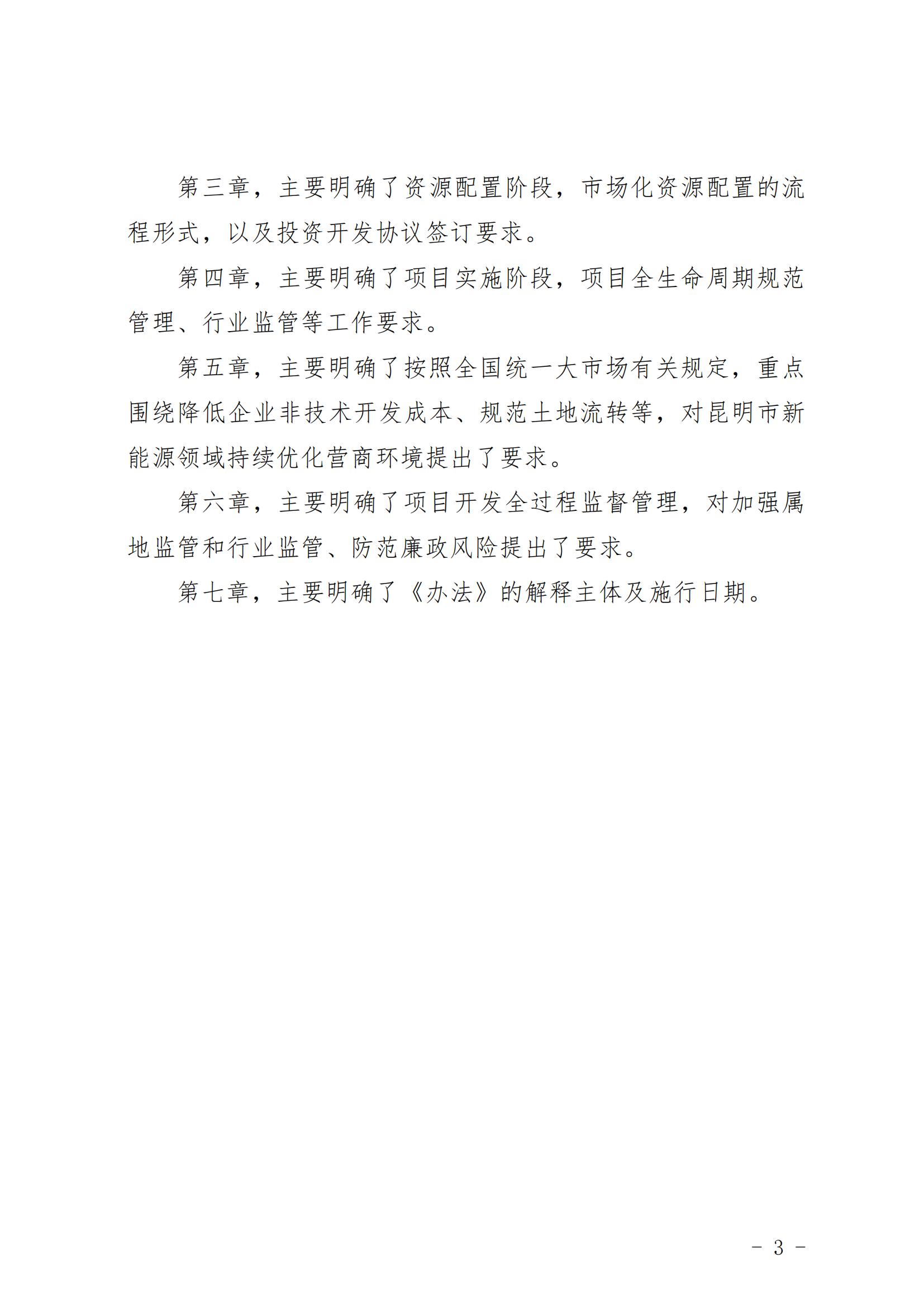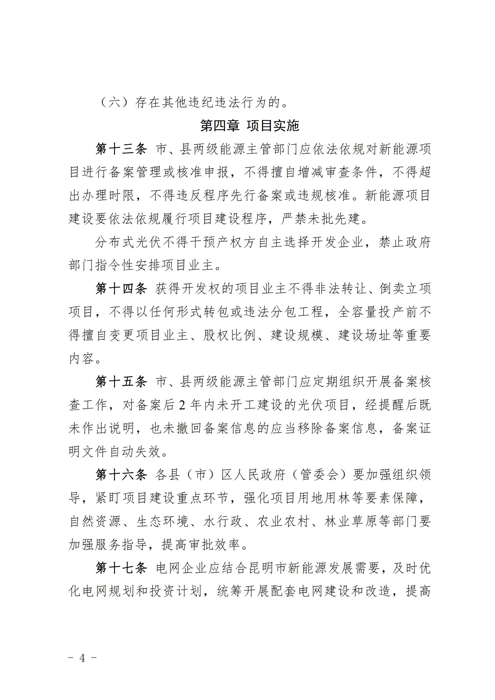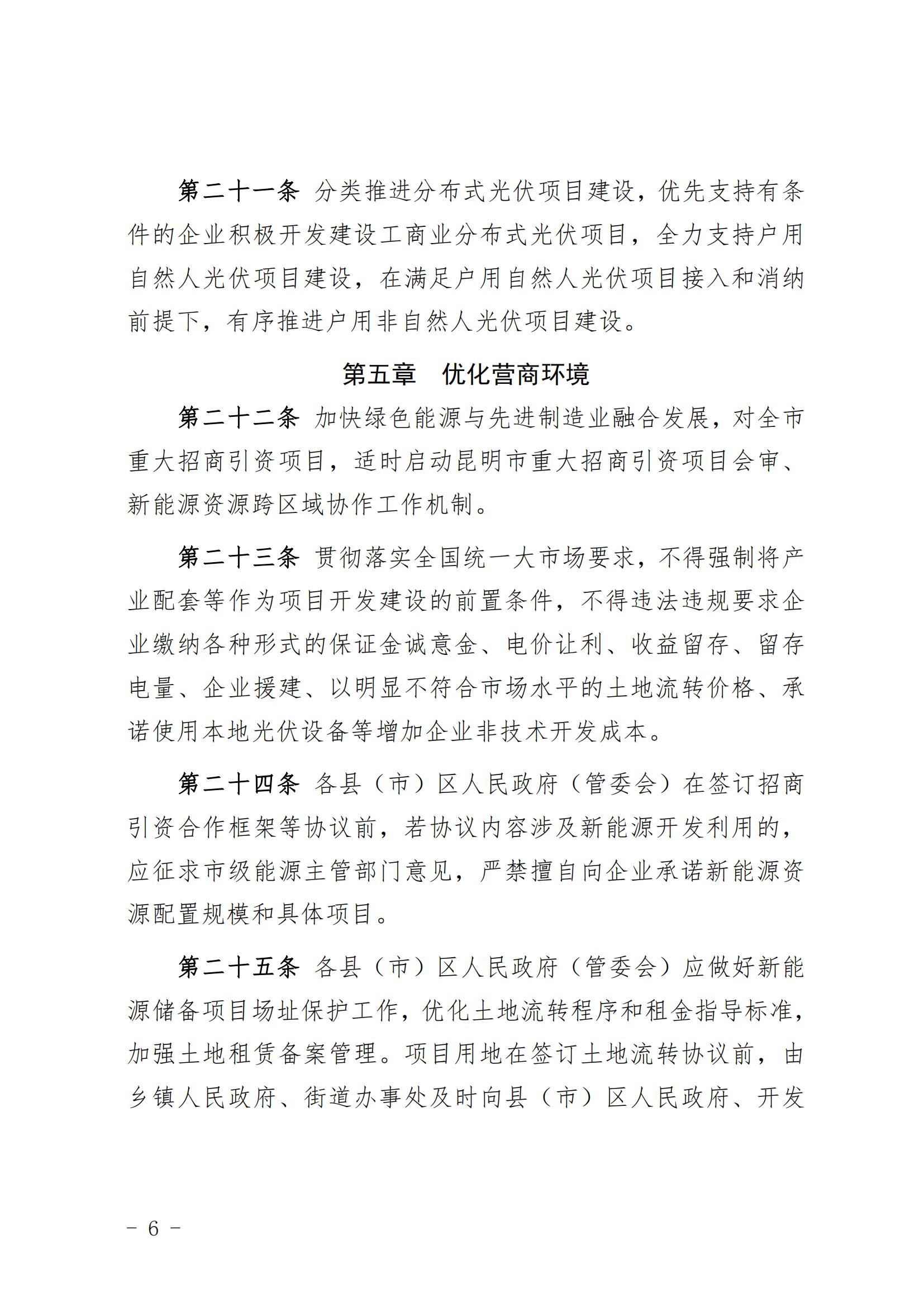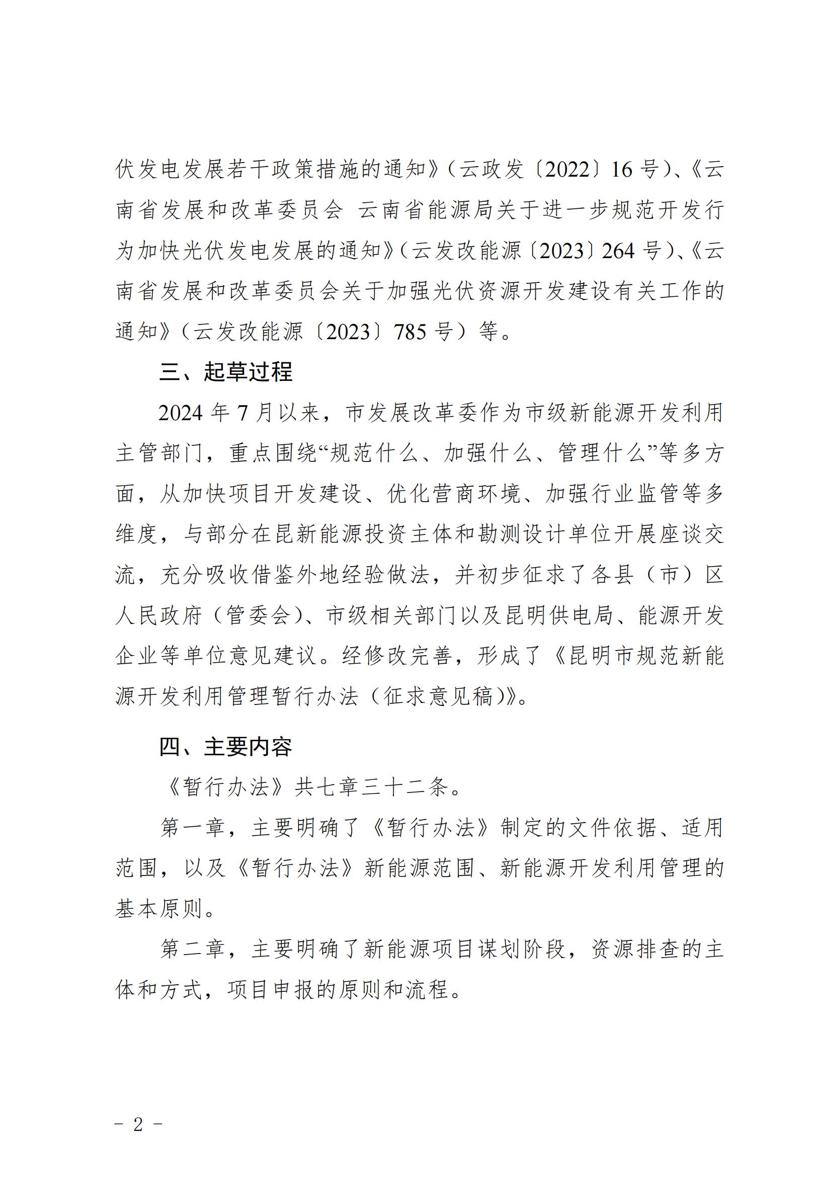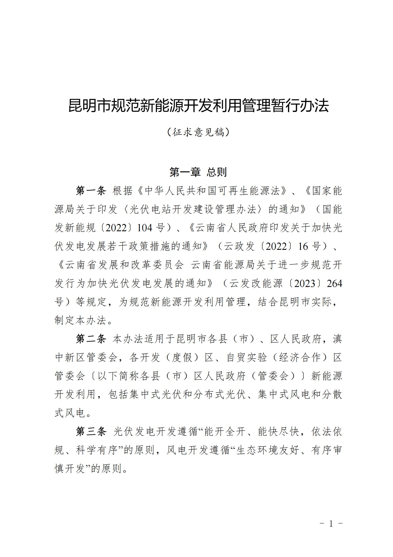 10月16日,昆(kun)明(ming)市發展和改革委員會關于公開(kai)(kai)征求(qiu)《昆(kun)明(ming)市規(gui)范新能(neng)源開(kai)(kai)發利用管(guan)理暫行(xing)辦法(征求(qiu)意見(jian)稿)》意見(jian)的通知,通知指出,集(ji)中式光(guang)伏(fu)和風電項(xiang)目(mu)堅持市場(chang)化資(zi)源配置的原 則(ze),市級能(neng)源主(zhu)(zhu)管(guan)部門按照省級年(nian)度建設(she)方案有關要求(qiu),按批次形(xing)成新能(neng)源項(xiang)目(mu)開(kai)(kai)發方案,按程序報審后(hou),組織有關單位開(kai)(kai) 展項(xiang)目(mu)業主(zhu)(zhu)優選。未納(na)入年(nian)度建設(she)方案的項(xiang)目(mu),不得開(kai)(kai)展項(xiang)目(mu)業主(zhu)(zhu)優選工作。 通(tong)知海指出(chu),分(fen)類推(tui)進(jin)(jin)分(fen)布式光(guang)伏(fu)(fu)項(xiang)目建設,優先支持有條(tiao)件的企業積(ji)極開發(fa)建設工商業分(fen)布式光(guang)伏(fu)(fu)項(xiang)目,全力支持戶用(yong)(yong)自然(ran)人光(guang)伏(fu)(fu)項(xiang)目建設,在滿足戶用(yong)(yong)自然(ran)人光(guang)伏(fu)(fu)項(xiang)目接入和(he)消(xiao)納前提下(xia),有序推(tui)進(jin)(jin)戶用(yong)(yong)非自然(ran)人光(guang)伏(fu)(fu)項(xiang)目建設。 原文(wen)如(ru)下(xia): 昆明市發展和改革委員會 關于公開征求《昆明市規范新能源開發利用管理暫行辦法(征求意見稿)》意見的通知 為規(gui)范昆明市新能(neng)(neng)源(yuan)開發(fa)利(li)用管(guan)理,市發(fa)展(zhan)改革委組織起草了(le)《昆明市規(gui)范新能(neng)(neng)源(yuan)開發(fa)利(li)用管(guan)理暫行辦(ban)法(征求意見(jian)稿)》,并征求了(le)有關方(fang)面(mian)意見(jian)。現向社會公開征求意見(jian),時間為2024年(nian)10月16日(ri)至10月29日(ri)。歡迎有關單位(wei)和社會各界人士提出寶貴意見(jian)建(jian)議,通過電子郵(you)件或傳(chuan)真等形式反饋至市發(fa)展(zhan)改革委水電新能(neng)(neng)源(yuan)處。 感(gan)謝您的(de)參與(yu)和支持! 聯系方式(shi):0871-63136625(傳真(zhen)) 電子(zi)郵箱:sfgwsdc@163.com 附件: 附件1:昆明(ming)市規范新(xin)能源開發利(li)用(yong)管理暫行辦法(征(zheng)求意見(jian)稿) 附件2:昆明(ming)市發展和改革委員會關于《昆明(ming)市規范新(xin)能源開發利(li)用管理暫行辦(ban)法(征(zheng)求意見稿)》的起草(cao)說明(ming) 昆明市發展(zhan)和改(gai)革委員會 2024年10月16日