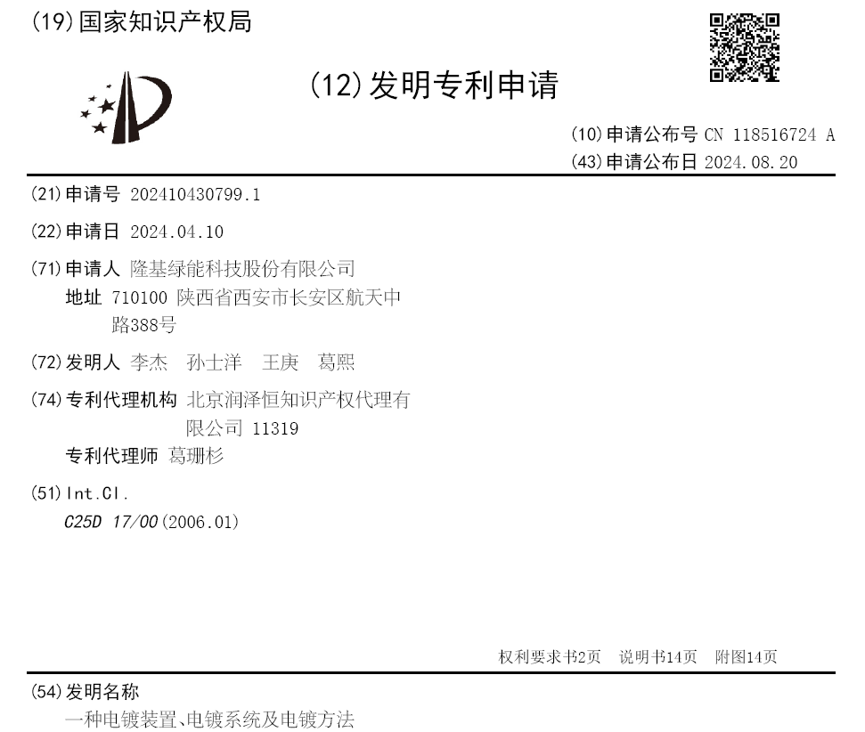 據國家知識產權局公開信息,近日,隆基綠能科技股份有限公司申請了一項名為一種電鍍裝置、電鍍系統及電鍍方法的發明專利。專利申請號為CN202410430799.1,公開號為CN118516724A,公開日為2024.08.20。 專利摘要: 本申請公開了一種電鍍裝置、電鍍系統及電鍍方法,電鍍裝置包括:基座、載板、電極板和光源,基座中設有電鍍槽,電鍍槽用于容納電鍍液;載板活動連接于基座,載板朝向電鍍槽的一側設有承載面,承載面用于承載工件接觸電鍍液;載板中設有隔離結構,隔離結構環繞設于承載面的四周,用于隔離工件的四周側壁與電鍍液;電極板設于電鍍槽內,并適于與工件電性連接。 通過在載板中設置隔離結構,使隔離結構環繞承載面,以便在電鍍過程中,可以利用隔離結構對工件的四周側壁與電鍍液進行隔離,從而避免工件出現繞鍍的問題,提升電鍍質量。