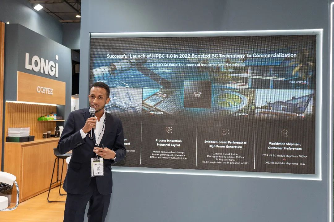 近日,沙特太陽能光伏及儲能展(The Solar & Storage Live KSA 2024)在沙特首都利雅得舉辦。隆基中東北非代表處攜Hi-MO X10組件新品和智能應用程序LONGi Arabia出席,在一眾展商中脫穎而出,成為現場的吸睛王。 隆基展臺 沙特太陽能光伏及儲能展是沙特阿拉伯最具影響力的光伏及儲能專業展會,本屆展會吸引了超過300家相關企業參展,參展人數高達3萬余人。隆基中東北非代表處聯合兩家當地分銷客戶一同參展,現場展出Hi-MO X10、Hi-MO X6 Max和Horizon小組件,并舉辦了新品揭幕和智能應用程序LONGi Arabia發布活動,以多元的展品和豐富的展臺活動吸引諸多現場觀眾。 線下首秀,開啟2.0征途 在隆基展臺上,Hi-MO X10組件在中東地區完成線下首秀,成為展會的高光時刻。Hi-MO X10是隆基全新一代分布式組件產品,基于泰睿硅片和劃時代的HPBC2.0電池打造,再疊加雙極復合鈍化、0BB以及高可靠封裝工藝,實現了發電性能、可靠性、客戶收益以及美觀性的全面領先。 Hi-MO X10在中東地區線下首秀 隆基全展位采用深灰色調與極簡設計,突出流線感和科技元素,與Hi-MO X10組件的外觀理念極度貼合。高亮的白色射燈下,一塊全真組件位于展臺正中央,可活動式的展架設計更便于展示Hi-MO X10組件“正面無柵線”、“背面無主柵”的設計亮點,科技感滿溢。 中東北非代表處技術經理Ahmed Omer在現場作HPBC 2.0技術路線講解,他用POWER FOR VALUE理念,從P-O-W-E-R五個方面詮釋了Hi-MO X10組件何以叩響2.0時代的大門。 Ahmed Omer展臺演講 Peak——巔峰。Hi-MO X10組件量產效率達24.8%,再破全球組件量產效率最高紀錄;Optimum Dimension——最佳尺寸。基于當前主流版型尺寸,Hi-MO X10組件實現了同樣面積、更高收益;Wafer revolution——硅片革命。搭載隆基自研的泰睿硅片,實現了近十年來硅片領域實質性的創新突破。 Efficiency——效率。HPBC2.0電池技術實現了晶硅電池絕對效率1%的突破,Hi-MO X10組件最高量產功率670W,較行業TOPCon主流組件功率高30W以上;Reliable Performance——性能可靠。Hi-MO X10組件首年衰減1%,線性衰減0.35%,提供15年產品質保、30年功率質保。 Ahmed Omer與現場觀眾交流 中東北非代表處負責人騰達在現場表示,光伏行業正面臨激烈競爭,只有勇于探索、銳意進取才能走出困境。隆基一直都是技術創新的先行者與行業發展的引領者,“我們相信,足夠優秀的產品扛得住風浪、禁得起檢驗。” 客戶定制,掌中一站式光伏專家 在展臺現場,中東北非代表處還發布了自主研發的智能應用程序LONGi Arabia,只需指尖輕觸,客戶足不出戶即可享受隆基的全方位即時服務。用戶可以通過這款手機程序,瀏覽隆基的全系列產品家族、查詢質保時間、學習光伏知識,它就像一位隨身攜帶的“隆基產品專家”,為客戶提供觸手可及的一站式光伏服務。 隆基中東北非代表處發布LONGi Arabia 智能應用程序發布后,三家沙特分銷客戶現場入駐LONGi Arabia,中東北非代表處負責人騰達為他們頒發了認證證書。 騰達為入駐LONGi Arabia的分銷客戶頒發認證證書 在為期兩天的展會期間,隆基展臺人頭攢動,共接待專業觀眾1500余名。隆基展臺工作人員與行業同仁進行了深入且充分的交流,共論光伏市場發展趨勢與前景。現場舉辦的兩場發布活動也取得亮眼成績,以創新產品和解決方案回答了行業之問。 隆基中東北非代表處成員與合作伙伴合影 沙漠之上,綻放新陽。中東地區擁有巨大的太陽能開發潛力,中國與中東的光伏合作持續升溫。自2019年進入中東市場以來,隆基在中東重要國家一直保有持續有效的曝光。線下展會是與當地客戶建立有效連接的重要方式,此次展會為隆基提供了展示技術實力和市場拓展的契機,與沙特當地合作伙伴建立起更加深厚、緊密的紐帶關系,攜手共創更加美好的零碳未來。