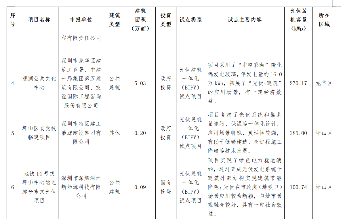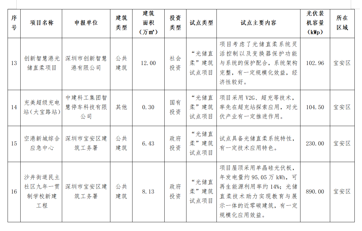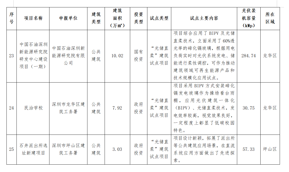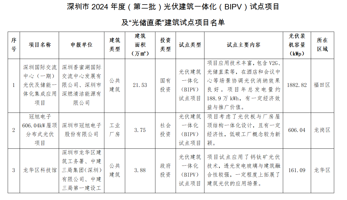 11月20日(ri),深(shen)圳(zhen)市(shi)住建局公布(bu)了深(shen)圳(zhen)市(shi)2024年度(第二批)光伏建筑一體化(hua)(BIPV)及(ji)“光儲(chu)直柔(rou)”建筑試點項(xiang)目名單(dan),共計26個項(xiang)目上榜,總裝機容量9929.34kWp。 詳情如下: 深圳市住房和建設局關于公布深圳市2024年度(第二批)光伏建筑一體化(BIPV)及“光儲直柔”建筑試點項目的通知 各有關單位(wei): 為貫徹(che)落(luo)實國家和(he)省(sheng)、市(shi)關于推(tui)動城(cheng)鄉(xiang)建(jian)設綠色(se)發展的部(bu)署(shu)要求,加快推(tui)進建(jian)筑(zhu)領域可再生(sheng)能源產品(pin)和(he)技術規模(mo)化(hua)(hua)應用,持續優(you)化(hua)(hua)建(jian)筑(zhu)用能結構,助力(li)我市(shi)數字能源先鋒城(cheng)市(shi)建(jian)設,我局組織完成了2024年(nian)度光(guang)(guang)伏建(jian)筑(zhu)一體(ti)化(hua)(hua)(BIPV)試(shi)點(dian)(dian)項目(mu)及“光(guang)(guang)儲(chu)直柔(rou)”建(jian)筑(zhu)試(shi)點(dian)(dian)項目(mu)申報工作(zuo)。經評審,“福田區委大院光(guang)(guang)儲(chu)超(chao)充、車網(wang)互動一體(ti)化(hua)(hua)停車場項目(mu)”等26個項目(mu)被確定為深(shen)圳市(shi)2024年(nian)度(第二批)光(guang)(guang)伏建(jian)筑(zhu)一體(ti)化(hua)(hua)(BIPV)試(shi)點(dian)(dian)項目(mu)或(huo)“光(guang)(guang)儲(chu)直柔(rou)”建(jian)筑(zhu)試(shi)點(dian)(dian)項目(mu),現予以公布(bu)(項目(mu)名單詳見附件)。 請各試點項目申報(bao)單(dan)位嚴格按照項目申報(bao)書及通知(zhi)要(yao)求(qiu),組織做好項目實(shi)施,確保(bao)完成試點任務,力爭形(xing)成可(ke)復制、可(ke)推廣的經驗做法,發揮引領(ling)作用。 聯系(xi)人:胡志遠,聯系(xi)電(dian)話:0755-83218904;袁玉(yu)華,聯系(xi)電(dian)話:0755-83789895。 附件: 深圳市住(zhu)房和建(jian)設局 2024年11月20日