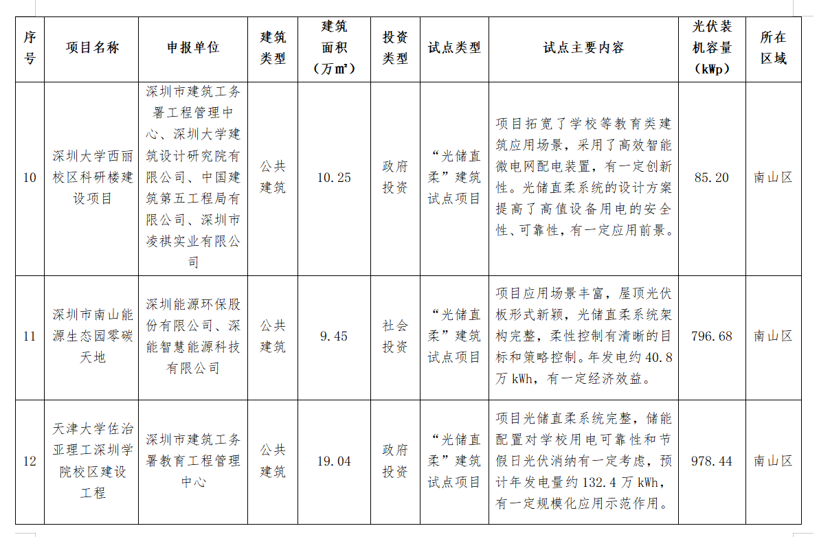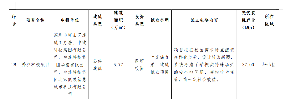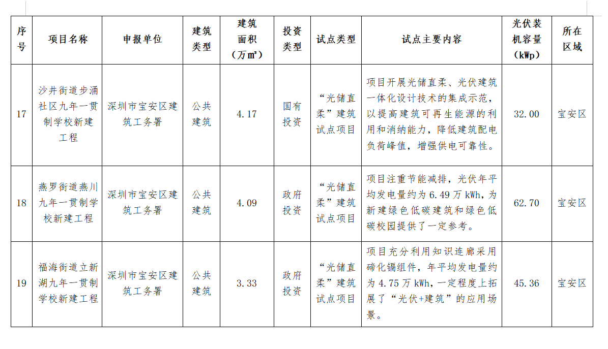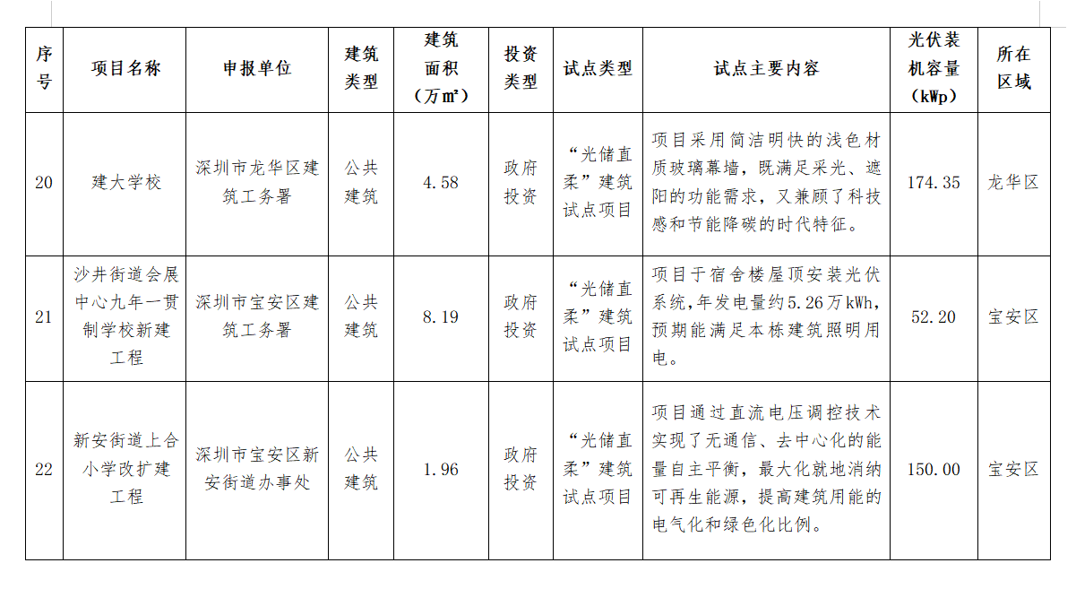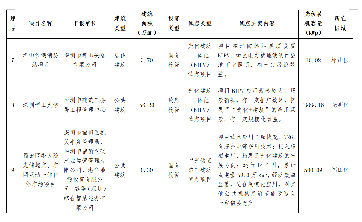 11月20日(ri),深(shen)圳(zhen)市(shi)住建局公布(bu)了深(shen)圳(zhen)市(shi)2024年度(第二批)光伏建筑一體化(hua)(BIPV)及(ji)“光儲(chu)直柔(rou)”建筑試點項(xiang)目名單(dan),共計26個項(xiang)目上榜,總裝機容量9929.34kWp。 詳情如下: 深圳市住房和建設局關于公布深圳市2024年度(第二批)光伏建筑一體化(BIPV)及“光儲直柔”建筑試點項目的通知 各有關單位(wei): 為貫徹(che)落(luo)實國家和(he)省(sheng)、市(shi)關于推(tui)動城(cheng)鄉(xiang)建(jian)設綠色(se)發展的部(bu)署(shu)要求,加快推(tui)進建(jian)筑(zhu)領域可再生(sheng)能源產品(pin)和(he)技術規模(mo)化(hua)(hua)應用,持續優(you)化(hua)(hua)建(jian)筑(zhu)用能結構,助力(li)我市(shi)數字能源先鋒城(cheng)市(shi)建(jian)設,我局組織完成了2024年(nian)度光(guang)(guang)伏建(jian)筑(zhu)一體(ti)化(hua)(hua)(BIPV)試(shi)點(dian)(dian)項目(mu)及“光(guang)(guang)儲(chu)直柔(rou)”建(jian)筑(zhu)試(shi)點(dian)(dian)項目(mu)申報工作(zuo)。經評審,“福田區委大院光(guang)(guang)儲(chu)超(chao)充、車網(wang)互動一體(ti)化(hua)(hua)停車場項目(mu)”等26個項目(mu)被確定為深(shen)圳市(shi)2024年(nian)度(第二批)光(guang)(guang)伏建(jian)筑(zhu)一體(ti)化(hua)(hua)(BIPV)試(shi)點(dian)(dian)項目(mu)或(huo)“光(guang)(guang)儲(chu)直柔(rou)”建(jian)筑(zhu)試(shi)點(dian)(dian)項目(mu),現予以公布(bu)(項目(mu)名單詳見附件)。 請各試點項目申報(bao)單(dan)位嚴格按照項目申報(bao)書及通知(zhi)要(yao)求(qiu),組織做好項目實(shi)施,確保(bao)完成試點任務,力爭形(xing)成可(ke)復制、可(ke)推廣的經驗做法,發揮引領(ling)作用。 聯系(xi)人:胡志遠,聯系(xi)電(dian)話:0755-83218904;袁玉(yu)華,聯系(xi)電(dian)話:0755-83789895。 附件: 深圳市住(zhu)房和建(jian)設局 2024年11月20日