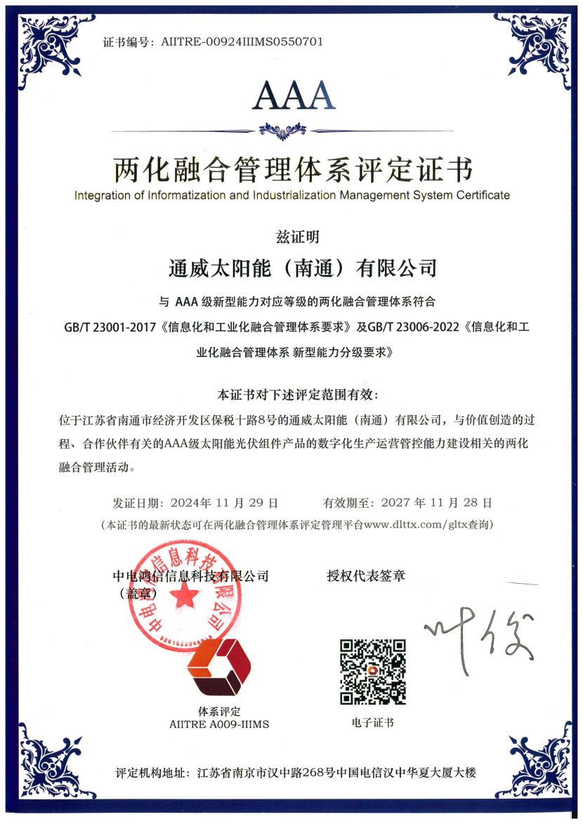 通威太陽能(南通)榮獲AAA級兩化融合管理體系評定證書2024-12-05 11:18來源:gessey瀏覽數:249次
