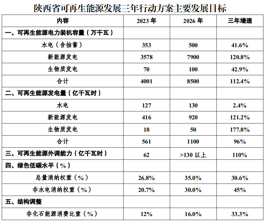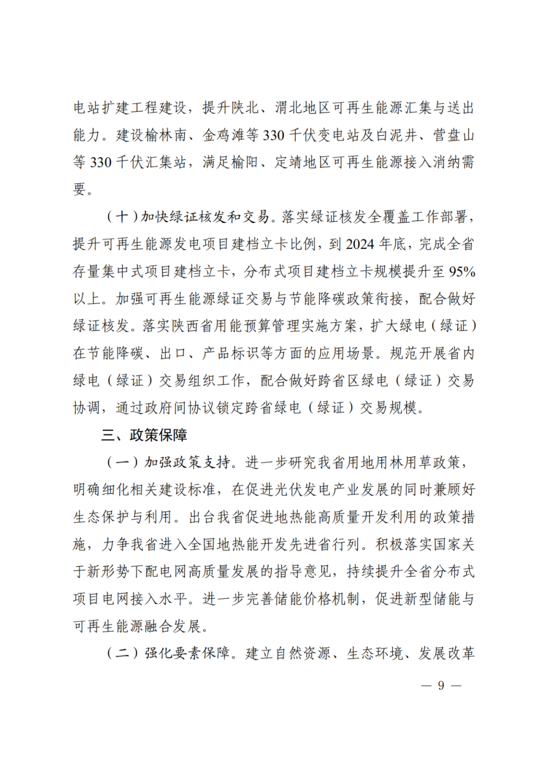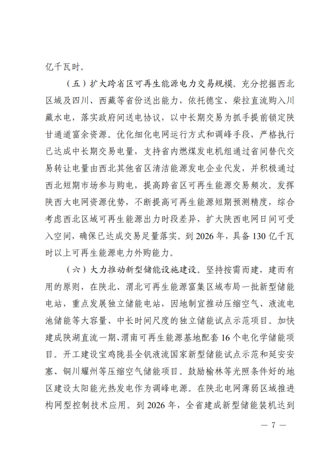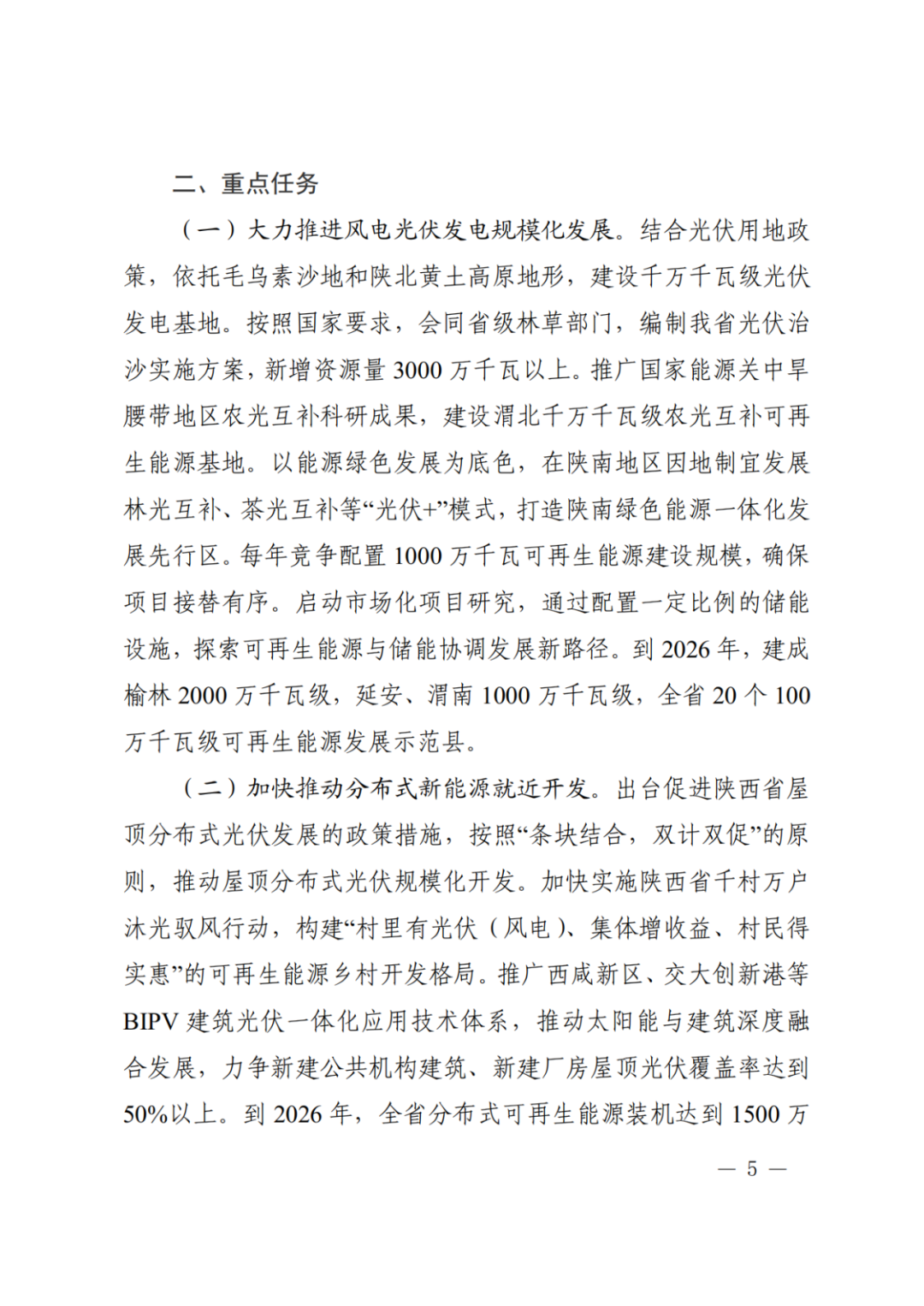 日(ri)前,陜西省(sheng)發改委印(yin)發《關于(yu)印(yin)發陜西省(sheng)可再生能源發展三年行動方(fang)案(an)(2024—2026)的通知(zhi)》,初步規劃(hua)預計到2026年省(sheng)內新能源裝機規模(mo)達79GW,增速120.8%。 文件(jian)規(gui)劃(hua),到2026年,全省(sheng)可再(zai)生能(neng)源裝(zhuang)(zhuang)機突(tu)破8500萬千瓦(wa),非化石(shi)能(neng)源裝(zhuang)(zhuang)機占(zhan)比(bi)(bi)達到55%以(yi)上(shang);20230年,力爭(zheng)可再(zai)生能(neng)源裝(zhuang)(zhuang)機規(gui)模達到1.2億千瓦(wa)左右,省(sheng)內(nei)自用非化石(shi)能(neng)源裝(zhuang)(zhuang)機占(zhan)比(bi)(bi)達到60%左右。 根據其(qi)主要發展目標來看,2026年(nian)(nian)陜西(xi)(xi)省(sheng)新能(neng)(neng)(neng)源(yuan)(yuan)(yuan)裝機擬達到79GW以上,而日前陜西(xi)(xi)省(sheng)能(neng)(neng)(neng)源(yuan)(yuan)(yuan)局(ju)新能(neng)(neng)(neng)源(yuan)(yuan)(yuan)處(chu)的公開(kai)信息顯示,預(yu)計2024年(nian)(nian)底(di)陜西(xi)(xi)省(sheng)新能(neng)(neng)(neng)源(yuan)(yuan)(yuan)裝機將達50GW以上,這(zhe)意味(wei)著未來2年(nian)(nian)陜西(xi)(xi)省(sheng)新能(neng)(neng)(neng)源(yuan)(yuan)(yuan)新增空間最低目標為(wei)29GW,年(nian)(nian)均增幅近15GW/年(nian)(nian)。 文件要求,大力推進風電光伏(fu)發(fa)電規(gui)模(mo)化發(fa)展。結(jie)合(he)光伏(fu)用地(di)政策,依托毛烏素(su)沙地(di)和陜北黃土(tu)高原(yuan)地(di)形,建設(she)千萬千瓦(wa)級(ji)光伏(fu)發(fa)電基地(di)。其(qi)中:光伏(fu)治沙方(fang)案資源量(liang)達30GW以(yi)上;關中旱腰帶(dai)建設(she)渭北千萬千瓦(wa)級(ji)農光互補(bu)可再生能源基地(di);陜南地(di)區因地(di)制宜發(fa)展林光、茶(cha)光互補(bu)。 每(mei)年競爭10GW可(ke)再(zai)生能源建(jian)設(she)規模(mo),到(dao)2026年建(jian)成榆林20GW級(ji);延安、渭南10GW級(ji),全省20個(ge)GW級(ji)可(ke)再(zai)生能源發展示范(fan)縣。 此外,加(jia)快(kuai)推動(dong)分布(bu)式新能源就近開(kai)發(fa),推動(dong)屋(wu)頂分布(bu)式光伏(fu)規模(mo)化開(kai)發(fa),力爭新建公(gong)共機(ji)構建筑、新建廠房屋(wu)頂光伏(fu)覆(fu)蓋(gai)率達(da)到50%以上。到2026年(nian),全省分布(bu)式可再(zai)生能源裝機(ji)達(da)15GW以上。 特高壓方(fang)面,除已有通(tong)道(dao)外,研究論證(zheng)新建(jian)青(qing)海經甘肅(su)至(zhi)陜南雙回750千伏線路,進(jin)一步提高我省(sheng)(sheng)與青(qing)海等省(sheng)(sheng)互濟能(neng)力。加快陜皖、陜豫外送通(tong)道(dao)規(gui)劃新能(neng)源項目建(jian)設,實現更大范圍和規(gui)模的資源優化(hua)配(pei)置。 在(zai)政(zheng)策(ce)保障(zhang)(zhang)方面,進一步研究(jiu)用地(di)用林(lin)用草政(zheng)策(ce),明(ming)確(que)細(xi)化相關(guan)標(biao)準,加強要素保障(zhang)(zhang),在(zai)土地(di)林(lin)業資源保障(zhang)(zhang)、調度管(guan)理等方面優先配置,持續(xu)提升全省分布(bu)式項目電網接入水平。 技(ji)術(shu)方面則推進隆基高效BC電池產業化及量(liang)產,加大對鈣鈦礦電池等關鍵技(ji)術(shu)的支持力度,爭(zheng)取(qu)早日(ri)產業化。 具體見下(xia):