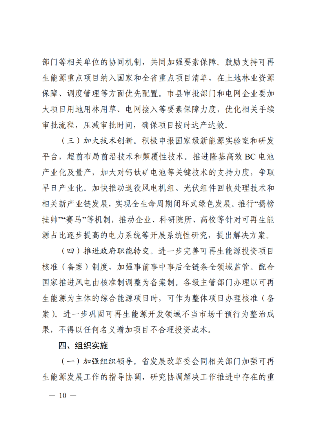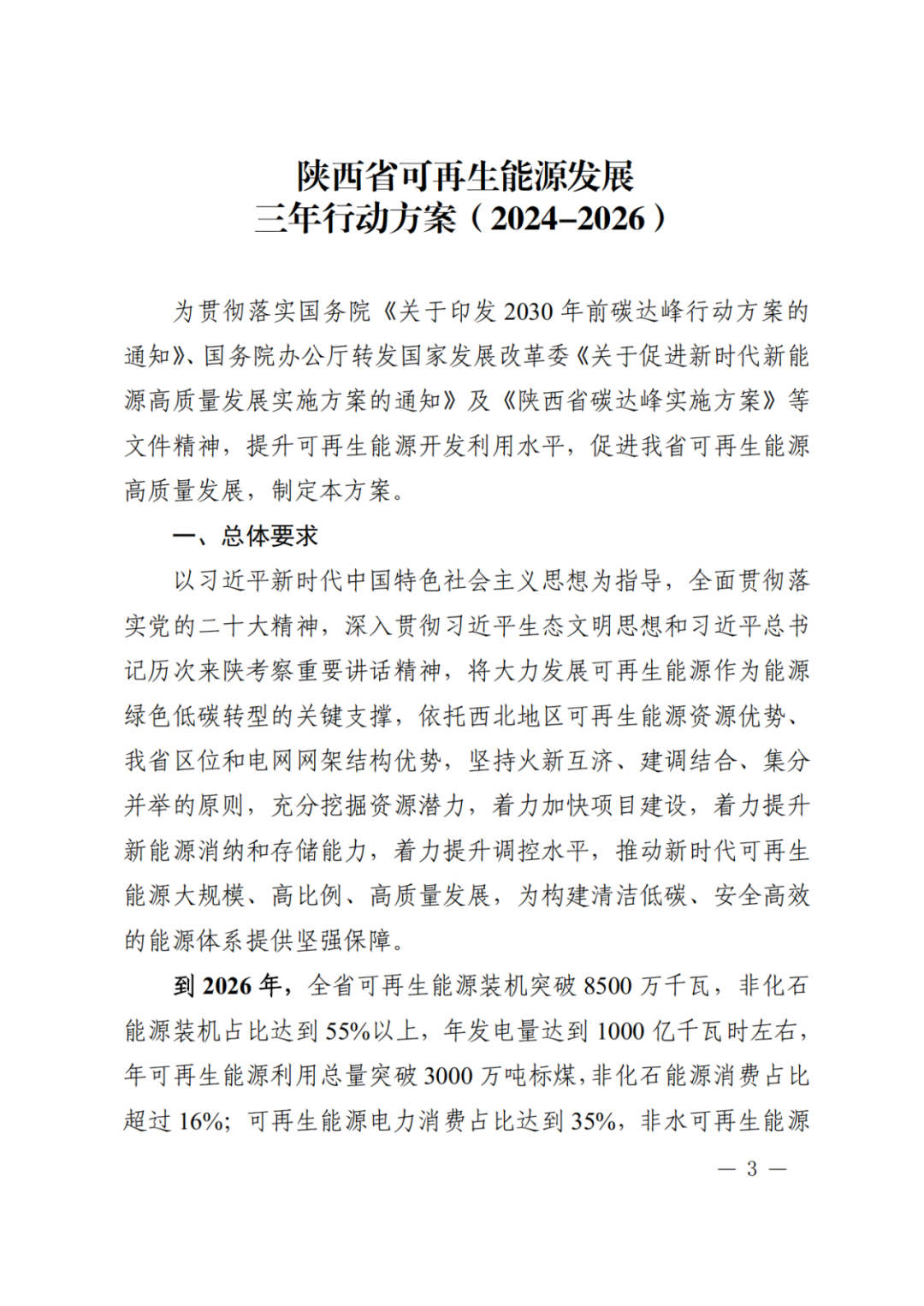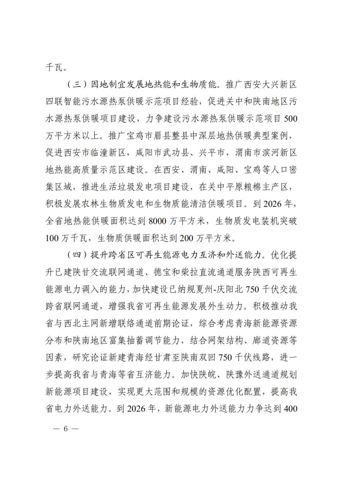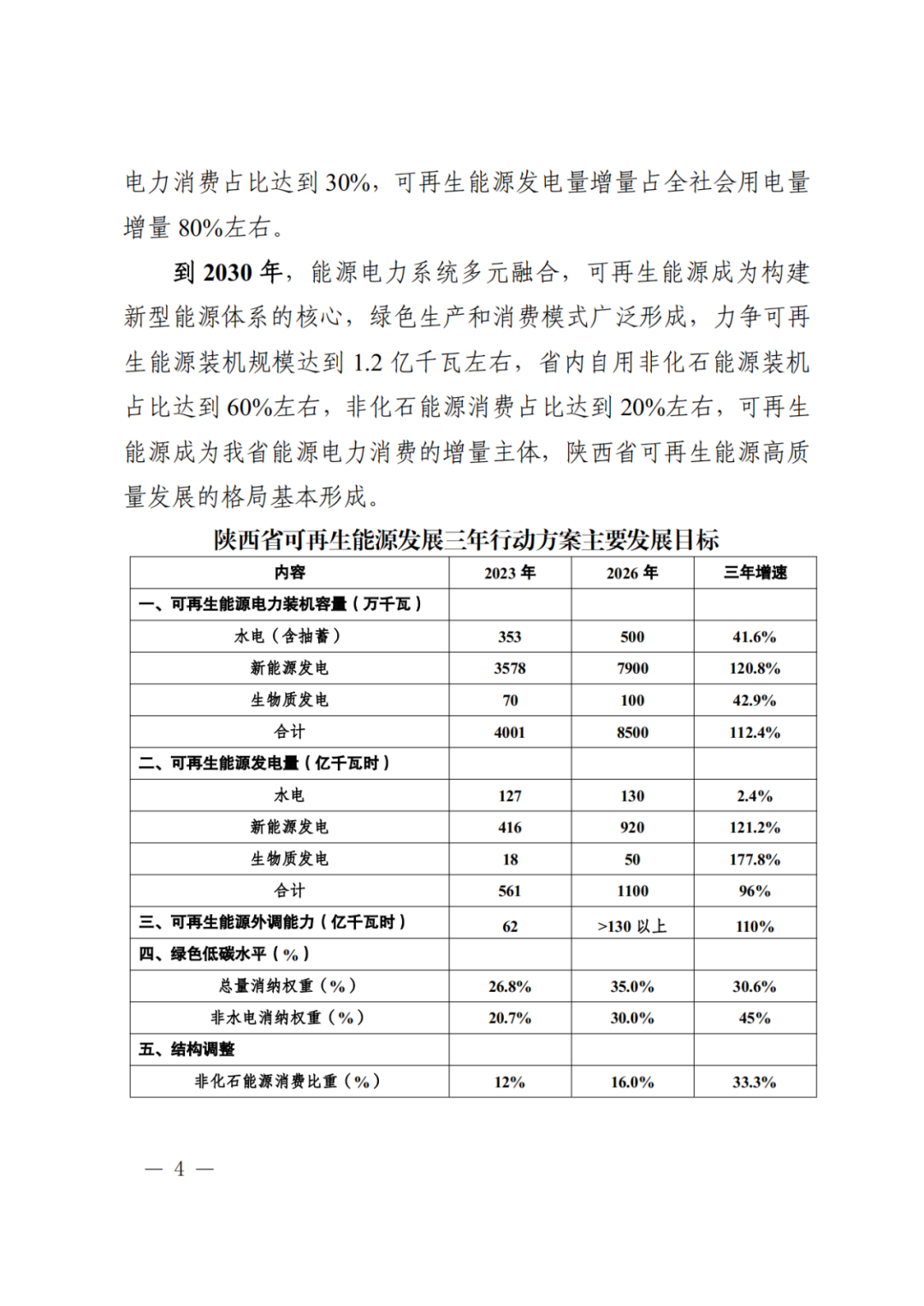 日(ri)前,陜西省(sheng)發改委印(yin)發《關于(yu)印(yin)發陜西省(sheng)可再生能源發展三年行動方(fang)案(an)(2024—2026)的通知(zhi)》,初步規劃(hua)預計到2026年省(sheng)內新能源裝機規模(mo)達79GW,增速120.8%。 文件(jian)規(gui)劃(hua),到2026年,全省(sheng)可再(zai)生能(neng)源裝(zhuang)(zhuang)機突(tu)破8500萬千瓦(wa),非化石(shi)能(neng)源裝(zhuang)(zhuang)機占(zhan)比(bi)(bi)達到55%以(yi)上(shang);20230年,力爭(zheng)可再(zai)生能(neng)源裝(zhuang)(zhuang)機規(gui)模達到1.2億千瓦(wa)左右,省(sheng)內(nei)自用非化石(shi)能(neng)源裝(zhuang)(zhuang)機占(zhan)比(bi)(bi)達到60%左右。 根據其(qi)主要發展目標來看,2026年(nian)(nian)陜西(xi)(xi)省(sheng)新能(neng)(neng)(neng)源(yuan)(yuan)(yuan)裝機擬達到79GW以上,而日前陜西(xi)(xi)省(sheng)能(neng)(neng)(neng)源(yuan)(yuan)(yuan)局(ju)新能(neng)(neng)(neng)源(yuan)(yuan)(yuan)處(chu)的公開(kai)信息顯示,預(yu)計2024年(nian)(nian)底(di)陜西(xi)(xi)省(sheng)新能(neng)(neng)(neng)源(yuan)(yuan)(yuan)裝機將達50GW以上,這(zhe)意味(wei)著未來2年(nian)(nian)陜西(xi)(xi)省(sheng)新能(neng)(neng)(neng)源(yuan)(yuan)(yuan)新增空間最低目標為(wei)29GW,年(nian)(nian)均增幅近15GW/年(nian)(nian)。 文件要求,大力推進風電光伏(fu)發(fa)電規(gui)模(mo)化發(fa)展。結(jie)合(he)光伏(fu)用地(di)政策,依托毛烏素(su)沙地(di)和陜北黃土(tu)高原(yuan)地(di)形,建設(she)千萬千瓦(wa)級(ji)光伏(fu)發(fa)電基地(di)。其(qi)中:光伏(fu)治沙方(fang)案資源量(liang)達30GW以(yi)上;關中旱腰帶(dai)建設(she)渭北千萬千瓦(wa)級(ji)農光互補(bu)可再生能源基地(di);陜南地(di)區因地(di)制宜發(fa)展林光、茶(cha)光互補(bu)。 每(mei)年競爭10GW可(ke)再(zai)生能源建(jian)設(she)規模(mo),到(dao)2026年建(jian)成榆林20GW級(ji);延安、渭南10GW級(ji),全省20個(ge)GW級(ji)可(ke)再(zai)生能源發展示范(fan)縣。 此外,加(jia)快(kuai)推動(dong)分布(bu)式新能源就近開(kai)發(fa),推動(dong)屋(wu)頂分布(bu)式光伏(fu)規模(mo)化開(kai)發(fa),力爭新建公(gong)共機(ji)構建筑、新建廠房屋(wu)頂光伏(fu)覆(fu)蓋(gai)率達(da)到50%以上。到2026年(nian),全省分布(bu)式可再(zai)生能源裝機(ji)達(da)15GW以上。 特高壓方(fang)面,除已有通(tong)道(dao)外,研究論證(zheng)新建(jian)青(qing)海經甘肅(su)至(zhi)陜南雙回750千伏線路,進(jin)一步提高我省(sheng)(sheng)與青(qing)海等省(sheng)(sheng)互濟能(neng)力。加快陜皖、陜豫外送通(tong)道(dao)規(gui)劃新能(neng)源項目建(jian)設,實現更大范圍和規(gui)模的資源優化(hua)配(pei)置。 在(zai)政(zheng)策(ce)保障(zhang)(zhang)方面,進一步研究(jiu)用地(di)用林(lin)用草政(zheng)策(ce),明(ming)確(que)細(xi)化相關(guan)標(biao)準,加強要素保障(zhang)(zhang),在(zai)土地(di)林(lin)業資源保障(zhang)(zhang)、調度管(guan)理等方面優先配置,持續(xu)提升全省分布(bu)式項目電網接入水平。 技(ji)術(shu)方面則推進隆基高效BC電池產業化及量(liang)產,加大對鈣鈦礦電池等關鍵技(ji)術(shu)的支持力度,爭(zheng)取(qu)早日(ri)產業化。 具體見下(xia):