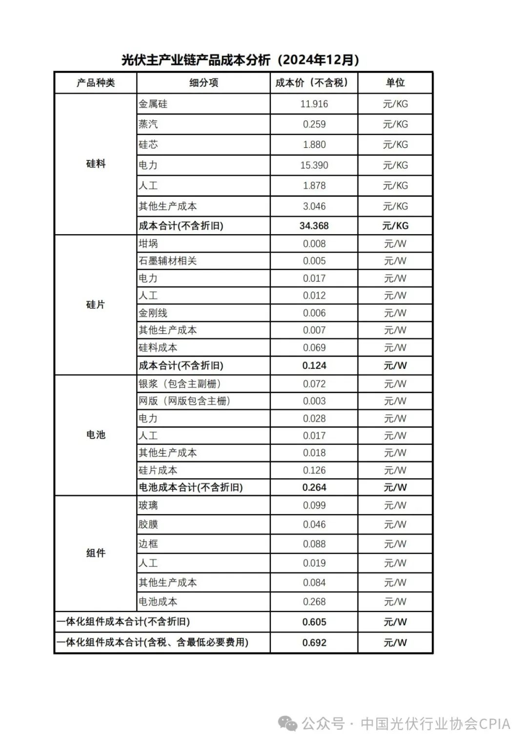 今年以來(lai),光伏組件價(jia)格不斷下滑,招(zhao)投(tou)標市場不斷出(chu)現(xian)超低價(jia)中標案例情況。在行業主管部門指導下,中國光伏行業協會在廣(guang)泛(fan)調研的基(ji)礎上建立成本模型(xing),通過定期(qi)收集(ji)、分析與整理光伏行業成本信息并對外發布(bu),供全行業和政府監管部門參考。 2024年11月(yue)1日,工業和信息化部電(dian)子信息司組織(zhi)召開(kai)成本(ben)(ben)模型(xing)專家論證(zheng)會(hui),邀請國(guo)(guo)家發(fa)展改(gai)革委價格(ge)司、國(guo)(guo)務院國(guo)(guo)資委規(gui)劃局、市場監管(guan)總局價監競爭(zheng)局、國(guo)(guo)家能源局新能源司推薦專家,就(jiu)協(xie)會(hui)提出成本(ben)(ben)模型(xing)測(ce)算的(de)科學性(xing)、合(he)理(li)(li)性(xing)和精準(zhun)性(xing)聽取專家意(yi)見。專家一(yi)致認為,成本(ben)(ben)模型(xing)對成本(ben)(ben)要素進(jin)行了(le)綜合(he)考量,結(jie)構完整,設計合(he)理(li)(li);數據(ju)的(de)收集范圍(wei)具有(you)廣泛(fan)代(dai)表性(xing),體現了(le)先(xian)進(jin)光(guang)伏(fu)產(chan)品(pin)的(de)行業平(ping)均成本(ben)(ben)水平(ping);成本(ben)(ben)數據(ju)的(de)收集及上報,將對主管(guan)部門(men)了(le)解行業情況、加強(qiang)行業管(guan)理(li)(li)提供重要工具;對于(yu)統一(yi)行業認知,抑(yi)制(zhi)光(guang)伏(fu)產(chan)品(pin)低于(yu)成本(ben)(ben)價競爭(zheng)具有(you)重要意(yi)義。 協會已于(yu)2024年(nian)10月(yue)18日、2024年(nian)11月(yue)20日發布了分別(bie)發布了10月(yue)份(fen)、11月(yue)份(fen)的(de)光伏組件成本消息(xi),并呼吁企業(ye)依法(fa)合規(gui)地參與市場(chang)競爭,不要進(jin)行低(di)(di)于(yu)成本的(de)銷(xiao)售與投標,避免(mian)低(di)(di)于(yu)成本投標帶來的(de)產品和服(fu)務質量的(de)下降,保證(zheng)光伏項目的(de)長期與穩(wen)定運(yun)行。 現(xian)(xian)發布2024年(nian)12月光(guang)伏主流產品(N型(xing)M10及G12R)各環(huan)節綜合(he)成本(ben)(ben)數據(ju)。受豐水期結(jie)束,企(qi)業開(kai)工率調整等因素(su)影響,當(dang)前,在(zai)各環(huan)節不(bu)計(ji)折(zhe)舊(jiu),硅(gui)料、硅(gui)片、電(dian)池片環(huan)節不(bu)含增值(zhi)稅的(de)(de)(de)情(qing)況(kuang)(kuang)下(xia),最(zui)終組(zu)件含稅成本(ben)(ben)(含最(zui)低必要費(fei)(fei)(fei)(fei)(fei)用(yong))為(wei)0.692元/W。最(zui)低必要費(fei)(fei)(fei)(fei)(fei)用(yong)為(wei)綜合(he)考(kao)慮(lv)不(bu)同企(qi)業工廠到項(xiang)目地距離不(bu)等、企(qi)業交貨方式存(cun)在(zai)差異、組(zu)件需考(kao)慮(lv)質保(bao)(bao)等因素(su)的(de)(de)(de)費(fei)(fei)(fei)(fei)(fei)用(yong),據(ju)調研(yan)目前組(zu)件運費(fei)(fei)(fei)(fei)(fei)為(wei)0.015元/W/千(qian)公里,且(qie)存(cun)在(zai)運費(fei)(fei)(fei)(fei)(fei)波動情(qing)況(kuang)(kuang),不(bu)同項(xiang)目實(shi)際執行(xing)時,對(dui)運費(fei)(fei)(fei)(fei)(fei)和組(zu)件質保(bao)(bao)要求不(bu)盡相同,該(gai)費(fei)(fei)(fei)(fei)(fei)用(yong)只(zhi)考(kao)慮(lv)最(zui)低情(qing)況(kuang)(kuang)下(xia)的(de)(de)(de)成本(ben)(ben)。考(kao)慮(lv)當(dang)前行(xing)業嚴重供過(guo)于求、企(qi)業為(wei)消化(hua)庫存(cun)正在(zai)極限經(jing)(jing)營的(de)(de)(de)現(xian)(xian)狀(zhuang),上述成本(ben)(ben)測算結(jie)果并未將(jiang)折(zhe)舊(jiu)納入,低于實(shi)際生產成本(ben)(ben),更低于包含三費(fei)(fei)(fei)(fei)(fei)的(de)(de)(de)全成本(ben)(ben);已(yi)經(jing)(jing)是當(dang)前行(xing)業優秀企(qi)業在(zai)保(bao)(bao)證產品質量前提下(xia)的(de)(de)(de)最(zui)低成本(ben)(ben)。 詳細成(cheng)本構成(cheng)如下: