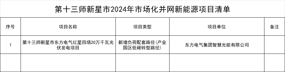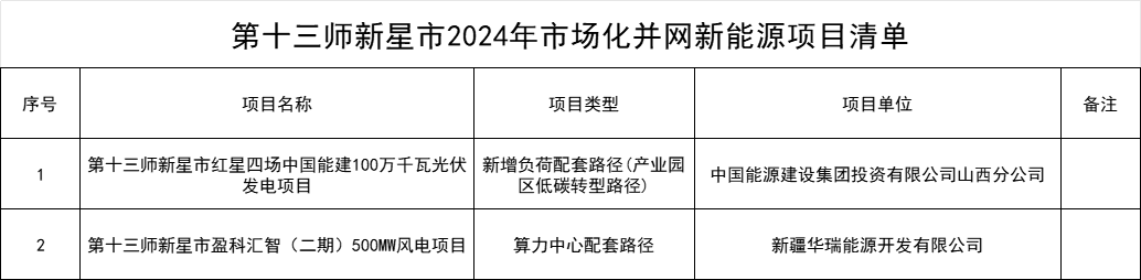 12月20日,新疆兵團第十三師新星市2024年市場化并網新能源項目公示,共有3個項目入選,共包括1.2GW光伏項目、500MW風電項目。 其中,中國能源建設集團投資有限公司山西分公司等單位通過新增負荷配套(產業園區低碳轉型)等路徑申報市場化并網新能源項目2個;東方電氣集團智慧光能有限公司通過新增負荷配套路徑(產業園區低碳轉型路徑)申報市場化并網新能源項目1個,公示期為5個工作日。 項目清單見下:
