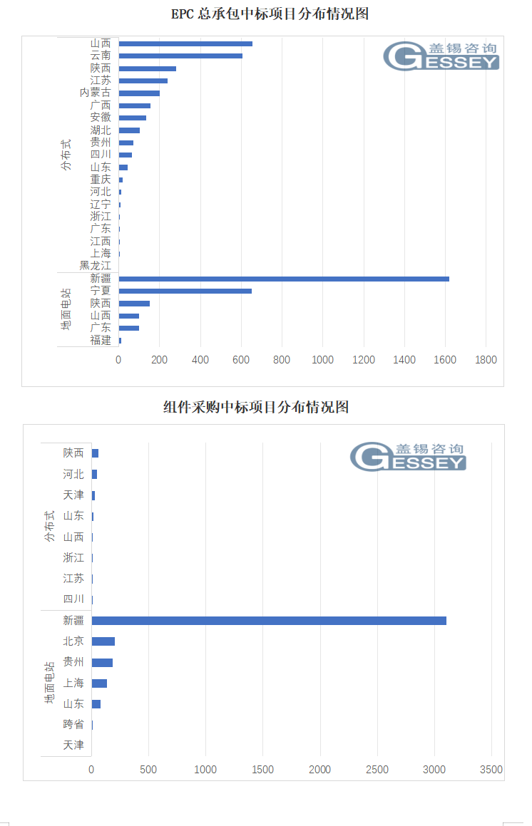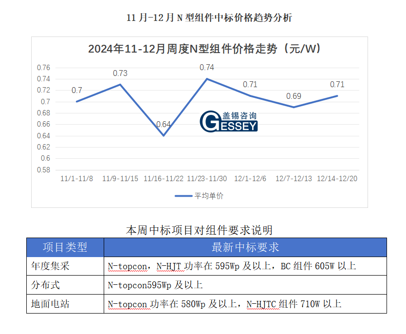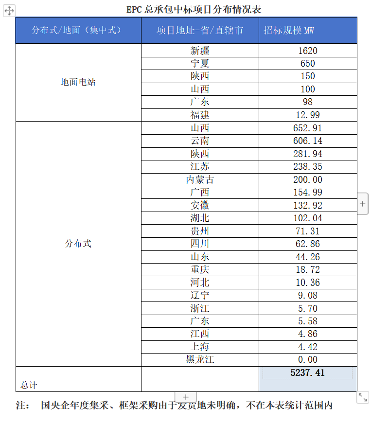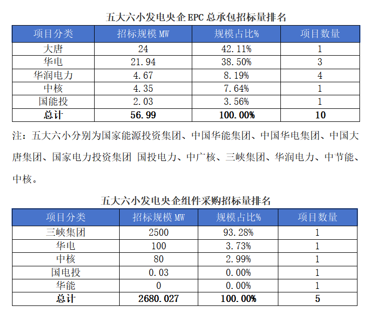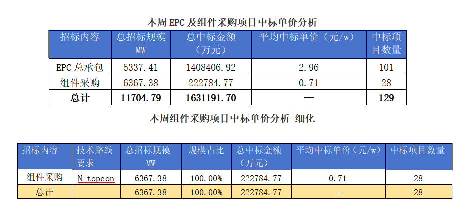 一、光伏項目招標情況匯總: 根據Gessey蓋錫咨詢統(tong)計(ji),12月(yue)14日-12月(yue)20日累計(ji)光伏(fu)招(zhao)標項(xiang)(xiang)目為130個,項(xiang)(xiang)目規(gui)(gui)模合計(ji)為8360.7465 MW。光伏(fu)組件采(cai)購招(zhao)標項(xiang)(xiang)目為21個,招(zhao)標規(gui)(gui)模為6085.6291MW,EPC總承包(bao)招(zhao)標項(xiang)(xiang)目為106個,招(zhao)標規(gui)(gui)模為2275.1174MW。 我(wo)們統(tong)計包含(han)大(da)型央企(qi)國企(qi)、地方(fang)能源集團、地方(fang)政府(fu)機關、兩大(da)電(dian)網、央企(qi)總包企(qi)業(ye)(ye)、知(zhi)名光伏企(qi)業(ye)(ye)等,其中(zhong)五(wu)大(da)六小發電(dian)央企(qi)占(zhan)總招標規模較高,具體各企(qi)業(ye)(ye)排(pai)名如下表(biao): 二、中標項目分布類型匯總情況 本周(zhou)中(zhong)(zhong)標項目需(xu)求按照招標場景地分布(bu),分布(bu)式(shi)光(guang)伏(fu)主(zhu)要集中(zhong)(zhong)在山西、云(yun)南(nan)、陜西等(deng)地區(qu),即主(zhu)要集中(zhong)(zhong)在中(zhong)(zhong)東部地區(qu);集中(zhong)(zhong)式(shi)光(guang)伏(fu)主(zhu)要集中(zhong)(zhong)在寧夏、貴州、陜西、新(xin)疆等(deng)地區(qu),即主(zhu)要集中(zhong)(zhong)在西部地區(qu)。 三、EPC總承包及組件采購情況匯總 本周光伏EPC總承包中標(biao)(biao)規模達5337.41MW,總中標(biao)(biao)金額(e)1408406.92萬元(yuan),平均中標(biao)(biao)單價為2.96元(yuan)/W,中標(biao)(biao)數量(liang)101個。 本周光(guang)伏組件(jian)采購中(zhong)(zhong)標規模(mo)達6367.38 MW,總(zong)中(zhong)(zhong)標金(jin)額222784.77萬(wan)元,平均中(zhong)(zhong)標單價(jia)為0.71元/W,中(zhong)(zhong)標數量28個。 上一篇: 蓋錫咨詢:12月24日光伏行業要聞速覽