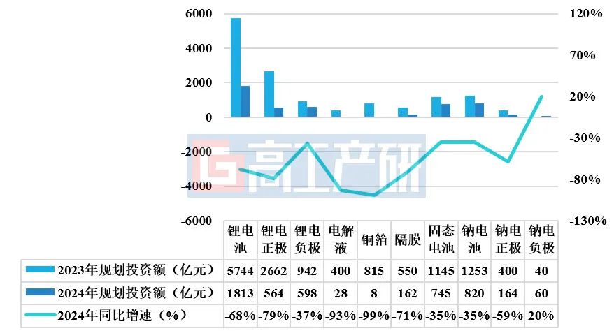 2024年我國鋰電(dian)新能源行業(ye)進(jin)入調整期,投資擴產項目大(da)幅減(jian)少。據高工產業(ye)研究院(GGII)不完全統計,2024年中國鋰電(dian)池(chi)(chi)及(ji)主要材料、鈉電(dian)池(chi)(chi)及(ji)正負極(ji)材料、固態(tai)電(dian)池(chi)(chi)共規劃投資約4960億元,同比(bi)下降64%。具體來(lai)看: 1)鋰電(dian)池方面(mian), 2024年(nian)中國鋰電(dian)池新(xin)增(zeng)規劃項目(含簽約、公(gong)告(gao)、開工,下(xia)同)約60個,較(jiao)2023年(nian)減少37%,規劃產能約590GWh,較(jiao)2023年(nian)下(xia)降近(jin)60%。 按項目公布的投資金額計算,2024年中國鋰電池規劃(hua)投資總額超1800億元(yuan),較(jiao)2023年減少(shao)68%。 2)鋰電池材(cai)(cai)料方面, 2024年中國鋰電池正(zheng)極(ji)材(cai)(cai)料、負極(ji)材(cai)(cai)料、電解液、隔膜、銅箔項目共規劃投資1360億元。 其中銅箔和電解液(ye)規劃(hua)投(tou)資金(jin)額(e)(e)降幅最大,均下降超(chao)90%,主要(yao)因為銅箔加工費低且銅價高、電解液(ye)企業銷售(shou)現金(jin)比率較低;負極(ji)(ji)材(cai)料規劃(hua)投(tou)資金(jin)額(e)(e)降幅最小,為37%,主要(yao)因為46系大圓柱(zhu)電池、半固態電池等(deng)新(xin)產(chan)品(pin)帶(dai)動快充負極(ji)(ji)材(cai)料、硅(gui)基負極(ji)(ji)材(cai)料等(deng)產(chan)品(pin)需(xu)求增長。 3)固(gu)態電池方面, 2024年中國固(gu)態電池新增規(gui)(gui)劃(hua)項(xiang)目約33個,規(gui)(gui)劃(hua)產(chan)能約138GWh,規(gui)(gui)劃(hua)總投資額(e)約745億元,同比下(xia)降35%,降幅低于鋰電池。 4)鈉電(dian)(dian)池(chi)方面, 2024年(nian)中國(guo)鈉電(dian)(dian)池(chi)新(xin)增(zeng)規劃項(xiang)目(mu)約27個,規劃產能(neng)(neng)超180GWh,規劃總投資額超820億(yi)元(yuan),同比(bi)下降35%,其中3個為百億(yi)級投資項(xiang)目(mu),分別為四川鉅能(neng)(neng)儲(chu)能(neng)(neng)呼和浩特50GWh鈉電(dian)(dian)及儲(chu)能(neng)(neng)產業園(yuan)項(xiang)目(mu)(200億(yi)元(yuan))、比(bi)亞迪(徐州)鈉離(li)(li)子電(dian)(dian)池(chi)項(xiang)目(mu)(100億(yi)元(yuan))、湖北荊州經開區普臺能(neng)(neng)源(yuan)科技鈉離(li)(li)子電(dian)(dian)池(chi)一體(ti)化生產項(xiang)目(mu)(超百億(yi)元(yuan))。 5)鈉(na)電(dian)池材(cai)(cai)料方面, 2024年中(zhong)國(guo)鈉(na)電(dian)池正極(ji)(ji)材(cai)(cai)料新增規(gui)劃(hua)(hua)投資金(jin)額約(yue)164億元,同比(bi)(bi)下降59%;規(gui)劃(hua)(hua)產能約(yue)49萬噸,同比(bi)(bi)下降40%;2024年中(zhong)國(guo)鈉(na)電(dian)池負極(ji)(ji)材(cai)(cai)料新增規(gui)劃(hua)(hua)投資金(jin)額約(yue)60億元,同比(bi)(bi)增長(chang)20%,規(gui)劃(hua)(hua)產能約(yue)23萬噸,同比(bi)(bi)增長(chang)22%。其(qi)中(zhong)鈉(na)電(dian)池負極(ji)(ji)材(cai)(cai)料為唯一增長(chang)的環節。 2023-2024年鋰電(dian)池及主要材(cai)料、鈉電(dian)池及正(zheng)負極材(cai)料、固態電(dian)池規劃投資金額匯(hui)總 數據(ju)來(lai)源:高工產(chan)業研究院(GGII),2024年12月(yue) 總(zong)的來看,2024年,國(guo)內鋰(li)電(dian)(dian)池及材料(liao)、固(gu)態電(dian)(dian)池、鈉電(dian)(dian)池及材料(liao)投(tou)資擴產(chan)步伐放緩,但固(gu)態電(dian)(dian)池、鈉電(dian)(dian)池及材料(liao)等(deng)新產(chan)品投(tou)資擴產(chan)仍(reng)相(xiang)較活躍。 展望(wang)2025年(nian),GGII預計鋰電池(chi)(chi)及(ji)材料企業擴(kuo)張(zhang)仍會趨于(yu)謹慎,預計2026年(nian)迎來新一波擴(kuo)張(zhang)周期。2027年(nian),鈉電池(chi)(chi)有望(wang)產業化加(jia)速(出貨量>10GWh),全固(gu)態電池(chi)(chi)有望(wang)實(shi)現小批量生(sheng)產。