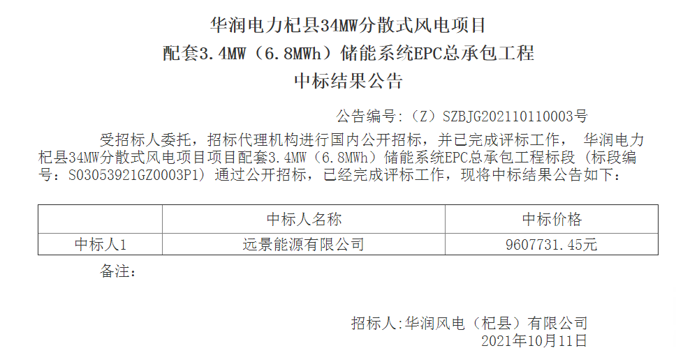 10月11日,華(hua)潤電力杞縣(xian)34MW分散式風電項目(mu)配套3.4MW(6.8MWh)儲能系統EPC總承包(bao)工程公(gong)告發布了中標結果,中標人為遠景能源有限公(gong)司。