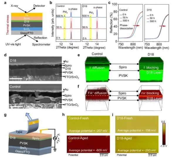 近(jin)日(ri),中國華僑大學的(de)科學家們設計了一種鈣鈦(tai)礦太陽能電池,它利(li)用空穴選擇性(xing)夾層抑制(zhi)離子擴散來提(ti)高(gao)器件(jian)的(de)穩定性(xing)。 離子(zi)(zi)遷移被認(ren)為是鈣鈦礦(kuang)太陽能電池不穩定的(de)關鍵原因。當鈣鈦礦(kuang)薄膜中(zhong)的(de)軟晶(jing)格(ge)和相對較(jiao)弱的(de)鍵導致缺(que)(que)陷的(de)形成能較(jiao)低(di)時,就(jiu)會(hui)發生這種(zhong)情況,因此熱和光很容(rong)易激活鈣鈦礦(kuang)晶(jing)格(ge)內(nei)的(de)離子(zi)(zi)缺(que)(que)陷。離子(zi)(zi)的(de)積累使局部晶(jing)體(ti)結構(gou)變形并(bing)降(jiang)解鈣鈦礦(kuang)膜,包(bao)括(kuo)電子(zi)(zi)傳輸(shu)層 (ETL) 和空穴傳輸(shu)層 (HTL) 以及電極(ji)。 研(yan)究人員解釋說:“在鈣鈦礦(kuang)太陽(yang)能(neng)電(dian)池中加入空穴選擇性(xing)夾層(ceng)(ceng)的(de)想法受到(dao)質(zhi)(zhi)子交換膜 (PEM) 燃料電(dian)池的(de)啟發(fa),其中 PEM 充當質(zhi)(zhi)子導(dao)體(ti),同(tong)時(shi)阻止(zhi)其他(ta)化學物質(zhi)(zhi)的(de)擴散(san)。“設計阻止(zhi)層(ceng)(ceng)間離子擴散(san)的(de)內部屏障對于提高鈣鈦礦(kuang)太陽(yang)能(neng)電(dian)池的(de)使用壽命至關重要(yao)。” 研究小(xiao)組使用一種稱(cheng)為 PDTBT2T-FTBDT (D18) 的(de)超薄聚合物材料(liao)構(gou)建(jian)了(le)空穴選(xuan)擇性(xing)中間(jian)層,據報道,由(you)于其稀釋溶液的(de)高(gao)流動性(xing),該材料(liao)可在鈣鈦礦薄膜表面提供保形覆蓋(gai)。它(ta)還(huan)具有與鈣鈦礦吸收器和(he) Spiro-OmetaD HTL 相(xiang)匹(pi)配的(de)能(neng)級(ji)對齊(qi)功能(neng)。 學(xue)者們(men)通(tong)過在鈣(gai)鈦(tai)(tai)礦(kuang)膜頂部旋涂(tu) D18 的(de)熱(re)氯苯 (CB) 溶液來沉積夾層(ceng)(ceng),據報(bao)道,這導(dao)致(zhi)了致(zhi)密膜的(de)形成。他們(men)用玻璃和(he)摻氟(fu)錫氧化物 (FTO) 制成的(de)襯底(di)、基于氧化錫 (SnO2) 的(de) ETL、鈣(gai)鈦(tai)(tai)礦(kuang)吸收(shou)劑(ji)、D18 中(zhong)間層(ceng)(ceng)、Spiro-OmetaD HTL 和(he)金 (Au) 金屬(shu)觸點構建(jian)了太陽(yang)能電池(chi)。 該(gai)小組評估了夾(jia)層駐留離子擴散的(de)有效性,發(fa)現與(yu)最常用的(de)聚合物(wu) P3HT 和 PTAA 相比,它(ta)提供了卓越的(de)性能。“結(jie)果表(biao)明(ming),D18 層在熱應力(li)(li)下(xia)具有強大的(de)離子阻擋能力(li)(li),”它(ta)進一步(bu)解釋說。“D18 與(yu)鈣(gai)鈦(tai)礦晶(jing)粒和晶(jing)界緊密接觸,提供保形覆蓋。” 建議(yi)的 0.12 厘米2在(zai)標(biao)準照明條件下(xia)對太(tai)陽(yang)能(neng)電池進行了測試,發現其功率(lv)(lv)轉換效率(lv)(lv)為(wei) 26.39%,開路電壓為(wei) 1.185 V,短路電流(liu)為(wei) 26.54 mA cm-2,填充因子為(wei) 83.92%。相(xiang)比(bi)之下(xia),沒(mei)有 D18 層的參考電池的效率(lv)(lv)為(wei) 24.43%,開路電壓為(wei) 1.152 V,短路電流(liu)為(wei) 26.39 mA cm?2,填充因子為(wei) 80.37%。 “我們已經證明,聚合物 D18 夾層的(de)引入可以有效地阻止鈣鈦(tai)礦太陽(yang)能電池內的(de)層間離(li)子擴散(san),同(tong)時保持高(gao)效的(de)空穴傳(chuan)輸,從而顯著提高(gao) n-i-p 電池的(de)穩定(ding)性,認證效率超(chao)過(guo) 26%,”研究人員說(shuo),并指出該電池還能夠在 1,100 小時后保持 95.4% 的(de)初始效率。 他(ta)們還聲稱該設備(bei)是(shi)目前“最穩定(ding)”的鈣鈦礦太陽能電池,具有很高的效率水平。 新電池概念(nian)在(zai)最近發表(biao)在(zai)《自然(ran)通訊》上的研(yan)究“Ultrathin polymer membrane for improved hole extraction and ion blocking in perovskite solar cells”中提出。