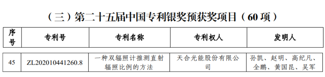 近期,國(guo)家知識(shi)產權局發布(bu)第二(er)十五屆中(zhong)國(guo)專利(li)獎預獲獎名單,天(tian)合光能憑借專利(li)“一種雙輻照(zhao)(zhao)計推(tui)測直射輻照(zhao)(zhao)比例的(de)方法(fa)”榮獲中(zhong)國(guo)專利(li)獎銀(yin)獎,創造了電(dian)池組件制造企業在該級別獎項(xiang)評選的(de)最(zui)佳成(cheng)績,也成(cheng)為光伏行業今年唯一獲此(ci)殊榮的(de)企業。 中國(guo)專(zhuan)(zhuan)利金銀獎作為(wei)國(guo)內專(zhuan)(zhuan)利領域的最高榮譽,是(shi)對企(qi)(qi)業自主創新能力(li)、知識產權保護與(yu)運用水平(ping)的全方位、高規格認可(ke)(ke)。斬獲中國(guo)專(zhuan)(zhuan)利銀獎,不僅是(shi)對企(qi)(qi)業創新實(shi)力(li)的認可(ke)(ke),也代表著(zhu)企(qi)(qi)業已(yi)扛起行(xing)業領航大旗,驅動行(xing)業智能化轉型(xing),為(wei)產業升級、科技進步筑牢(lao)根基。 天合光能(neng)高度重(zhong)視創新成果的保護與運用,截至目前(qian),已在全球(qiu)累計申請專(zhuan)利超過6000件(jian),獲得超過3000件(jian)專(zhuan)利授(shou)權,專(zhuan)利擁(yong)有量處于(yu)行業領先地位。 天合光能(neng)(neng)始終以創(chuang)新(xin)引(yin)領作為第一(yi)發(fa)(fa)展戰略(lve)和核心驅動力量,依托光伏(fu)科(ke)學與技(ji)(ji)術(shu)全國重點實驗室為載(zai)體,聚焦面向(xiang)新(xin)一(yi)代(dai)光伏(fu)技(ji)(ji)術(shu)的(de)(de)基礎性研究、前沿性研究和專題(ti)研究,截(jie)至目前,天合光能(neng)(neng)30次(ci)創(chuang)造(zao)和刷新(xin)世界紀(ji)錄,累計研發(fa)(fa)投入近300億(yi)元(yuan),并積極(ji)推動創(chuang)新(xin)成果在產業(ye)中(zhong)的(de)(de)廣(guang)泛應用。同時(shi),積極(ji)促(cu)進(jin)知識(shi)產權(quan)資源的(de)(de)共享與整合,推動行業(ye)整體的(de)(de)知識(shi)產權(quan)保護水平提升(sheng),營造(zao)全社會保護創(chuang)新(xin)的(de)(de)良好氛圍,真(zhen)正構建起技(ji)(ji)術(shu)研發(fa)(fa)、知識(shi)產權(quan)、行業(ye)標準三位(wei)一(yi)體相互協同、高質量發(fa)(fa)展的(de)(de)體系(xi)。