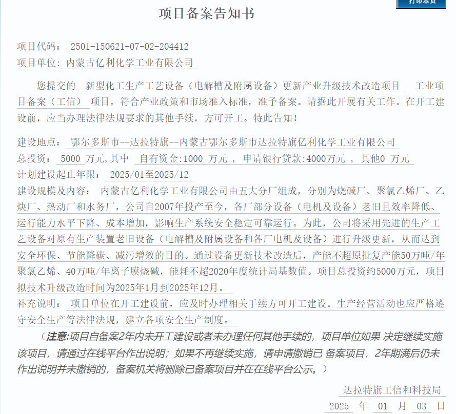 1月3日,內蒙古投資項目在線審批辦事大廳發布信息,內蒙古億利化學工業有限公司提交的新型化工生產工藝設備(電解槽及附屬設備)更新產業升級技術改造項目,符合產業政策和市場準入標準,準予備案。 建設地點:鄂爾多斯市--達拉特旗--內蒙古鄂爾多斯市達拉特旗億利化學工業有限公司總投資:5000萬元,其中 自有資金:1000 萬元 , 申請銀行貸款:4000萬元 , 其他0 萬元計劃建設起止年限:2025/01至 建設規模及內容:內蒙古億利化學工業有限公司由五大分廠組成,分別為燒堿廠、聚氯乙烯廠、乙炔廠、熱動廠和水務廠,公司自2007年投產至今,各廠部分設備(電機及設備)老舊且效率降低、運行能力水平下降、成本增加,影響生產系統安全穩定可靠運行。為此,公司將采用先進的生產工藝設備對原有生產裝置老舊設備(電解槽及附屬設備和各廠電機及設備)進行升級更新,從而達到安全環保、節能降碳、減污增效的目的。通過設備更新技術改造后,產能不超原批復產能50萬噸/年聚氯乙烯、40萬噸/年離子膜燒堿,能耗不超2020年度統計局基數值。項目總投資約5000萬元,項目擬技術升級改造時間為2025年1月到2025年12月。 上一篇: 總投70.66億丨光電制氫耦合項目公示