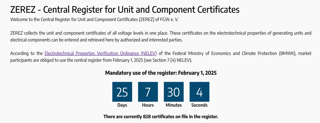 如何進行ZEREZ注冊 1、認證機構上傳證書 在ZEREZ平臺上,認證機構(包括設備制造商)負責上傳相關證書。每個注冊的證書將獲得一個唯一的注冊號(ZEREZ-ID)。 2、證書查詢與驗證 電網運營商可以通過ZEREZ-ID查詢設備是否符合技術要求。對于用戶來說,只需向電網運營商提供ZEREZ-ID即可,無需再回答繁瑣的認證問題。 3、公開數據與隱私保護 低壓和中壓系統的基本數據將在ZEREZ平臺上公開,供所有注冊用戶查詢。其他更高壓等級的設備數據則僅對注冊用戶開放。 FGW將在2025年1月15日舉辦網絡研討會,為行業從業者提供培訓和指導。考慮到外鏈可能引發的限流風險,網絡研討會和ZEREZ網址,可聯系小助理獲取。 市場覆蓋現狀與挑戰 截至2025年1月6日,ZEREZ系統已注冊了828個證書,但市場尚未完全覆蓋。電網運營商中只有大約三分之一的公司完成了在ZEREZ平臺的注冊,仍有部分地區和企業需要進一步推進注冊工作。 作為新能源從業者,必須在2025年2月1日之前完成系統組件的注冊,以確保設備能夠順利并網。光儲星球建議所有光伏系統的制造商、安裝商和運營商,盡快了解ZEREZ的相關要求,并完成注冊,避免不必要的延誤。