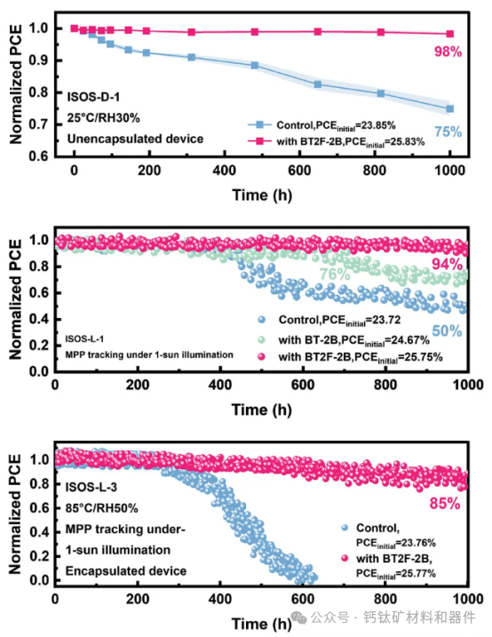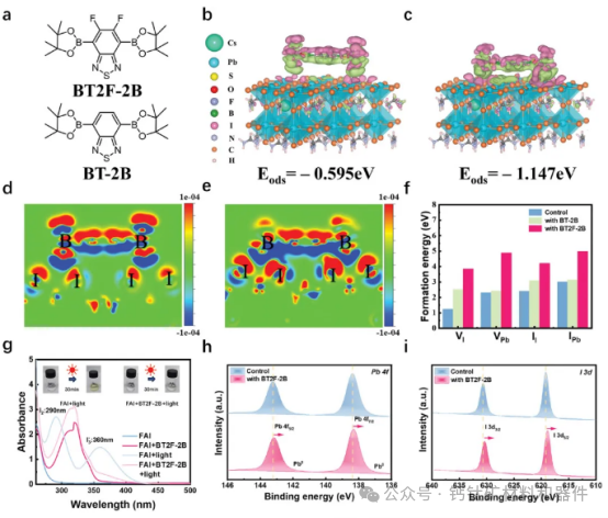 中國科學院(CAS)研究人員認為,鈣鈦礦太陽(yang)能電池(PSCs)的(de)不(bu)穩(wen)定性問題主要源(yuan)于鹵化(hua)物離(li)子(zi)的(de)遷移,尤其是(shi)碘離(li)子(zi)(I?)遷移。在(zai)光(guang)照和(he)(he)熱應力下,碘離(li)子(zi)遷移并轉(zhuan)換為碘分(fen)子(zi)(I2),導致(zhi)不(bu)可逆的(de)器(qi)件(jian)降級和(he)(he)性能損(sun)失(shi)。 為(wei)了應對這一挑戰(zhan),研(yan)究(jiu)團(tuan)隊在鈣鈦礦中引入了添(tian)加劑2,1,3-苯并噻二唑,5,6-二氟-4,7-雙(4,4,5,5-四甲基-1,3,2-二氧雜(za)硼(peng)烷-2-基)(BT2F-2B),來自碘(dian)離子(zi)的未雜(za)化(hua)p 軌道(dao)電子(zi)和孤對電子(zi)之(zhi)間(jian)的強(qiang)配位會(hui)抑(yi)制MAI/FAI的去(qu)質(zhi)子(zi)化(hua)和隨(sui)后的碘(dian)離子(zi)還原轉(zhuan)化(hua)為(wei)碘(dian)分(fen)(fen)子(zi),同(tong)時高電負性氟增強(qiang)了其與(yu)碘(dian)離子(zi)的靜電相(xiang)互作(zuo)用(yong)(yong),因此,BT2F-2B的協同(tong)作(zuo)用(yong)(yong)有效(xiao)抑(yi)制了鈣鈦礦的分(fen)(fen)解和碘(dian)化(hua)物(wu)空(kong)位的缺陷(xian)密度,最終將改(gai)善器件性能。 據該團隊稱,這種方法為倒置單借PSCs提(ti)(ti)供了超過26%的(de)(de)轉換效(xiao)率(lv)(PCE),并具有出(chu)色(se)的(de)(de)操(cao)作穩定性。根據ISOS-L-3測試方案(在(zai)85 °C和50%相對(dui)濕度下的(de)(de)最大(da)功率(lv)點跟蹤),處理過的(de)(de)PSCs在(zai)老化1000小時(shi)后仍保留(liu)其85%的(de)(de)原始效(xiao)率(lv)。當(dang)BT2F-2B 應用于寬帶隙(1.77 eV)鈣鈦礦(kuang)系統時(shi),全鈣鈦礦(kuang)疊層太陽能電池的(de)(de)PCE達到27.8%,證(zheng)實了所提(ti)(ti)策略的(de)(de)普遍性。