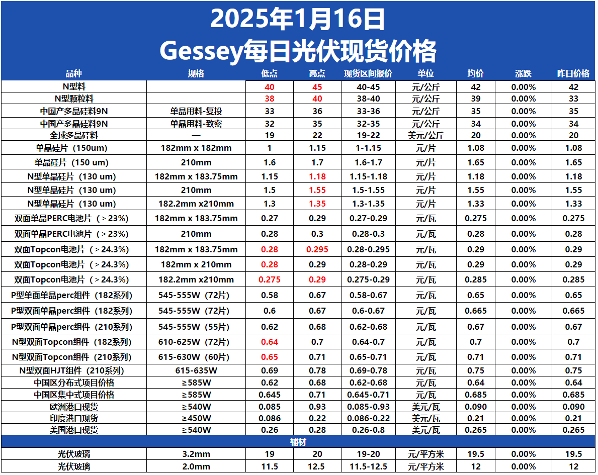 Gessey:1月16日每日光伏市場行情2025-01-16 18:38來源:gessey瀏覽數:2881次