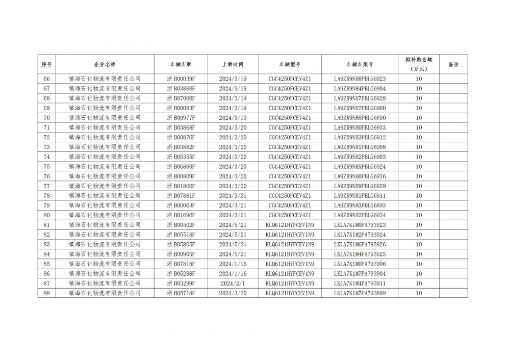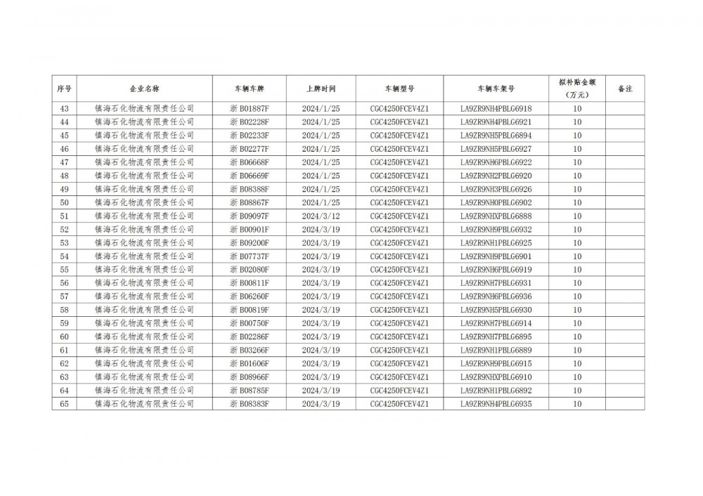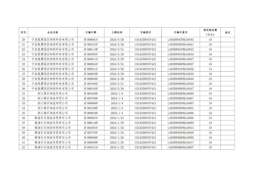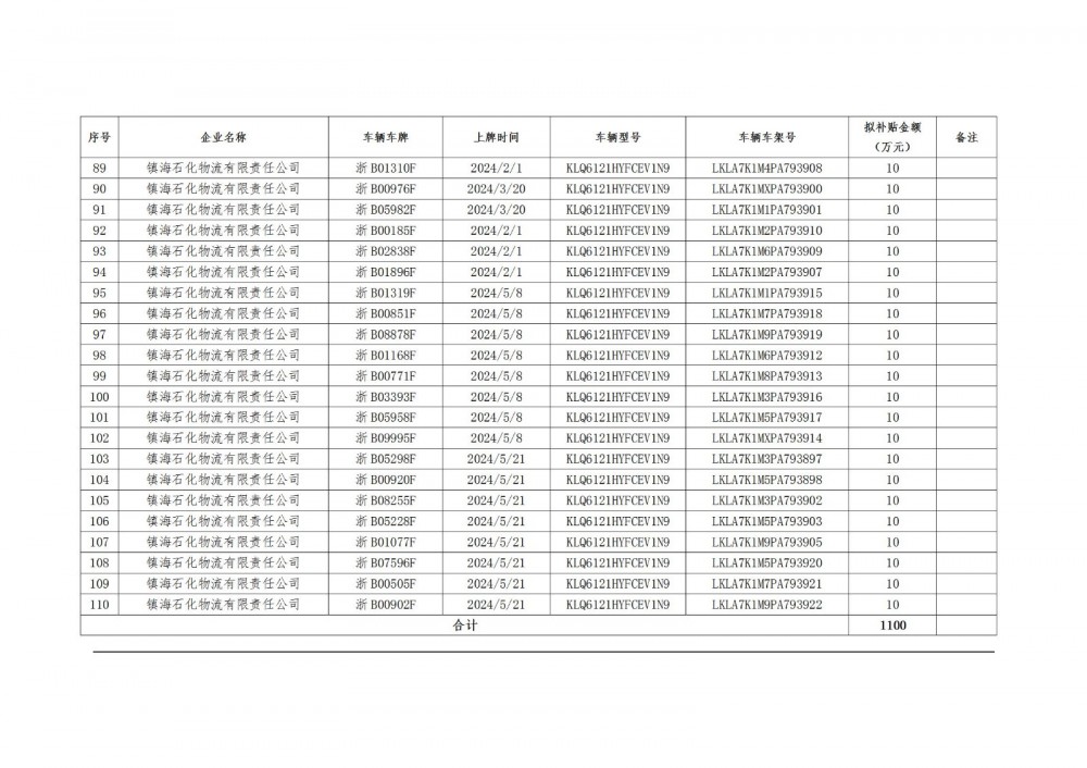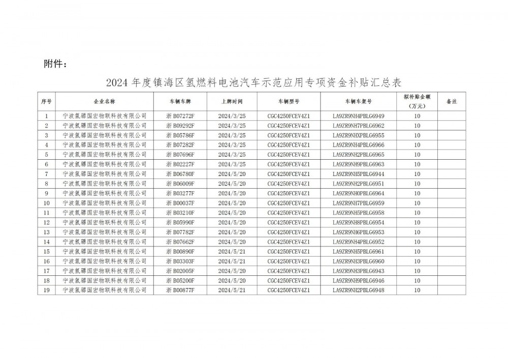 1月17日,寧波市鎮海區(qu)發布《關于(yu)2024年度(du)鎮海區(qu)氫(qing)燃料電池汽(qi)車示范應用(yong)專項資金補(bu)貼情況公示》。 根(gen)據公(gong)示(shi),寧波鎮海區2024年度擬發放的資金補(bu)貼為1100萬,共有110輛氫(qing)燃料電池汽(qi)車享受補(bu)助(zhu),主要由三家車輛運(yun)營(ying)公(gong)司分享。 原文如下: 關于2024年度鎮海區氫燃料電池汽車示范應用專項資金補貼情況公示 根(gen)據《關于(yu)印發(fa)鎮(zhen)海區(qu)(qu)支持制造業領域高質量發(fa)展政(zheng)策的通(tong)知(zhi)》(鎮(zhen)政(zheng)辦(ban)發(fa)〔2024〕38號)、《關于(yu)印發(fa)〈鎮(zhen)海區(qu)(qu)氫燃(ran)料電(dian)池汽(qi)車示(shi)(shi)范應用專項資(zi)金管理(li)辦(ban)法〉的通(tong)知(zhi)》(鎮(zhen)發(fa)改(gai)〔2024〕205號)等(deng)文(wen)件(jian)精神(shen),經企業自主申報,通(tong)過區(qu)(qu)發(fa)改(gai)局、區(qu)(qu)財(cai)政(zheng)局等(deng)相關部門(men)認定,現將2024年度擬發(fa)放的資(zi)金補(bu)貼進(jin)行(xing)公示(shi)(shi)(見附件(jian)),此次公示(shi)(shi)期限從2025年1月(yue)(yue)17日(ri)至(zhi)1月(yue)(yue)23日(ri)止。在公示(shi)(shi)期內,如對公示(shi)(shi)信(xin)(xin)息有(you)異議,可來(lai)(lai)(lai)(lai)(lai)人(ren)、來(lai)(lai)(lai)(lai)(lai)信(xin)(xin)、來(lai)(lai)(lai)(lai)(lai)電(dian)在向區(qu)(qu)發(fa)改(gai)局反映[聯系(xi)電(dian)話(hua):89287357;通(tong)訊地址:鎮(zhen)海區(qu)(qu)發(fa)展和改(gai)革局(駱駝街道民和路(lu)569號行(xing)政(zheng)中心D1-109室),郵(you)編:315200];節假日(ri)暫(zan)不(bu)受理(li)來(lai)(lai)(lai)(lai)(lai)人(ren)、來(lai)(lai)(lai)(lai)(lai)電(dian)反映。為(wei)便于(yu)調查核實(shi),反映情況要(yao)實(shi)事求是,真實(shi)準確,有(you)明確的內容。來(lai)(lai)(lai)(lai)(lai)信(xin)(xin)請署名,來(lai)(lai)(lai)(lai)(lai)電(dian)請說明真實(shi)身份及聯系(xi)電(dian)話(hua),我(wo)們將做好保密工(gong)作。 附件:2024年(nian)度鎮(zhen)海區氫燃料(liao)電池汽車(che)示范應用專項(xiang)資金補貼匯總表(biao).doc寧波市(shi)鎮(zhen)海區發展(zhan)和改革(ge)局(ju) 2025年1月17日