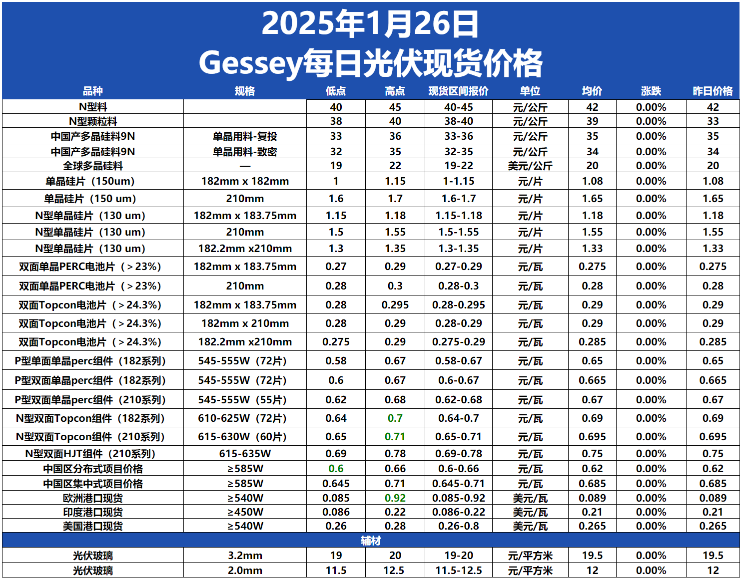 Gessey:1月26日每日光伏市場行情2025-01-26 16:51來源:gessey瀏覽數:364次