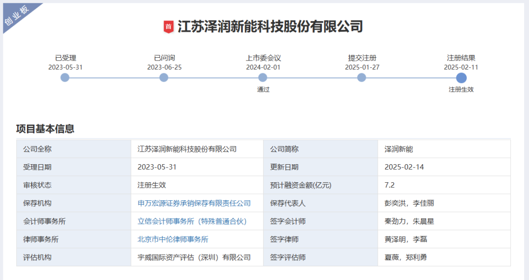 2月14日,中國證監會發布《關于同意江蘇澤潤新能科技股份有限公司首次公開發行股票注冊的批復》,深交所官網顯示已注冊生效。 招股書顯示,澤潤新能是一家專注于新能源電氣連接、保護和智能化技術領域,專業提供光伏組件接線盒產品一體化解決方案的高新技術企業及國家級專精特新“小巨人”企業。 本次澤潤新能擬在深交所創業板上市,IPO保薦機構為申萬宏源證券,擬公開發行普通股1,596.6956萬股,占發行后總股本的25.00%,本次募集資金扣除發行費用后擬全部用于公司主營業務相關的項目,具體情況如下: 根據公告,光伏組件通用及智能接線盒擴產項目方面,報告期內公司光伏組件接線盒業務收入高速增長,隨著公司Z8C、Z8X等產品的逐步推廣,公司產能已趨于緊張。未來,隨著下游光伏行業的高速發展,公司亟需擴張Z8C、Z8X等產品的產能;在智能接線盒領域,隨著對于電路安全性要求更高的分布式光伏的推廣,智能接線盒的市場需求預計將迎來增長,公司緊隨市場發展趨勢,擴張智能接線盒的產能,搶占市場增量空間,因此進一步擴充光伏組件接線盒產品的產能具有合理性。 上一篇: 山東東營公示2月電網可開放容量信息
