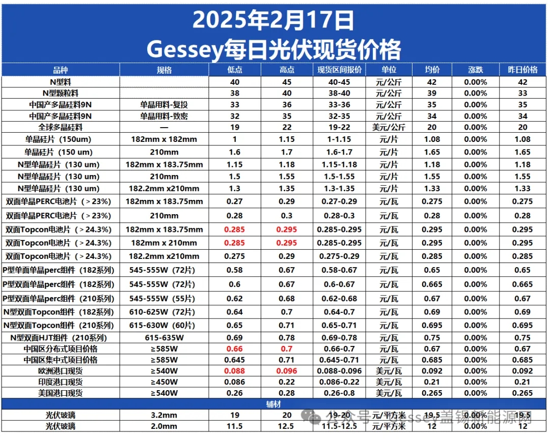 Gessey:2月17日每日光伏市場行情2025-02-17 18:32來源:gessey瀏覽數:368次