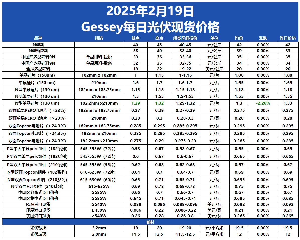Gessey:2月19日每日光伏市場行情2025-02-19 19:16瀏覽數:195次