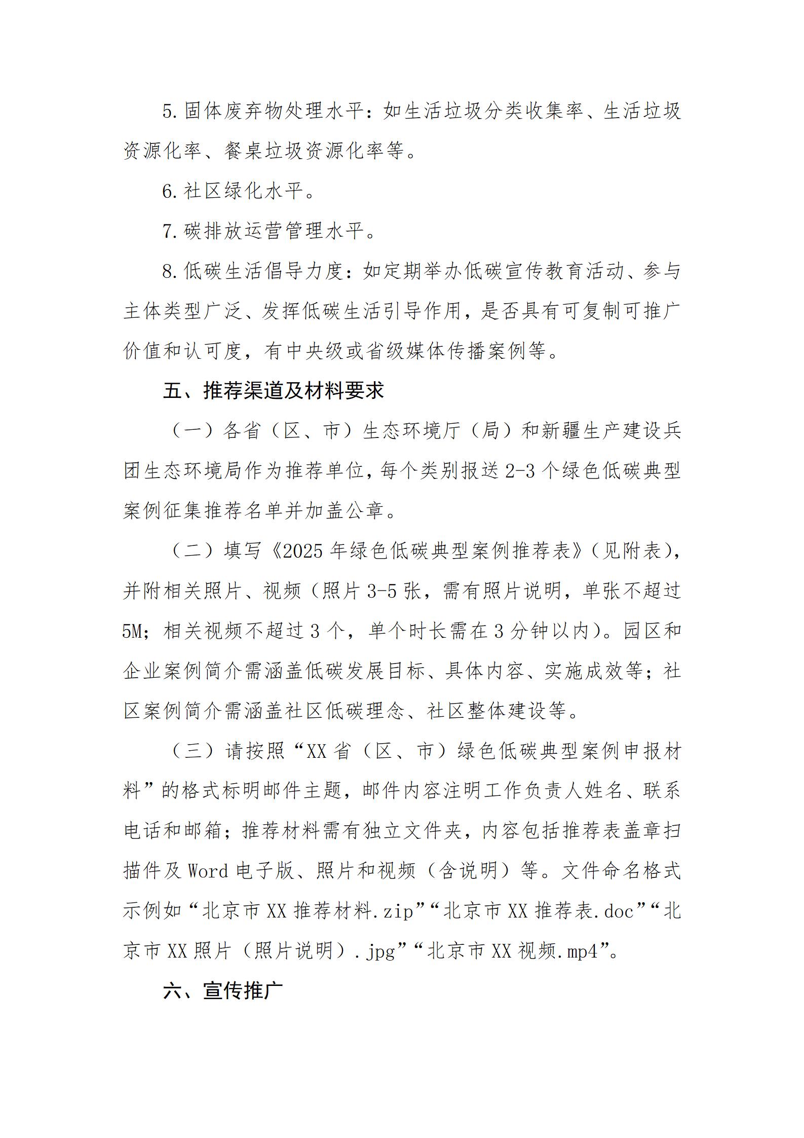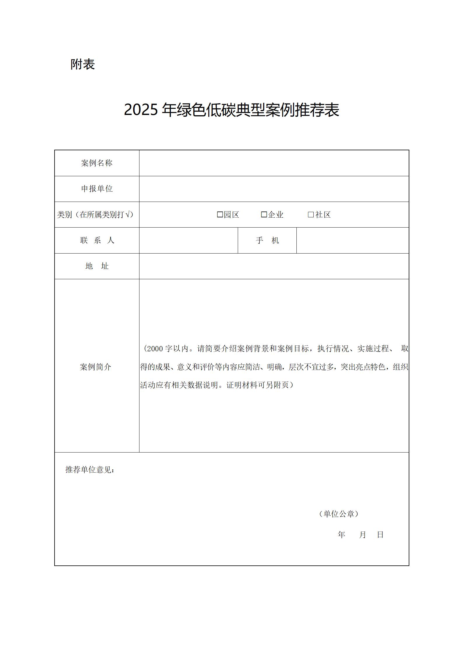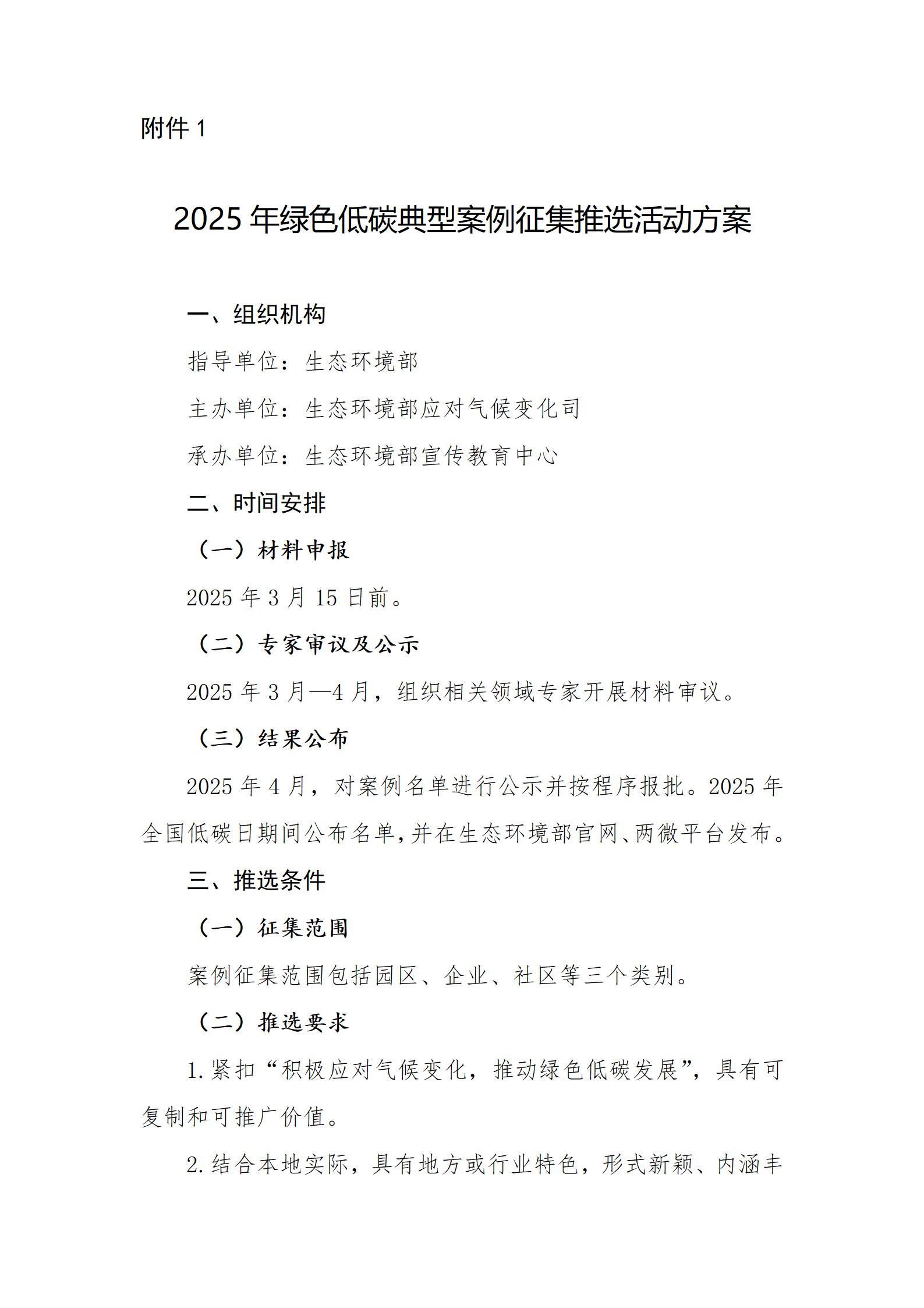 2月19日,生態環境部發布關于開展2025年綠色低碳典型案例征集活動的通知,通知指出,能源利用水平、能源管理水平成為園區、社區與企業參與評審的重要參考標準之一。 原文如下: 關于開展2025年綠色低碳典型案例征集活動的通知 各省、自治區、直轄市生態環境廳(局),新疆生產建設兵團生態環境局: 為深入貫徹習近平生態文明思想,進一步促進全社會提升綠色低碳意識,倡導簡約適度、綠色低碳、文明健康的生活方式,生態環境部自2021年起持續開展系列典型案例征集活動,征集包括園區、企業、社區等三個類別的綠色低碳典型案例,以及面向公眾開展宣講、體驗或實踐活動的綠色低碳公眾參與實踐基地案例。系列典型案例名單將在生態環境部官網、兩微發布,生態環境部將選取典型經驗宣傳推廣,倡導社會各界踐行綠色低碳發展理念。 現將《2025年綠色低碳典型案例征集推選活動方案》《2025年綠色低碳公眾參與實踐基地案例推選活動方案》印發給你們,請認真做好組織動員工作,并按方案要求報送相關材料。 附件:1.2025年綠色低碳典型案例征集推選活動方案 2.2025年綠色低碳公眾參與實踐基地案例推選活動方案 生態環境部辦公廳 2025年2月13日 上一篇: 德國:累計光伏裝機量突破100GW