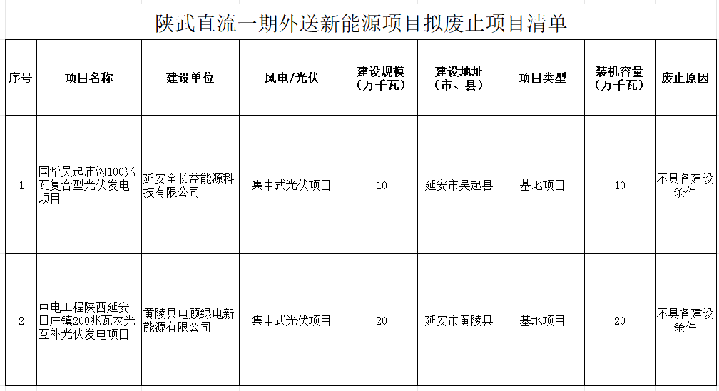 2月24日,陜西延安市發展和改革委員會發布關于陜武直流一期外送新能源項目擬廢止項目的公示,擬對國華吳起廟溝100兆瓦復合型光伏發電項目、中電工程陜西延安田莊鎮200兆瓦農光互補光伏發電項目進行廢止。 據統計,此前陜西咸陽市、渭南、安康市、榆林市、漢中市陸續對1.24GW新能源保障性并網項目予以廢止(調減),截至目前陜西共有1.54GW新能源項目被廢止(調減)。 詳情如下: 關于陜武直流一期外送新能源項目擬廢止項目的公示 根據省發改委《關于梳理陜西省2021—2023年度保障性項目及基地項目廢止清單的通知》(陜發改能新能源﹝2025﹞36號)要求,經梳理,擬對國華吳起廟溝100兆瓦復合型光伏發電項目、中電工程陜西延安田莊鎮200兆瓦農光互補光伏發電項目進行廢止,現予以公示,如有異議,請在公示期內以書面形式實名反映。 公示時間:2025年2月25日至2025年3月3日 聯系電話:0911-7090220,地址:延安市新區為民服務中心綜合樓220室。 延安市發展和改革委員會 2025年2月24日