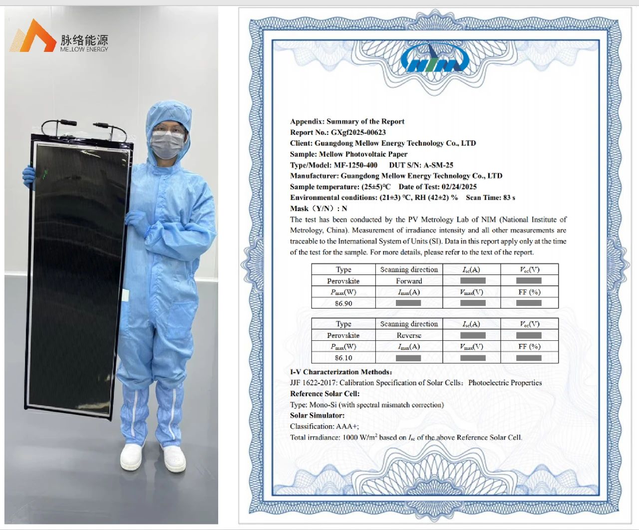 近日,脈(mo)絡能(neng)源在柔(rou)(rou)性鈣鈦(tai)礦(kuang)光(guang)伏組(zu)(zu)件(jian)(jian)量產技術開發(fa)方面取(qu)得(de)重大突破,一(yi)(yi)體化成型的(de)(de)柔(rou)(rou)性鈣鈦(tai)礦(kuang)光(guang)伏組(zu)(zu)件(jian)(jian)產品——素(su)箋系列,經中(zhong)國計(ji)量院認證(zheng),輸出(chu)功率達(da)86.90W,效(xiao)(xiao)率高達(da)17.38%(組(zu)(zu)件(jian)(jian)面積0.5m2),正反(fan)掃無(wu)遲滯(zhi),MPPT測試300秒幾乎無(wu)衰減,是當前已知全球(qiu)認證(zheng)效(xiao)(xiao)率最(zui)高的(de)(de)大面積柔(rou)(rou)性鈣鈦(tai)礦(kuang)光(guang)伏產品。這里需要指出(chu)的(de)(de)是,該組(zu)(zu)件(jian)(jian)通過一(yi)(yi)體化成型技術生產,無(wu)須拼接,外(wai)表(biao)美(mei)觀,可靠性高。 此前,脈(mo)絡能源已成功(gong)實現1.2x1.6m2一體化(hua)成型柔(rou)性(xing)組(zu)件(jian)制備技術的開發。此次高效率素箋系列產品(pin)的認證,預示(shi)著(zhu)脈(mo)絡能源將(jiang)可以(yi)為市場提供不同尺寸的柔(rou)性(xing)和弱光鈣鈦礦光伏組(zu)件(jian)產品(pin)。 上一篇: 蓋錫咨詢:2月26日光伏行業要聞速覽
