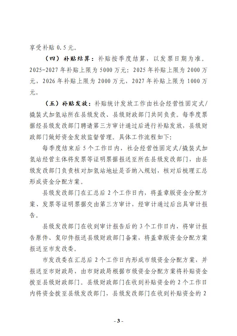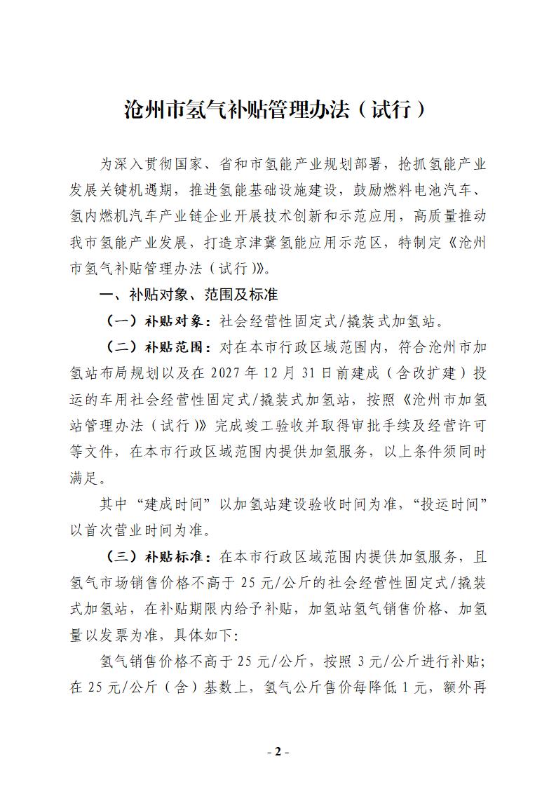 2025年(nian)2月18日(ri),滄州市發改委(wei)在官網發布(bu)了《滄州市氫氣補(bu)貼管(guan)理辦法(fa)(試行)》(以下簡稱《辦法(fa)》)。 根據辦法,滄州市(shi)將(jiang)對在(zai)行政(zheng)區域范圍內提(ti)供加(jia)氫服務,且氫氣市(shi)場銷售(shou)價格(ge)不高于 25 元/公斤的社會經(jing)營性(xing)固(gu)定式/撬裝式加(jia)氫站,在(zai)補貼期限內給予補貼,加(jia)氫站氫氣銷售(shou)價格(ge)、加(jia)氫量以發(fa)票為準,具體如下: 氫氣銷售價格不高于25 元/公斤,按照3元/公斤進行補貼;在25 元/公斤(含)基數上,氣公斤售價每降低1元,額外再享受補貼 0.5 元。 補貼按季度結算,以發票日期為準2025-2027年補貼上限為5000萬元:2025年補貼上限為2000萬元,2026年補貼上限為2000萬元,2027年補貼上限為1000萬元。 原文如下: