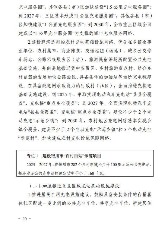 2月12日,寧夏銀川市(shi)人民政府發(fa)布(bu)《銀川市(shi)電(dian)動汽車充(chong)電(dian)基礎設施發(fa)展規劃(2025—2030年)》。其中提出,形成(cheng)“風光儲充(chong)”一體化能源(yuan)(yuan)網絡(luo)。構(gou)建以(yi)充(chong)電(dian)站為(wei)中心,風光儲充(chong)互補的能源(yuan)(yuan)網絡(luo),實(shi)現區域全覆蓋(gai),提升充(chong)電(dian)效率,保障綠色能源(yuan)(yuan)供應。 鼓勵在(zai)現(xian)有(you)集中式(shi)風電(dian)場、光伏電(dian)站、儲能電(dian)站等所在(zai)鎮村(cun)投資建設充換(huan)電(dian)基礎設施,在(zai)分布(bu)式(shi)光伏、分散式(shi)風電(dian)項(xiang)目中一(yi)體化(hua)建設農村(cun)充換(huan)電(dian)基礎設施,促進綠電(dian)就地消納,實(shi)現(xian)有(you)綠電(dian)的地方有(you)“綠樁”。 鼓勵(li)開展電動汽車與電網雙向(xiang)互(hu)動(V2G)、光儲充協同控制(zhi)等關鍵技術研究(jiu),探(tan)索在(zai)充電樁利用率較(jiao)低(di)的農村地區,建(jian)設(she)提供(gong)光伏發電、儲能、充電一體(ti)化(hua)的充電基(ji)礎設(she)施。 至2030年,全市(shi)力(li)(li)爭建成(cheng)各類公用及專用充(chong)電槍12000個(ge),充(chong)電站(zhan)1000座。全市(shi)建成(cheng)超(chao)級充(chong)電站(zhan)5座,全面形成(cheng)城市(shi)超(chao)充(chong)服務體系,實現源(yuan)網荷儲互動、多(duo)能(neng)協同互補,著力(li)(li)提升能(neng)源(yuan)系統效率。 鼓勵(li)推(tui)廣智能(neng)(neng)(neng)有(you)(you)序充電(dian)(dian)(dian)。綜合運用(yong)政策(ce)和經濟(ji)手段(duan),實現(xian)智能(neng)(neng)(neng)有(you)(you)序充電(dian)(dian)(dian),提(ti)高電(dian)(dian)(dian)網(wang)調峰(feng)和安全應(ying)急等響(xiang)應(ying)能(neng)(neng)(neng)力。落實充電(dian)(dian)(dian)設(she)施峰(feng)谷電(dian)(dian)(dian)價政策(ce),發揮電(dian)(dian)(dian)動(dong)(dong)汽車(che)(che)動(dong)(dong)態儲備(bei)特性(xing),探(tan)(tan)索電(dian)(dian)(dian)動(dong)(dong)汽車(che)(che)通(tong)過普通(tong)直接交易、負(fu)荷(he)聚合參與(yu)電(dian)(dian)(dian)網(wang)輔助服務和需(xu)求側(ce)響(xiang)應(ying)。探(tan)(tan)索建立源(yuan)荷(he)互動(dong)(dong)的(de)電(dian)(dian)(dian)力市場交易機制,打通(tong)包含(han)負(fu)荷(he)聚合商的(de)紅利傳導渠道。鼓勵(li)將智能(neng)(neng)(neng)有(you)(you)序充電(dian)(dian)(dian)納入充電(dian)(dian)(dian)樁(zhuang)和電(dian)(dian)(dian)動(dong)(dong)汽車(che)(che)產品功能(neng)(neng)(neng)范圍(wei),鼓勵(li)新增公(gong)共充電(dian)(dian)(dian)樁(zhuang)和隨車(che)(che)配送自用(yong)充電(dian)(dian)(dian)樁(zhuang)具備(bei)智能(neng)(neng)(neng)充電(dian)(dian)(dian)功能(neng)(neng)(neng)。積極探(tan)(tan)索共享充電(dian)(dian)(dian)模式,鼓勵(li)私樁(zhuang)公(gong)用(yong),通(tong)過智能(neng)(neng)(neng)平臺的(de)管(guan)理和調度,使私人充電(dian)(dian)(dian)樁(zhuang)在閑置時(shi)段(duan)對外開放,從而(er)提(ti)高充電(dian)(dian)(dian)設(she)施的(de)利用(yong)率(lv)。 以下為政策原文: