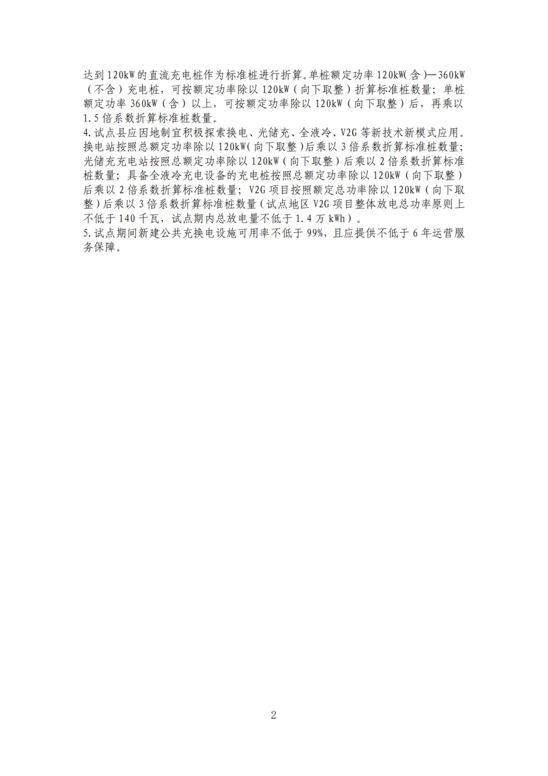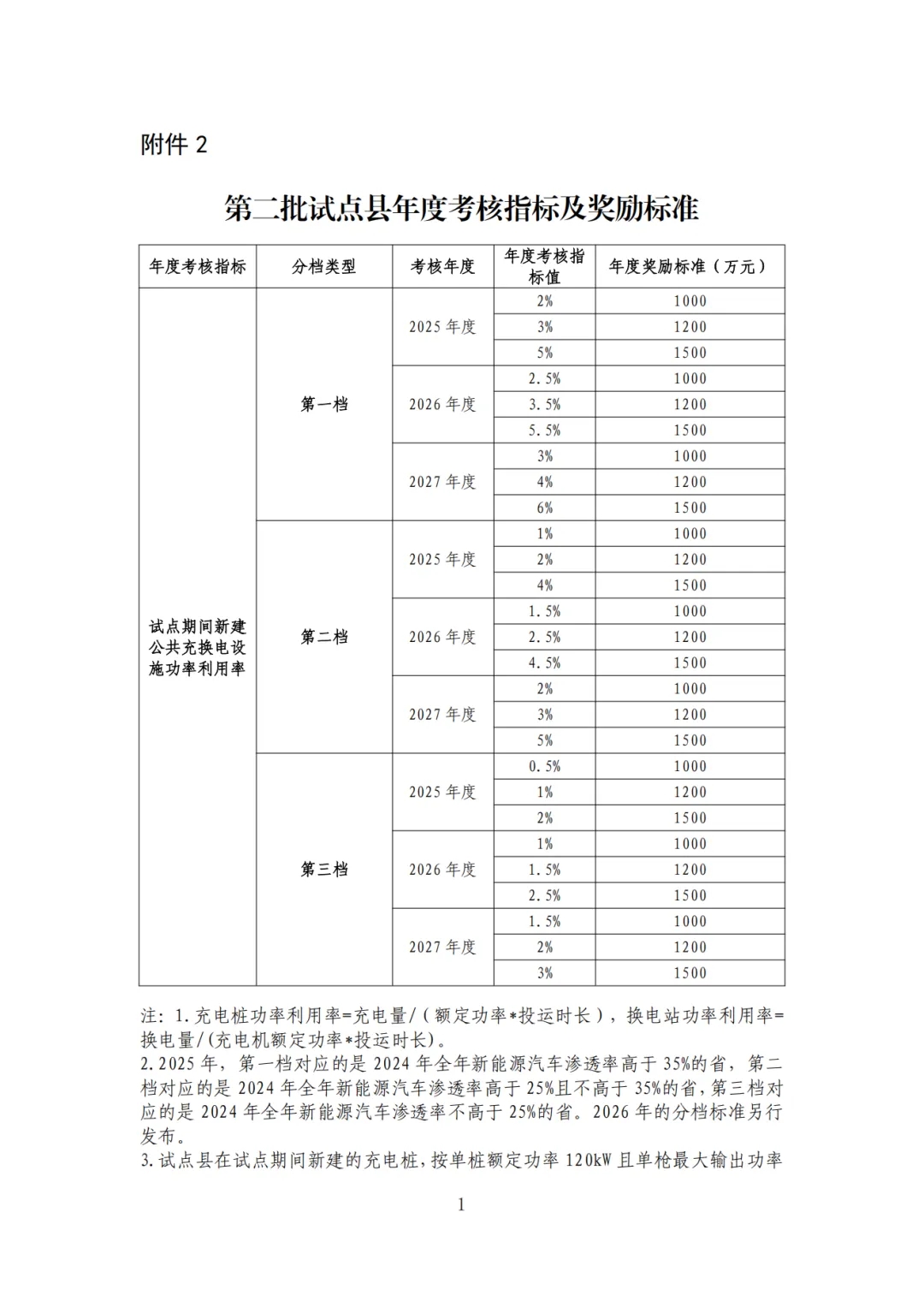 2月(yue)25日,國家財政部(bu)、工信(xin)部(bu)以及交通(tong)運輸部(bu)聯合印發《關于(yu)開展(zhan)(zhan)2025年(nian)縣(xian)域充換(huan)電設施(shi)補(bu)短板試(shi)點申(shen)報有關工作(zuo)的通(tong)知(zhi)》,其(qi)中明確,2025年(nian)計劃支持(chi)75個試(shi)點縣(xian)。由牽頭縣(xian)商其(qi)他(ta)參與縣(xian)統籌開展(zhan)(zhan)試(shi)點申(shen)報及后續公共(gong)充換(huan)電設施(shi)建設運營、獎(jiang)勵(li)資金(jin)分配等(deng)工作(zuo)。 對試點(dian)(dian)地區具有明顯示(shi)范效應的(de)(de)車網(wang)互動(dong)(V2G)項(xiang)目(試點(dian)(dian)地區V2G項(xiang)目整(zheng)體放電總(zong)功率(lv)(lv)原則上不低(di)于140千(qian)瓦,試點(dian)(dian)期(qi)內總(zong)放電量(liang)不低(di)于1.4萬千(qian)瓦時(shi)),可按照項(xiang)目總(zong)功率(lv)(lv)除以(yi)120千(qian)瓦(向下(xia)取整(zheng))的(de)(de)3倍系數進(jin)行標(biao)(biao)準樁數量(liang)折算(suan),折算(suan)的(de)(de)標(biao)(biao)準樁計(ji)入首次達到政策指標(biao)(biao)要求的(de)(de)年度(du)(2024年通過備案的(de)(de)第一批67個(ge)試點(dian)(dian)縣(xian)參照執(zhi)行)。 第二批(pi)試點縣年(nian)度考(kao)核指(zhi)標(biao)及(ji)獎勵標(biao)準顯示,年(nian)度獎勵最高達1500萬元。 原文如下: 關于開展2025年(nian)縣域充換(huan)電設施(shi)補(bu)短板(ban)試(shi)點(dian)申報有關工作的通知(zhi) 財辦建〔2025〕3號 有關省、自治區、直(zhi)轄市財政廳(局(ju))、工業和信息化主管(guan)部門、交(jiao)通(tong)運輸(shu)廳(局(ju)、委): 為(wei)加快補齊農村地區公共充(chong)換(huan)電設(she)施短板,進一步釋放(fang)新能源汽車消費(fei)潛力,根據(ju)財(cai)政部、工(gong)業(ye)和信息化部、交通運輸部(以下簡(jian)稱(cheng)三部門)《關于開展(zhan)縣域充(chong)換(huan)電設(she)施補短板試點(dian)(dian)工(gong)作的通知(zhi)》(財(cai)建〔2024〕57號,以下簡(jian)稱(cheng)《試點(dian)(dian)通知(zhi)》),現就2025年有關工(gong)作通知(zhi)如下: 一(yi)(yi)(yi)、優(you)化申報條件。鼓(gu)勵(li)兩個及(ji)以上的縣(xian)(xian)(xian)(xian)(xian)聯(lian)合(he)(he)申報試(shi)(shi)點(dian)(以下簡(jian)稱聯(lian)合(he)(he)試(shi)(shi)點(dian)縣(xian)(xian)(xian)(xian)(xian)),并作為(wei)整體共(gong)同完成試(shi)(shi)點(dian)任務及(ji)考(kao)核等(deng)相(xiang)關工作,聯(lian)合(he)(he)試(shi)(shi)點(dian)縣(xian)(xian)(xian)(xian)(xian)占用一(yi)(yi)(yi)個試(shi)(shi)點(dian)縣(xian)(xian)(xian)(xian)(xian)名額。聯(lian)合(he)(he)試(shi)(shi)點(dian)縣(xian)(xian)(xian)(xian)(xian)應明確一(yi)(yi)(yi)個牽頭縣(xian)(xian)(xian)(xian)(xian),由牽頭縣(xian)(xian)(xian)(xian)(xian)商其他參與縣(xian)(xian)(xian)(xian)(xian)統籌(chou)開(kai)展試(shi)(shi)點(dian)申報及(ji)后續公共(gong)充換(huan)電設施建設運營、獎勵(li)資金分配等(deng)工作。具備條件的市(shi)(shi)轄區(qu)可申報聯(lian)合(he)(he)試(shi)(shi)點(dian)縣(xian)(xian)(xian)(xian)(xian),并做好與周邊省市(shi)(shi)縣(xian)(xian)(xian)(xian)(xian)的場(chang)景聯(lian)動。試(shi)(shi)點(dian)縣(xian)(xian)(xian)(xian)(xian)所在地級市(shi)(shi)2024年汽(qi)車保有量應不低于25萬(wan)輛(liang)。 二、科學確定試(shi)點名(ming)額。2025年(nian)計(ji)劃支持(chi)75個試(shi)點縣(xian)。三部門根據地方當前新(xin)能源(yuan)汽車和(he)公共充換電設(she)施發展(zhan)狀(zhuang)況及(ji)未來潛力、地域面(mian)積、省內縣(xian)(縣(xian)級市)數量、當前財力狀(zhuang)況、2024年(nian)試(shi)點省公共充換電設(she)施接入(ru)新(xin)能源(yuan)汽車公共充換電基礎設(she)施獎勵資(zi)金清(qing)算(suan)平(ping)臺(以下簡稱(cheng)清(qing)算(suan)平(ping)臺)情況以及(ji)2024年(nian)績效(xiao)考核結果(guo)等因素分配省級試(shi)點縣(xian)名(ming)額(見附件1)。 三、鼓勵新技術(shu)應用。對試(shi)(shi)點地區具有明顯示(shi)范效(xiao)應的車網互動(V2G)項目(mu)(mu)(試(shi)(shi)點地區V2G項目(mu)(mu)整(zheng)體放(fang)電總功率原則上不低于(yu)140千(qian)瓦(wa),試(shi)(shi)點期內(nei)總放(fang)電量不低于(yu)1.4萬千(qian)瓦(wa)時),可按照項目(mu)(mu)總功率除(chu)以120千(qian)瓦(wa)(向(xiang)下取整(zheng))的3倍系(xi)數(shu)進行標準(zhun)樁(zhuang)數(shu)量折算(suan),折算(suan)的標準(zhun)樁(zhuang)計入首次達到政(zheng)策指標要求的年度(du)(2024年通過備案的第一批67個試(shi)(shi)點縣參(can)照執行)。 四、強化(hua)平(ping)(ping)(ping)臺(tai)(tai)監管。試(shi)(shi)點(dian)縣(xian)(xian)(xian)公共充(chong)換(huan)電(dian)設(she)(she)施(shi)(shi)應(ying)采用“直(zhi)(zhi)連(lian)”方式(shi)將(jiang)運行(xing)數據(ju)實(shi)時(shi)(shi)上傳至清算平(ping)(ping)(ping)臺(tai)(tai),并鼓勵(li)“直(zhi)(zhi)連(lian)+互聯互通”方式(shi)雙通道傳輸(shu)。各省(sheng)(sheng)可(ke)因地制宜(yi)搭建公共充(chong)換(huan)電(dian)設(she)(she)施(shi)(shi)平(ping)(ping)(ping)臺(tai)(tai)(以下簡稱省(sheng)(sheng)級(ji)平(ping)(ping)(ping)臺(tai)(tai)),清算平(ping)(ping)(ping)臺(tai)(tai)負責接收(shou)省(sheng)(sheng)級(ji)平(ping)(ping)(ping)臺(tai)(tai)傳輸(shu)的(de)公共充(chong)換(huan)電(dian)設(she)(she)施(shi)(shi)直(zhi)(zhi)連(lian)數據(ju),省(sheng)(sheng)級(ji)平(ping)(ping)(ping)臺(tai)(tai)需(xu)確保(bao)(bao)與試(shi)(shi)點(dian)縣(xian)(xian)(xian)公共充(chong)換(huan)電(dian)設(she)(she)施(shi)(shi)“直(zhi)(zhi)連(lian)”,以保(bao)(bao)證數據(ju)真實(shi)可(ke)靠。各省(sheng)(sheng)對(dui)試(shi)(shi)點(dian