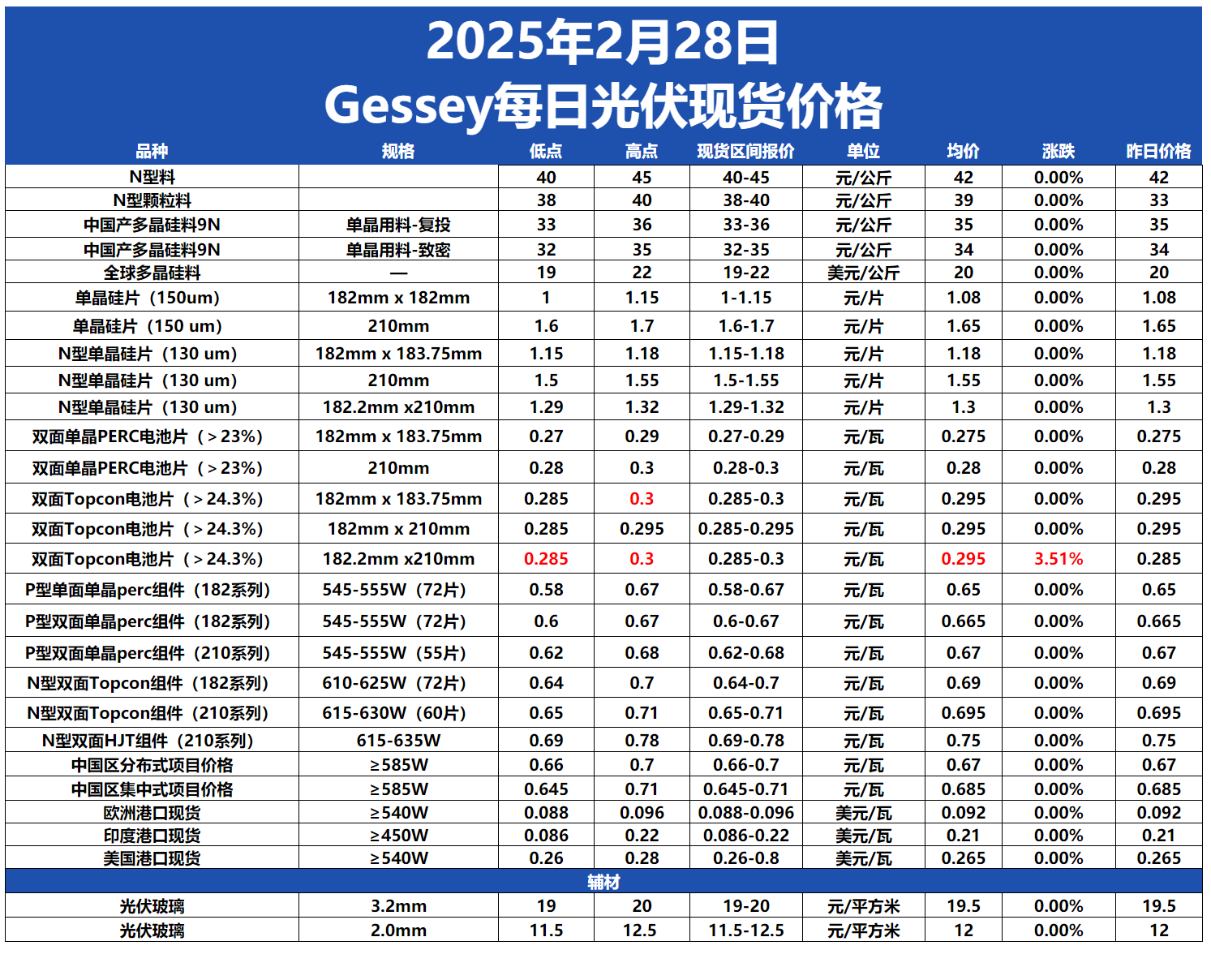 現貨市場價格變動: 多晶硅: 今日硅(gui)料價(jia)(jia)(jia)(jia)格(ge)(ge)整體(ti)維穩,N型料主(zhu)流(liu)價(jia)(jia)(jia)(jia)格(ge)(ge)在40-45元/公(gong)(gong)斤(jin),均價(jia)(jia)(jia)(jia)42元/公(gong)(gong)斤(jin)。N型顆粒硅(gui)主(zhu)流(liu)價(jia)(jia)(jia)(jia)格(ge)(ge)在38-40元/公(gong)(gong)斤(jin),均價(jia)(jia)(jia)(jia)39元/公(gong)(gong)斤(jin)。國產復(fu)投特級硅(gui)料主(zhu)流(liu)價(jia)(jia)(jia)(jia)格(ge)(ge)在33-36元/公(gong)(gong)斤(jin),均價(jia)(jia)(jia)(jia)35元/公(gong)(gong)斤(jin),國產致密特級硅(gui)料主(zhu)流(liu)價(jia)(jia)(jia)(jia)格(ge)(ge)在32-35元/公(gong)(gong)斤(jin),均價(jia)(jia)(jia)(jia)34元/公(gong)(gong)斤(jin)。 硅片: 今日(ri)硅(gui)(gui)片(pian)(pian)(pian)價格(ge)整(zheng)體維(wei)穩, 182mm單(dan)(dan)晶硅(gui)(gui)片(pian)(pian)(pian)主(zhu)流(liu)(liu)現(xian)(xian)(xian)貨(huo)價格(ge)維(wei)持(chi)1-1.15元(yuan)(yuan)/片(pian)(pian)(pian),均(jun)價1.08元(yuan)(yuan)/片(pian)(pian)(pian)。210mm單(dan)(dan)晶硅(gui)(gui)片(pian)(pian)(pian)主(zhu)流(liu)(liu)現(xian)(xian)(xian)貨(huo)價格(ge)維(wei)持(chi)1.6-1.7元(yuan)(yuan)/片(pian)(pian)(pian),均(jun)價1.65元(yuan)(yuan)/片(pian)(pian)(pian)。N型-183.75mm單(dan)(dan)晶硅(gui)(gui)片(pian)(pian)(pian)主(zhu)流(liu)(liu)現(xian)(xian)(xian)貨(huo)價格(ge)維(wei)持(chi)1.15-1.18元(yuan)(yuan)/片(pian)(pian)(pian),均(jun)價1.18元(yuan)(yuan)/片(pian)(pian)(pian)。N型-210mm單(dan)(dan)晶硅(gui)(gui)片(pian)(pian)(pian)主(zhu)流(liu)(liu)現(xian)(xian)(xian)貨(huo)價格(ge)維(wei)持(chi)1.5-1.55元(yuan)(yuan)/片(pian)(pian)(pian),均(jun)價1.55元(yuan)(yuan)/片(pian)(pian)(pian)。N型-210Rmm單(dan)(dan)晶硅(gui)(gui)片(pian)(pian)(pian)主(zhu)流(liu)(liu)現(xian)(xian)(xian)貨(huo)價格(ge)1.29-1.32元(yuan)(yuan)/片(pian)(pian)(pian),均(jun)價1.3元(yuan)(yuan)/片(pian)(pian)(pian)。 電池片: 今日電(dian)池(chi)片價(jia)格(ge)(ge)(ge)小幅(fu)上(shang)漲,23%以上(shang)183.75mm尺寸雙面單晶(jing)(jing)perc主流價(jia)格(ge)(ge)(ge)在(zai)0.27-0.29元(yuan)(yuan)(yuan)/瓦,均(jun)價(jia)0.275元(yuan)(yuan)(yuan)/瓦。23%以上(shang)210mm雙面單晶(jing)(jing)perc主流價(jia)格(ge)(ge)(ge)在(zai)0.28-0.3元(yuan)(yuan)(yuan)/瓦,均(jun)價(jia)0.28元(yuan)(yuan)(yuan)/瓦。24.3%以上(shang)183.75mm雙面Topcon電(dian)池(chi)片主流價(jia)格(ge)(ge)(ge)在(zai)0.285-0.3元(yuan)(yuan)(yuan)/瓦,均(jun)價(jia)0.295元(yuan)(yuan)(yuan)/瓦。24.3%以上(shang)210mm雙面Topcon電(dian)池(chi)片主流價(jia)格(ge)(ge)(ge)在(zai)0.285-0.295元(yuan)(yuan)(yuan)/瓦,均(jun)價(jia)0.295元(yuan)(yuan)(yuan)/瓦。24.3%以上(shang)210Rmm雙面Topcon電(dian)池(chi)片主流價(jia)格(ge)(ge)(ge)在(zai)0.285-0.3元(yuan)(yuan)(yuan)/瓦,均(jun)價(jia)0.295元(yuan)(yuan)(yuan)/瓦,上(shang)漲3.51%。 組件: 今日組(zu)件價(jia)(jia)(jia)(jia)格(ge)(ge)整(zheng)體維穩,雙(shuang)面(mian)單晶(jing)perc組(zu)件(182系列(lie))價(jia)(jia)(jia)(jia)格(ge)(ge)在(zai)(zai)(zai)(zai)(zai)0.6-0.67元(yuan)(yuan)(yuan)(yuan)(yuan)(yuan)(yuan)/ 瓦(wa)(wa)(wa)(wa),均(jun)價(jia)(jia)(jia)(jia)為(wei)0.665元(yuan)(yuan)(yuan)(yuan)(yuan)(yuan)(yuan)/瓦(wa)(wa)(wa)(wa)。雙(shuang)面(mian)單晶(jing)perc組(zu)件(210系列(lie))價(jia)(jia)(jia)(jia)格(ge)(ge)在(zai)(zai)(zai)(zai)(zai)0.62-0.68元(yuan)(yuan)(yuan)(yuan)(yuan)(yuan)(yuan)/ 瓦(wa)(wa)(wa)(wa),均(jun)價(jia)(jia)(jia)(jia)為(wei)0.67元(yuan)(yuan)(yuan)(yuan)(yuan)(yuan)(yuan)/瓦(wa)(wa)(wa)(wa)。N型(xing)(xing)雙(shuang)面(mian)Topcon 組(zu)件(182系列(lie))價(jia)(jia)(jia)(jia)格(ge)(ge)在(zai)(zai)(zai)(zai)(zai)0.64-0.7元(yuan)(yuan)(yuan)(yuan)(yuan)(yuan)(yuan)/ 瓦(wa)(wa)(wa)(wa),均(jun)價(jia)(jia)(jia)(jia)為(wei)0.69元(yuan)(yuan)(yuan)(yuan)(yuan)(yuan)(yuan)/瓦(wa)(wa)(wa)(wa)。N型(xing)(xing)雙(shuang)面(mian)Topcon 組(zu)件(210系列(lie))價(jia)(jia)(jia)(jia)格(ge)(ge)在(zai)(zai)(zai)(zai)(zai)0.65-0.71元(yuan)(yuan)(yuan)(yuan)(yuan)(yuan)(yuan)/ 瓦(wa)(wa)(wa)(wa),均(jun)價(jia)(jia)(jia)(jia)為(wei)0.695元(yuan)(yuan)(yuan)(yuan)(yuan)(yuan)(yuan)/瓦(wa)(wa)(wa)(wa)。N型(xing)(xing)雙(shuang)面(mian)HJT組(zu)件(210系列(lie))價(jia)(jia)(jia)(jia)格(ge)(ge)在(zai)(zai)(zai)(zai)(zai)0.69-0.78元(yuan)(yuan)(yuan)(yuan)(yuan)(yuan)(yuan)/ 瓦(wa)(wa)(wa)(wa),均(jun)價(jia)(jia)(jia)(jia)為(wei)0.75元(yuan)(yuan)(yuan)(yuan)(yuan)(yuan)(yuan)/瓦(wa)(wa)(wa)(wa)。中國(guo)區分布(bu)式項(xiang)目(≥580W)價(jia)(jia)(jia)(jia)格(ge)(ge)在(zai)(zai)(zai)(zai)(zai)0.62-0.68元(yuan)(yuan)(yuan)(yuan)(yuan)(yuan)(yuan)/瓦(wa)(wa)(wa)(wa),均(jun)價(jia)(jia)(jia)(jia)為(wei)0.67元(yuan)(yuan)(yuan)(yuan)(yuan)(yuan)(yuan)/瓦(wa)(wa)(wa)(wa),中國(guo)區集(ji)中式項(xiang)目(≥585W)價(jia)(jia)(jia)(jia)格(ge)(ge)在(zai)(zai)(zai)(zai)(zai)0.645-0.71元(yuan)(yuan)(yuan)(yuan)(yuan)(yuan)(yuan)/ 瓦(wa)(wa)(wa)(wa),均(jun)價(jia)(jia)(jia)(jia)為(wei)0.685元(yuan)(yuan)(yuan)(yuan)(yuan)(yuan)(yuan)/瓦(wa)(wa)(wa)(wa)。歐洲港口現貨(huo)價(jia)(jia)(jia)(jia)格(ge)(ge)在(zai)(zai)(zai)(zai)(zai)0.085-0.93美(mei)(mei)(mei)元(yuan)(yuan)(yuan)(yuan)(yuan)(yuan)(yuan)/ 瓦(wa)(wa)(wa)(wa),均(jun)價(jia)(jia)(jia)(jia)為(wei)0.092美(mei)(mei)(mei)元(yuan)(yuan)(yuan)(yuan)(yuan)(yuan)(yuan)/瓦(wa)(wa)(wa)(wa)。印度港口現貨(huo)價(jia)(jia)(jia)(jia)格(ge)(ge)在(zai)(zai)(zai)(zai)(zai)0.086-0.22美(mei)(mei)(mei)元(yuan)(yuan)(yuan)(yuan)(yuan)(yuan)(yuan)/ 瓦(wa)(wa)(wa)(wa),均(jun)價(jia)(jia)(jia)(jia)為(wei)0.21美(mei)(mei)(mei)元(yuan)(yuan)(yuan)(yuan)(yuan)(yuan)(yuan)/瓦(wa)(wa)(wa)(wa)。美(mei)(mei)(mei)國(guo)港口現貨(huo)價(jia)(jia)(jia)(jia)格(ge)(ge)在(zai)(zai)(zai)(zai)(zai)0.26-0.28美(mei)(mei)(mei)