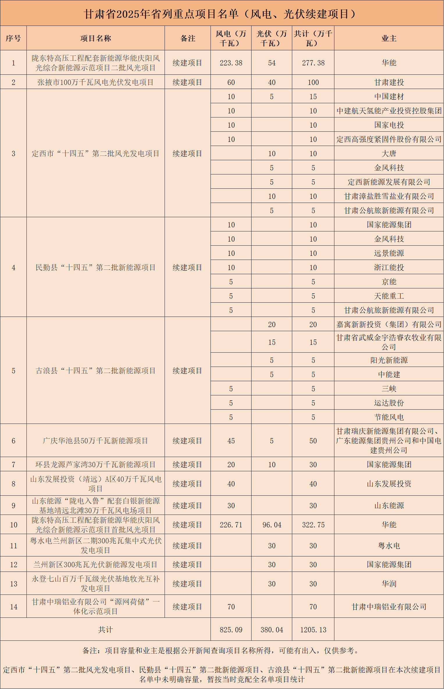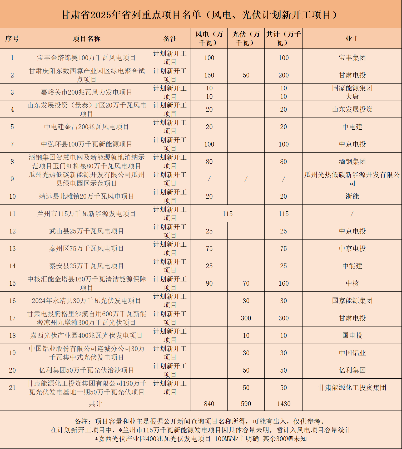 2月28日,甘肅省發改委發布2025年省列重大建設項目名單,名單包含續建項目、計劃新開工項目、預備項目。根據初步統計風電、光伏項目規模超26GW,其中風、光續建項目為12GW,新開工項目為14.3GW。 此前,2月13日,甘肅省人民政府辦公廳關于印發打造全國重要的新能源及新能源裝備制造基地行動方案的通知,通知指出,到2025年底,新能源裝機達到8000萬千瓦,裝機占比達到65%左右、發電量占比達到35%左右;煤電裝機達到3400萬千瓦以上,新型儲能裝機超過600萬千瓦,光熱發電裝機超過60萬千瓦;新能源及新能源裝備制造產值超千億元。 到2030年底,“五個功能區”建設成效顯著,全國重要的新能源及新能源裝備制造基地基本建成。新能源裝機達到1.6億千瓦,裝機占比70%左右、發電量占比超過40%;煤電裝機達到5000萬千瓦以上,抽水蓄能裝機達到1000萬千瓦,新型儲能裝機達到1000萬千瓦,光熱發電裝機超過100萬千瓦。 截至2025年1月1日,甘肅省新能源裝機容量已達6446萬千瓦,占全省電源總裝機容量(10040萬千瓦)的64.2%,新能源已成為全省第一大電源,主體地位進一步凸顯。