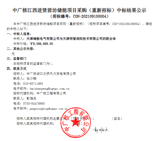 中廣核江西進賢前坊儲能項目采購發布了中標結果公示,天津瑞能電氣有限公司與天津明智潤陽技術有限公司的聯合體。