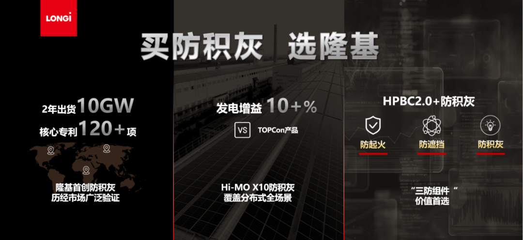 3月5日,在第二十屆中國(濟南)國際太陽能利用大會上,隆基發布了基于HPBC 2.0技術的Hi-MO X10防積灰組件。這款集高發電效率、高價值收益與創新防積灰技術于一體的產品,以“1個屋頂秒變1.2個”的顛覆性發電增益,成為“搶裝潮”之下工商業分布式光伏的優選。 Hi-MO X10防積灰組件發布現場 2025年2月,國家發改委、國家能源局等部門聯合下發了《分布式光伏發電開發建設管理辦法》與《關于深化新能源上網電價市場化改革 促進新能源高質量發展的通知》。隨即,分布式光伏迎來“搶裝潮”。如何在有限的屋頂面積上鋪設更多的光伏組件,成為業主們當下的核心需求。 新品發布儀式 “HPBC 2.0+防積灰”組件最高功率可達670W,量產組件最高轉化效率達24.8%,疊加隆基在行業內首創的防積灰技術,單位面積理論發電量較常規TOPCon組件高出10%以上,滿足了業主們“有限面積,更多發電”的需求。 “三防”組件,強上加強 當光伏組件受到陰影或者積灰遮擋時,會導致電流受阻,局部溫度升高后引發“熱斑效應”。當熱斑溫度過高,輕則加劇組件老化,導致電站發電效率下降;重則引發火災,對電站安全構成嚴重威脅。 Hi-MO X10防積灰組件基于隆基HPBC 2.0技術打造,在防積灰1.0產品的基礎上實現了全面升級,采用防積灰邊框設計與特有的類旁路二極管結構,具備防起火、防遮擋、防積灰的“三防”功能。 防積灰功能:通過防積灰邊框的功能,光伏組件可以充分利用雨水沖刷帶走灰塵,從而解決困擾分布式光伏市場多年的積灰現象,不但降低了組件運維清洗成本,還有效阻止了“熱斑”現象。對比實證數據表明,具有防積灰功能的組件,平均發電增益達到2.04%,最高增益可達6%。 防遮擋功能:在分布式場景中,經常遇到電線桿、通風管道等遮擋現象,此時Hi-MO X10防積灰組件在遭遇陰影遮擋時,受阻電流能夠自主繞過受阻區域,從其他路徑繞道分流,避免形成負載、產生局部高溫,不影響整串電池功率輸出,組件功率損失相比TOPCon產品減少70%。 防起火功能:在局部鳥糞、樹葉遮擋的情況下,該款組件可大幅降低陰影遮擋下的熱斑溫度,防止局部過熱。經過實驗室和實證案例的檢測顯示,在同樣的樹葉遮擋情況下,Hi-MO X10防積灰組件的局部溫度僅80多攝氏度,而TOPCon組件達到130攝氏度以上。 屋頂“躺著”多賺20% HPBC 2.0單塊組件8%的發電增益,在“防積灰”功能2%的發電增益加持下,Hi-MO X10防積灰組件的發電增益可達10%以上。 以一萬平米屋頂為例,按照主銷功率計算,Hi-MO X10防積灰組件(660W)較TOPCon組件(630W)每年多發電18.9萬度,收益增加11.3萬元,30年的全生命周期可增加收益約267萬元。 以此計算,在相同的屋頂面積中,BC二代較TOPCon可實現多裝6%,讓1個屋頂秒變1.2個屋頂,20年的收益可以購買一輛邁巴赫。 內核強大,廣受歡迎 自2023年10月隆基率先在全行業發布BC防積灰1.0組件以來,隆基的BC防積灰組件獲得諸多廠商的喜愛,為何廣受歡迎? 隆基分布式業務中國區總裁牛燕燕表示,在外行看來,防積灰組件僅僅是對組件邊框工藝進行優化設計,但其實它的“內核”是強大的研發能力和創新精神。 “為了研發防積灰組件,隆基先后克服了數十項工藝技術難題,積累了120多項專利,并與合作伙伴一起對電站投資業主進行了充分的價值傳遞,”牛燕燕表示,“買防積灰選隆基”的產品理念已經深入人心,并在業主端產生了良好的口碑效應。 權威檢驗,市場印證 目前,BC組件全球銷量已經超過30GW,其中防積灰組件超過10GW,在近10000座電站中得到廣泛應用。從北緯18°到北緯53°,從40℃的高溫到-40℃的嚴寒,都有電站在接受大自然嚴苛的檢驗,同時也受到權威檢測機構的認可和終端業主的好評。 國家光伏質檢中心(CPVT)作為中國首個國家級光伏產品法定檢驗機構,在位于銀川的戶外實證基地對隆基防積灰組件的發電性能和衰減進行了實測。7個月(2023年9月至2024年3月)的實測數據顯示,隆基BC防積灰組件較常規BC組件月均相對增益2.33%,最高月相對增益5.08%,最高單日增益達10%以上。 在業主看來,BC組件不但在技術方面有獨特優勢,而且還具有較快的回本周期。山東峰瑞電力科技有限公司總經理劉智表示,去年五月份在山東地區安裝的某個光伏電站每天平均發電4.5個小時,年發電超過1642小時(該地區光伏發電理論時長1400小時),超過預期發電10%,一年就能比預期多收益70多萬元,兩年多可以實現回本。 越來越多的頭部企業與行業標桿企業認可隆基BC組件的產品質量,并愿意為BC技術的高價值買單。采用隆基BC組件的光伏電站已經遍布全國各地,涵蓋紡織、農業、鋁業、水務、機場等各行各業,其中包括小米汽車、森馬服飾、奔馳車企、復旦大學、江蘇磊達、上海浦東機場等眾多國內外知名企業和機構。 質量為先,筑牢“常青”基石 在發布會上,隆基榮獲國際公認的測試、檢驗和認證機構SGS頒發的行業首張GB/T 32230-2015《企業質量文化建設指南》鉑金級證書。這一榮譽的背后,是隆基質量管理體系嚴格遵循高標準的證明。 SGS上海分公司總經理陳慧均表示,光伏行業的競爭重心已從“產能比拼”轉向“質量較量”,隆基緊跟國家戰略步伐,把“服務國家戰略”作為質量管理的核心基石,將實現從“世界制造基地”向“全球標準引領者”的華麗蛻變。 隨著光伏行業發展的成熟,分布式光伏電站得到普及,并獲得了終端業主的認可。當工商業企業主對