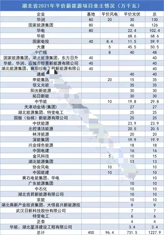 10月18日,湖(hu)北省能(neng)(neng)源(yuan)局(ju)發布了(le)2021年(nian)平價(jia)新(xin)(xin)能(neng)(neng)源(yuan)項目的通(tong)知,2021年(nian)全省安排新(xin)(xin)能(neng)(neng)源(yuan)項目總容(rong)量(liang)1227.9萬千(qian)(qian)瓦(wa)(wa)。其(qi)中,百萬千(qian)(qian)瓦(wa)(wa)基地10個、2021年(nian)安排容(rong)量(liang)400萬千(qian)(qian)瓦(wa)(wa);平價(jia)風(feng)電(dian)(dian)項目9個、容(rong)量(liang)96.4萬千(qian)(qian)瓦(wa)(wa);平價(jia)光伏發電(dian)(dian)項目75個、容(rong)量(liang)731.5萬千(qian)(qian)瓦(wa)(wa)。安排集中式(shi)(共(gong)享(xiang)式(shi))化學儲(chu)能(neng)(neng)電(dian)(dian)站(zhan)(不含基地配置的化學儲(chu)能(neng)(neng)電(dian)(dian)站(zhan))37個、容(rong)量(liang)2536兆瓦(wa)(wa)/5372兆瓦(wa)(wa)時。 就新能(neng)源項目規模而言,華(hua)(hua)潤、國家能(neng)源集團、華(hua)(hua)電(dian)均(jun)單(dan)獨獲得1GW以上項目。 以下為文(wen)(wen)件原(yuan)文(wen)(wen): 湖(hu)北省能源局(ju)關(guan)于公布(bu)2021年(nian)平價新能源項目的通(tong)知(zhi) 各有關市、州、直管(guan)市發(fa)改委(能源(yuan)局),國網湖北省(sheng)電力公司: 根(gen)據《國家(jia)能(neng)(neng)源(yuan)(yuan)(yuan)局關于2021年(nian)(nian)風電(dian)、光伏發(fa)電(dian)開(kai)發(fa)建(jian)(jian)設有關事項(xiang)(xiang)的通(tong)知(zhi)》(國能(neng)(neng)發(fa)新(xin)能(neng)(neng)〔2021〕25號)、《湖(hu)北省能(neng)(neng)源(yuan)(yuan)(yuan)局關于2021年(nian)(nian)平價(jia)新(xin)能(neng)(neng)源(yuan)(yuan)(yuan)項(xiang)(xiang)目開(kai)發(fa)建(jian)(jian)設有關事項(xiang)(xiang)的通(tong)知(zhi)》(鄂能(neng)(neng)源(yuan)(yuan)(yuan)新(xin)能(neng)(neng)〔2021〕44號)要求,現將2021年(nian)(nian)新(xin)能(neng)(neng)源(yuan)(yuan)(yuan)百萬千瓦基地、平價(jia)新(xin)能(neng)(neng)源(yuan)(yuan)(yuan)項(xiang)(xiang)目、集中式(shi)(共享式(shi))化(hua)學儲能(neng)(neng)電(dian)站予以(yi)公(gong)布。 一、2021年全省安(an)排(pai)新能(neng)源項目(mu)(mu)總容(rong)量(liang)1227.9萬千(qian)瓦(wa),其中,百(bai)萬千(qian)瓦(wa)基地(di)(di)10個、2021年安(an)排(pai)容(rong)量(liang)400萬千(qian)瓦(wa),平價風電項目(mu)(mu)9個、容(rong)量(liang)96.4萬千(qian)瓦(wa),平價光伏發電項目(mu)(mu)75個、容(rong)量(liang)731.5萬千(qian)瓦(wa)。安(an)排(pai)集中式(shi)(共(gong)享式(shi))化(hua)學儲能(neng)電站(zhan)(不(bu)含基地(di)(di)配置的化(hua)學儲能(neng)電站(zhan))37個、容(rong)量(liang)2536兆瓦(wa)/5372兆瓦(wa)時。 二、百(bai)萬(wan)(wan)千(qian)瓦(wa)基(ji)(ji)地先期均按照100萬(wan)(wan)千(qian)瓦(wa)規(gui)劃,根(gen)據項目(mu)進(jin)展情況,分(fen)年(nian)度配(pei)置(zhi)建(jian)設(she)(she)(she)規(gui)模。2021年(nian)每個基(ji)(ji)地配(pei)置(zhi)建(jian)設(she)(she)(she)規(gui)模40萬(wan)(wan)千(qian)瓦(wa),配(pei)置(zhi)的(de)建(jian)設(she)(she)(she)規(gui)模應在(zai)2023年(nian)底前全(quan)容(rong)量并網發(fa)電。對建(jian)設(she)(she)(she)進(jin)展快且有建(jian)設(she)(she)(she)空間(規(gui)模超過(guo)100萬(wan)(wan)千(qian)瓦(wa))的(de)基(ji)(ji)地,后(hou)期可適當增(zeng)加(jia)建(jian)設(she)(she)(she)規(gui)模。燃(ran)煤電廠(chang)機組靈(ling)活性改造用于配(pei)套基(ji)(ji)地的(de),其單個電廠(chang)所有新(xin)增(zeng)靈(ling)活調(diao)節(jie)能(neng)力(li)必(bi)須優先滿足基(ji)(ji)地項目(mu)靈(ling)活調(diao)節(jie)配(pei)置(zhi)要求。 三、平(ping)價風電項目(不含(han)百萬千瓦基地項目,下同(tong))必須(xu)(xu)在(zai)2022年(nian)1月底前完成核準(zhun),平(ping)價光伏發(fa)電項目必須(xu)(xu)在(zai)2022年(nian)1月底前開工建(jian)設(she)(開工標志為升壓(ya)站澆灌混凝(ning)土或主設(she)備基礎開始施工)。其它繼續按照《湖(hu)北省能(neng)源(yuan)局關(guan)于2021年(nian)平(ping)價新能(neng)源(yuan)項目開發(fa)建(jian)設(she)有關(guan)事項的通知》(鄂能(neng)源(yuan)新能(neng)〔2021〕44號)要求執(zhi)行。 四、為有序推進儲(chu)(chu)能電(dian)(dian)站(zhan)(zhan)建(jian)設(she)(she),切實提高(gao)儲(chu)(chu)能電(dian)(dian)站(zhan)(zhan)利(li)用效率,鼓勵企業按2021年(nian)配(pei)套(tao)的新能源項目建(jian)設(she)(she)規(gui)模減(jian)(jian)容建(jian)設(she)(she)(調減(jian)(jian)后的單個儲(chu)(chu)能電(dian)(dian)站(zhan)(zhan)容量(liang)不得(de)低(di)于(yu)50兆(zhao)瓦/100兆(zhao)瓦時(shi)),鼓勵1個企業集團的多(duo)個儲(chu)(chu)能電(dian)(dian)站(zhan)(zhan),或(huo)多(duo)家企業的儲(chu)(chu)能電(dian)(dian)站(zhan)(zhan),采(cai)取(qu)共享或(huo)購買(mai)服務方式合并集中建(jian)設(she)(she)。對未列(lie)入2021年(nian)建(jian)設(she)(she)計劃的化學儲(chu)(chu)能電(dian)(dian)站(zhan)(zhan)不得(de)自行建(jian)設(she)(she)。請有減(jian)(jian)容或(huo)合并建(jian)設(she)(she)需(xu)求的企業及時(shi)將需(xu)求及相關材料(liao)通過項目所在(zai)地市州發改委(能源局(ju))書面報(bao)送省能源局(ju)。 五、市州(zhou)發改(gai)委(能源局(ju))要(yao)(yao)切實(shi)履行屬地(di)管(guan)理(li)責任,督(du)促(cu)項(xiang)目(mu)(mu)單位(wei)嚴格(ge)(ge)按照(zhao)國家(jia)和(he)(he)省(sheng)有關(guan)要(yao)(yao)求,以及(ji)承諾(nuo)的(de)設(she)(she)計標(biao)(biao)(biao)(biao)準(zhun)和(he)(he)時(shi)間節點加快推(tui)進項(xiang)目(mu)(mu)建(jian)設(she)(she),確(que)保(bao)項(xiang)目(mu)(mu)按期建(jian)成并網。同時(shi),要(yao)(yao)加大協(xie)調服務和(he)(he)監管(guan)力(li)度(du),對監管(guan)中發現的(de)問