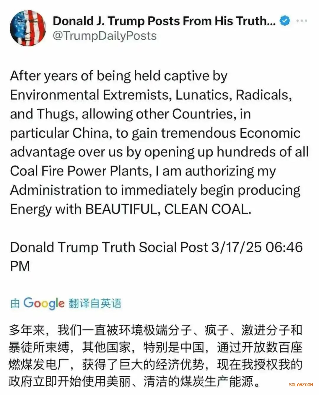 2025年3月17日,美(mei)(mei)國總統特朗普在(zai)社交(jiao)媒(mei)體平臺Truth Social上高調(diao)宣(xuan)布(bu),將“立即授權政府利用優質、清潔(jie)的(de)煤炭生(sheng)產能源”,并指責環保(bao)勢力“綁架”美(mei)(mei)國能源市(shi)場,稱其他國家(如(ru)中國)通過擴張煤電(dian)“獲得經濟優勢”。 在上周,美(mei)國環境保護(hu)署(shu)剛(gang)剛(gang)啟(qi)動(dong)對(dui)拜登(deng)的(de)一項限(xian)制煤(mei)炭排放的(de)政策(MATS)的(de)審查(cha)(cha),啟(qi)動(dong)審查(cha)(cha)后的(de)第(di)二天(tian),蒙大拿州最大的(de)煤(mei)礦就宣布(bu)獲得了擴建授權(quan)。 據(ju)了解(jie),特朗(lang)普撤銷(xiao)煤炭政策的具體措施(shi)與行動包含(han)以下幾點: 動用緊(jin)急權(quan)力阻(zu)止煤電(dian)廠(chang)關(guan)閉:美國(guo)內政部長道格·伯古姆(Doug Burgum)和(he)能源(yuan)部長克里斯·賴(lai)特(Chris Wright)透(tou)露,政府正計劃通過緊(jin)急狀態聲明,延長現有煤電(dian)廠(chang)壽命(ming),并加(jia)速新項(xiang)目審批。例如(ru),蒙大拿州的科斯特普(pu)(Colstrip)電(dian)廠(chang)和(he)斯普(pu)林溪(xi)煤礦(Spring Creek Mine)已獲重啟支持,相關(guan)污染監管(guan)規則亦被放松。 環保法規(gui)審查與逆轉:美國環保署(EPA)于(yu)3月12日宣布,將重(zhong)(zhong)新評估(gu)拜登政府2024年推出的《汞(gong)與空(kong)氣毒物標準(zhun)》(MATS),該規(gui)則旨在限制燃(ran)煤電(dian)廠的重(zhong)(zhong)金屬排放。次日,內政部(bu)批準(zhun)擴大蒙(meng)大拿州(zhou)最大煤礦的開采規(gui)模(mo)。支(zhi)(zhi)持“清潔煤技(ji)術(shu)”與能(neng)源(yuan)(yuan)安全:特朗普政府宣稱(cheng),重(zhong)(zhong)啟煤電(dian)是為滿(man)足人工(gong)智(zhi)能(neng)(AI)等高耗能(neng)產業(ye)的電(dian)力需求,并強調“能(neng)源(yuan)(yuan)獨立”和“經濟競(jing)爭力”。能(neng)源(yuan)(yuan)部(bu)長賴特在劍橋(qiao)能(neng)源(yuan)(yuan)周表示,美國需通過化石能(neng)源(yuan)(yuan)擴張降低能(neng)源(yuan)(yuan)成本,同(tong)時(shi)為“星(xing)際之(zhi)門(men)”(Stargate)等AI基建(jian)項目提供支(zhi)(zhi)持。 這些行(xing)(xing)動(dong)被視(shi)(shi)為特朗普(pu)上任后能(neng)源(yuan)(yuan)政策(ce)的(de)核心舉措之一。此前(qian),特朗普(pu)于1月20日(ri)簽署行(xing)(xing)政令,宣布國家進入“能(neng)源(yuan)(yuan)緊急狀態”,旨在為傳(chuan)統能(neng)源(yuan)(yuan)開發(fa)掃清障(zhang)礙(ai)。據悉,當(dang)前(qian)美(mei)國煤電(dian)占比已從2000年的(de)50%降至16%,且(qie)度電(dian)成本(5.8美(mei)分(fen)(fen)/度)高于天然氣(3.7美(mei)分(fen)(fen))和風光發(fa)電(dian)(3-4美(mei)分(fen)(fen))。不(bu)過,煤炭行(xing)(xing)業直接關聯美(mei)國西弗吉尼亞、懷(huai)俄(e)明等傳(chuan)統能(neng)源(yuan)(yuan)州的(de)4萬就業崗位(wei),重啟煤電(dian)被視(shi)(shi)為特朗普(pu)鞏(gong)固能(neng)源(yuan)(yuan)安全的(de)關鍵策(ce)略。