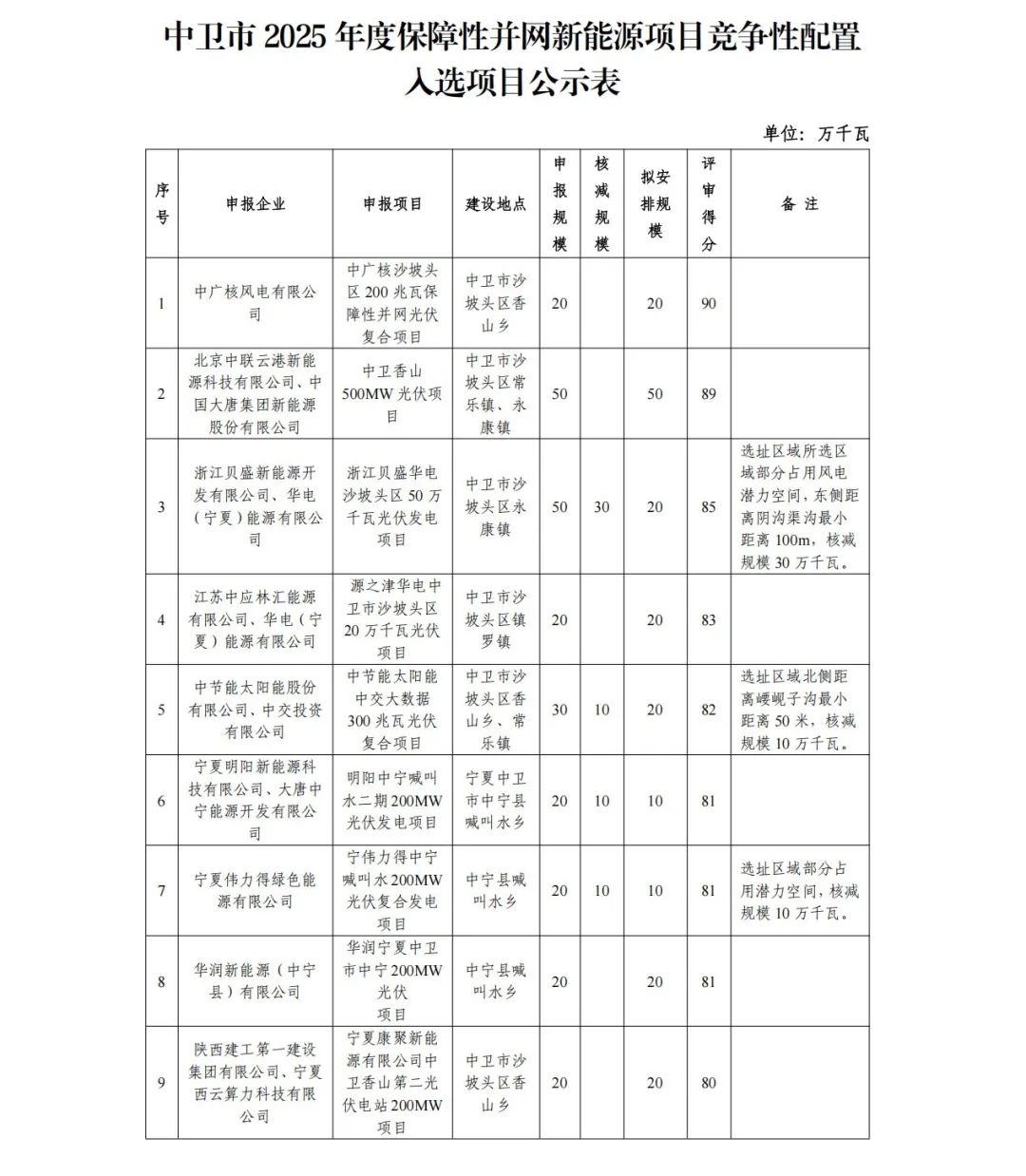 3月20日、21日,寧夏中衛、固原下發了保障性光伏項目競配結果,總規模為3570萬千瓦。 其中,寧夏中衛14個光伏入選項目,總規模350萬千瓦;固原市保障性并網光伏發電項目20萬千瓦。 從業主來看,華潤所獲規模最大,達到900MW;北京未來綠新能源科技有限公司、大唐集團緊隨其后,所獲規模為500MW;中國電建、九川數科(上海)技術有限公司,中國能建,株洲中車時代,所獲規模超300MW。此外,貝盛控股、華電集團等企業均有斬獲。 此前,在2025年1月14日,寧夏發改委印發《2025年度新能源項目開發建設方案》的通知。根據方案規劃,2025年,寧夏擬安排開展特色優勢產業綠電園區、保障性并網等新能源項目共計2062萬千瓦。其中特色優勢產業綠電園區項目602萬千瓦,要求在2025-2026年接網;保障性并網項目1460萬千瓦(均為光伏),要求在2026-2027年接網,由各市組織競爭性配置,項目儲能配置不低于20%、連續儲能時長4小時。 原文見下: 中衛市發展和改革委員會關于中衛市2025年度保障性并網新能源項目競爭性配置入選項目的公示 按照《自治區發展改革委關于印發<寧夏回族自治區2025年度新能源項目開發建設方案>的通知》(寧發改能源(發展)〔2025〕36號)要求,我委積極組織各縣(區)發展改革局開展相關工作,經與自治區發展改革委溝通對接,邀請相關專家對各縣(區)發展改革局上報的22個保障性并網新能源項目開展競爭性配置評審工作,并嚴格執行自治區下發的新能源潛力空間、中衛市“三區三線”劃定成果、生態環境分區管控等要求,綜合確定有關入選項目。 現將入選項目進行公示,公示期3個工作日,即2025年3月20日起至24日18:00止。如有異議,請將意見以書面形式送至我委能源與交通科。聯系方式:0955-7068775. 附件:中衛市2025年度保障性并網新能源項目競爭性配置入選項目公示表 中衛市發展和改革委員會 2025年3月20 關于固原市2025年20萬千瓦保障性并網光伏發電項目競爭性配置結果的公示 依據《寧夏回族自治區2025年度新能源項目開發建設方案》要求,按照《關于開展固原市2025年保障性并網光伏發電項目競爭性配置的通知》具體規定,固原市發展改革委組織開展了固原市2025年20萬千瓦保障性并網光伏發電項目競爭性配置評選工作,經過專家組對申報資料綜合評定,現將固原市2025年20萬千瓦保障性并網光伏發電項目競爭性配置結果公示如下: 一、評審結果 固原市2025年20萬千瓦保障性并網光伏發電項目的投資主體為華潤風電(海原)有限公司。 二、公示時間 公示期為2025年3月21日至2025年3月25日。 三、提交異議情況說明 公示期內參與此次競爭性配置企業如對結果有異議的,以書面形式向固原市發展改革委提出。異議文件應有明確的請求和必要的真實證明材料,提交異議文件須在2025年3月25日18時00分前提交至固原市發展和改革委員會。 四、聯系方式 聯系人:陳劍峰 聯系電話:0954-2088496 地址:固原市行政中心3026室 固原市發展和改革委員會 2025年3月21日