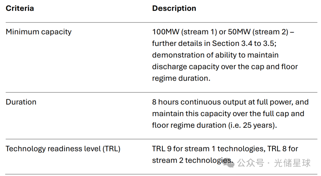 容(rong)量:成熟(shu)技術(Stream 1)≥100MW,新興技術(Stream 2)≥50MW。 技(ji)(ji)術(shu)(shu)準備水(shui)平(TRL):技(ji)(ji)術(shu)(shu)成(cheng)熟(shu)(shu)度的評估,分兩類(Stream 1和Stream 2),需(xu)滿(man)足TRL 9(成(cheng)熟(shu)(shu)技(ji)(ji)術(shu)(shu))或(huo)TRL 8(新興技(ji)(ji)術(shu)(shu))。 Stream 1將(jiang)用于技(ji)(ji)術(shu)(shu)準備水(shui)平(TRL)為(wei)9的技(ji)(ji)術(shu)(shu),最小容量(liang)為(wei)100MW,而Stream 2將(jiang)用于TRL為(wei)8的技(ji)(ji)術(shu)(shu),最大容量(liang)為(wei)50MW。