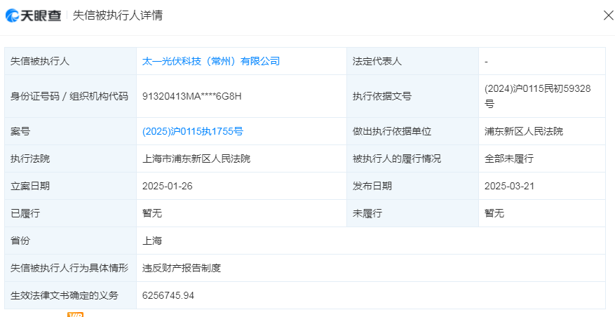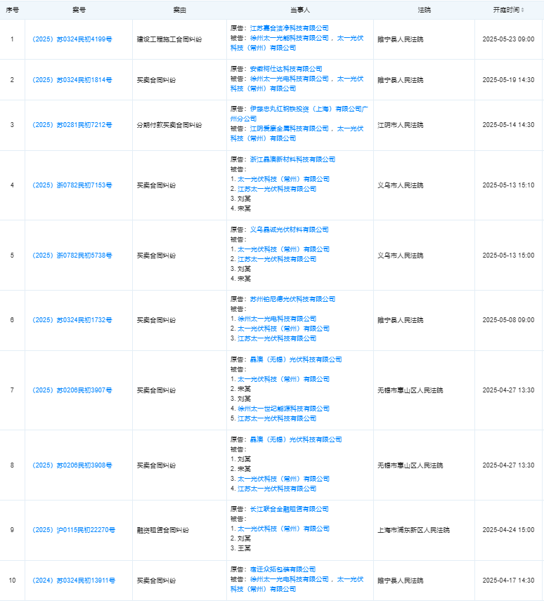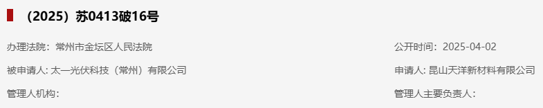 4月2日,昆山天洋新材料有限公司向江蘇常州市金壇區人民法院申請太一光伏科技(常州)有限公司(以下簡稱“太一光伏”)破產一事被公開,案號為(2025)蘇0413破16號。 資料顯示,太一光伏科技(常州)有限公司成立于2020年,注冊資本為38,800萬,該公司專注于太陽能光伏產品的研發、生產和銷售。 據悉,2025年開年以來,太一光伏深陷訴訟漩渦。以開庭時間為準,自2025年1月-5月太一光伏共涉訴46起案件。其中太一光伏作為被告的案件共有45起,案由多為買賣合同糾紛。 同時,太一光伏科技(常州)有限公司也是失信被執行人