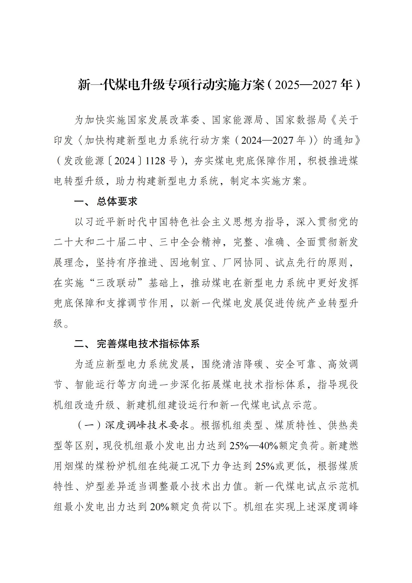 4月14日,國家發展改革委、國家能源局正式印發《新一代煤電升級專項行動實施方案(2025-2027年)》的通知,為適應新型電力系統發展,圍繞清潔降碳、安全可靠、高效調節、智能運行等方向進一步深化拓展煤電技術指標體系,指導現役機組改造升級、新建機組建設運行和新一代煤電試點示范。 文件提到,支持現役煤電改造升級機組、新建機組和新一代煤電試點示范機組與新能源實施聯營,鼓勵聯營的新能源項目優先并網。 詳情如下: