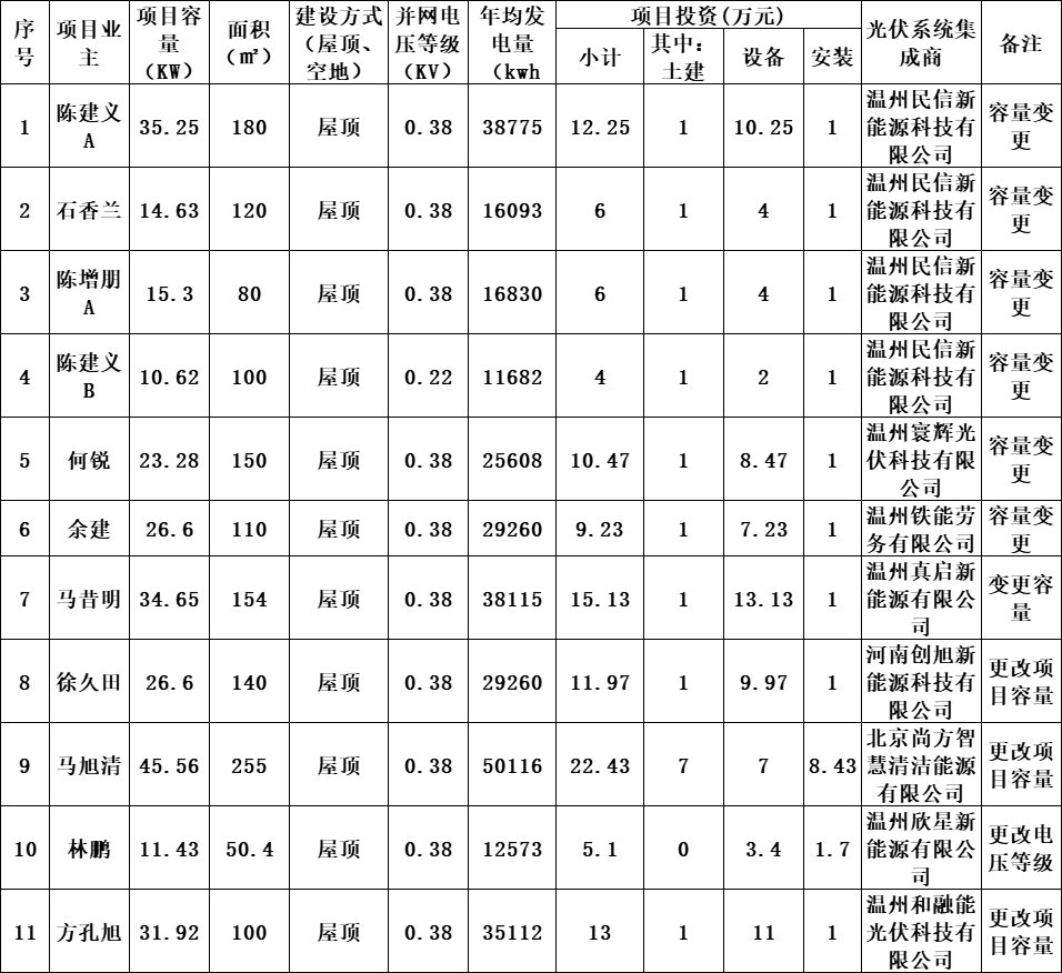 4月(yue)15日,浙江樂(le)清(qing)(qing)市(shi)發改局發布(bu)關(guan)于樂(le)清(qing)(qing)市(shi)2025年第六批居民家庭(ting)屋頂分布(bu)式光伏發電項目(mu)備(bei)案的通(tong)知。通(tong)知指出,本批次共有(you)居民家庭(ting)屋頂分布(bu)式光伏發電項目(mu)(變更)34個,總(zong)裝(zhuang)機容量(liang)803.4kWp,年平均發電量(liang)879893kWh。備(bei)案通(tong)知書(shu)有(you)效(xiao)期(qi)(qi)一年,自備(bei)案之(zhi)日起計;有(you)效(xiao)期(qi)(qi)內未開工(gong)建設的,應在(zai)備(bei)案通(tong)知書(shu)有(you)效(xiao)期(qi)(qi)滿30日前申請延期(qi)(qi)。逾期(qi)(qi)不報,備(bei)案通(tong)知書(shu)自動失效(xiao)。 原文如下(xia): 關于樂清市2025年第六批居民家庭屋頂分布式光伏發電項目備案的通知 國(guo)網浙江樂清市供電公司(si): 貴公司報(bao)送的樂(le)清市(shi)居(ju)民家(jia)庭屋(wu)頂分布式(shi)光(guang)伏發電(dian)(dian)項目(mu)備案申請材料已收悉,根據《浙江省光(guang)伏發電(dian)(dian)項目(mu)管理暫行辦法》(浙發改能源〔2014〕450號)《樂(le)清市(shi)人(ren)民政(zheng)府關于扶持分布式(shi)光(guang)伏發電(dian)(dian)的若(ruo)干(gan)意見》(樂(le)政(zheng)發〔2014〕29號),現予以集中備案,并(bing)就備案有關事項通知如下(xia): 一(yi)、本批次共有居民家庭屋頂(ding)分(fen)布式光伏發電項(xiang)目(mu)(mu)(變(bian)更(geng))34個,總裝機容量803.4kWp,年平均發電量879893kWh。項(xiang)目(mu)(mu)情況(kuang)詳(xiang)見附表。 二、本備(bei)案(an)通知書(shu)有(you)效(xiao)(xiao)期(qi)一年(nian),自備(bei)案(an)之(zhi)日(ri)起計;有(you)效(xiao)(xiao)期(qi)內未開(kai)工(gong)建設的,貴公司應在備(bei)案(an)通知書(shu)有(you)效(xiao)(xiao)期(qi)滿30日(ri)前向我局申(shen)請延(yan)期(qi)。逾(yu)期(qi)不報,備(bei)案(an)通知書(shu)自動失效(xiao)(xiao)。 三(san)、已備案項(xiang)目發生變(bian)更的,應(ying)辦理相應(ying)的變(bian)更手續(xu)。 四、居民家庭屋頂分(fen)布式光伏發(fa)電項(xiang)目屬自(zi)然人項(xiang)目,我局(ju)委托貴公(gong)司組織驗(yan)收(shou)。 五、本備案通知書不可作為項目(mu)所(suo)依(yi)托(tuo)的建筑物符(fu)合城鄉、土地等(deng)相關規劃(hua)的認定依(yi)據。 附件:樂清市2025年第六批居民家(jia)庭屋(wu)頂分布式光(guang)伏發電項目表 樂(le)清(qing)市發展和改革局(ju) 2025年4月(yue)14日 (此(ci)件公開(kai)發布) 樂(le)清市2025年(nian)第六(liu)批(pi)居(ju)民家庭屋頂分布式(shi)光伏發電項目表(biao)