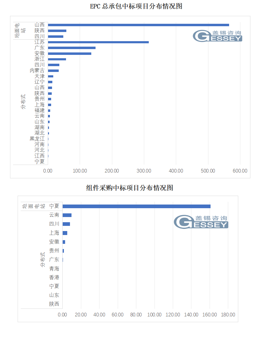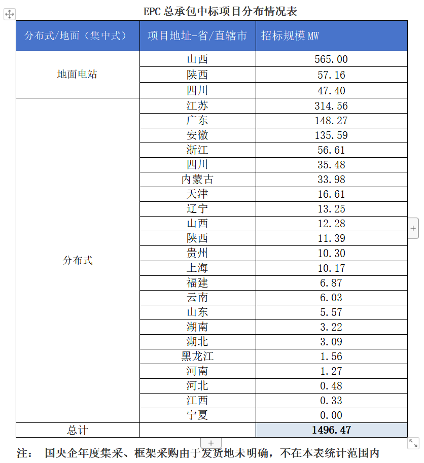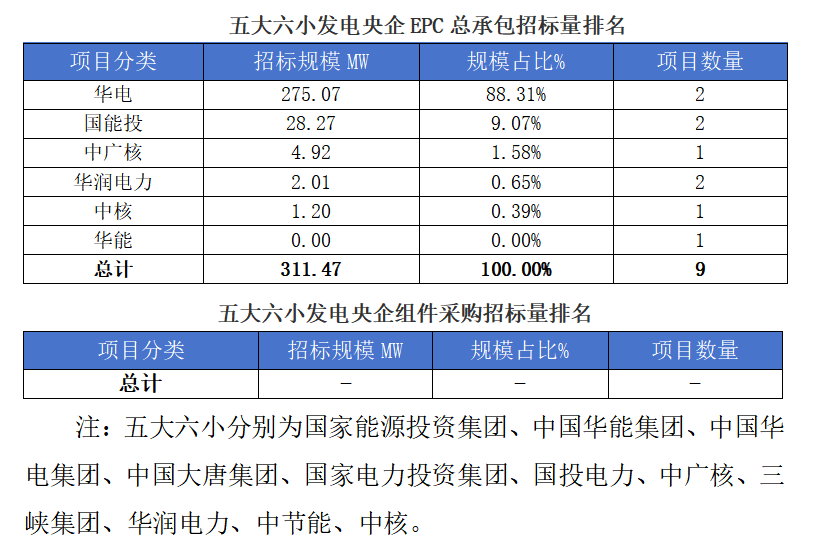 一、光伏項目招標情況匯總: 根據Gessey蓋錫咨(zi)詢統計(ji)(ji),4月5日-4月11日累計(ji)(ji)光伏(fu)招標項(xiang)目(mu)為(wei)(wei)187個(ge),項(xiang)目(mu)規(gui)模合計(ji)(ji)為(wei)(wei)1020.57MW。光伏(fu)組件采購招標項(xiang)目(mu)為(wei)(wei)29個(ge),招標規(gui)模為(wei)(wei)113.49MW,EPC總承包招標項(xiang)目(mu)為(wei)(wei)158個(ge),招標規(gui)模為(wei)(wei)907.08MW。 我(wo)們統(tong)計包(bao)含大型央企(qi)(qi)(qi)國企(qi)(qi)(qi)、地方(fang)能(neng)源集團、地方(fang)政府(fu)機關、兩大電網、央企(qi)(qi)(qi)總包(bao)企(qi)(qi)(qi)業、知(zhi)名光伏企(qi)(qi)(qi)業等,其中五大六(liu)小發電央企(qi)(qi)(qi)占總招標規模(mo)較高,具體(ti)各企(qi)(qi)(qi)業排名如下表: 二、中標項目分布類型匯總情況 本周中(zhong)(zhong)(zhong)(zhong)標項目需求按(an)照招(zhao)標場景地(di)(di)分(fen)布(bu),分(fen)布(bu)式光伏主(zhu)要集(ji)中(zhong)(zhong)(zhong)(zhong)在廣東、江蘇等(deng)地(di)(di)區,即主(zhu)要集(ji)中(zhong)(zhong)(zhong)(zhong)在中(zhong)(zhong)(zhong)(zhong)東部(bu)地(di)(di)區;集(ji)中(zhong)(zhong)(zhong)(zhong)式光伏主(zhu)要集(ji)中(zhong)(zhong)(zhong)(zhong)在山西(xi)、寧夏等(deng)地(di)(di)區,即主(zhu)要集(ji)中(zhong)(zhong)(zhong)(zhong)在西(xi)部(bu)地(di)(di)區。 三、EPC總承包及組件采購情況匯總 本周光(guang)伏(fu)EPC總(zong)承包(bao)中(zhong)(zhong)標(biao)規模達1500.30MW,總(zong)中(zhong)(zhong)標(biao)金額(e)339383.88萬元,平均(jun)中(zhong)(zhong)標(biao)單價為2.98元/W,中(zhong)(zhong)標(biao)數量(liang)153個。 本(ben)周光伏組件(jian)采購(gou)中(zhong)標(biao)(biao)規(gui)模達217.89MW,總(zong)中(zhong)標(biao)(biao)金額(e)17717.36萬元,平均(jun)中(zhong)標(biao)(biao)單價為0.71元/W,中(zhong)標(biao)(biao)數量21個。