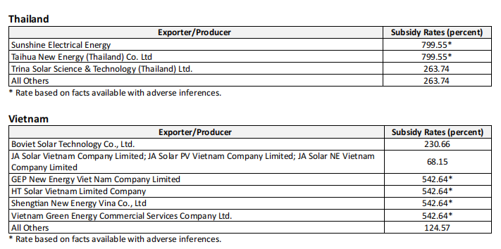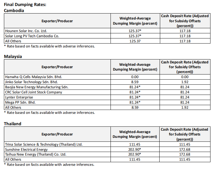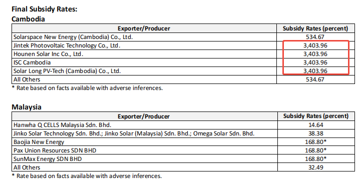 2025年4月21日,美國商務部(Commerce)宣布了對柬埔寨、馬來西亞、泰國和越南(Vietnam)四國光伏組件的反傾銷稅(AD)和反補貼稅(CVD)調查終裁決定。 根據文件,有關東南亞四國太陽能產品的反傾銷稅為0%至271.28%,具體取決于企業和國家,反補貼稅在14.64%至3403.96%之間,其中柬埔寨最高。 反傾銷稅具體情況見下: 反補貼稅率具體見下: 這一關稅決定是一項為期一年的貿易調查的最終結果,此次調查由美國太陽能制造貿易聯盟推動,包括First Solar、韓華Qcells等企業指控東南亞四國通過政府補貼和低價傾銷擠壓美國市場,對美國本土的太陽能產業造成了損害。 據悉,東南亞四國目前供應美國約77%的光伏組件,2024年對美出口太陽能設備總值達129億美元。 面對美國的圍追堵截,我國光伏企業已另行開辟新航道。2025年開年,已有10家海外光伏企業宣布擴產計劃,擬投資超172億元,計劃新增30.8GW電池及組件產能。 上一篇: 一道新能柔性支架點沙成“金”