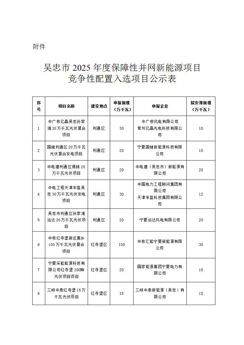 4月25日,寧夏吳忠市發展和改革委員會發布關于吳忠市2025年度保障性并網新能源項目競爭性配置入選項目的公示。 根據公示文件,2025年度吳忠市保障性并網新能源項目競爭性配置入選項目共計29個,全部為光伏項目,合計申報規模16.1GW,擬安排規模6GW。 原文如下: 吳忠市發展和改革委員會關于吳忠市2025年度保障性并網新能源項目競爭性配置入選項目的公示 按照《自治區發展改革委關于印發<寧夏回族自治區2025年度新能源項目開發建設方案>的通知》(寧發改能源(發展)〔2025〕36號)要求,我委組織各縣(區)、園區開展申報工作,申報項目確定后邀請相關專家及市直有關部門,開展競爭性配置評審工作,經嚴格評審,綜合確定以下項目入選。 現將入選項目進行公示,公示期3個工作日,即2025年4月25日起至28日18:00止。如有異議,請將意見以書面形式送至吳忠市發展改革委能源科。 聯系方式:0953-2039808。 附件:吳忠市2025年度保障性并網新能源項目競爭性配置入選項目公示表 吳忠市發展和改革委員會 2025年4月25日 上一篇: 國家電投再轉讓一家新能源公司股權