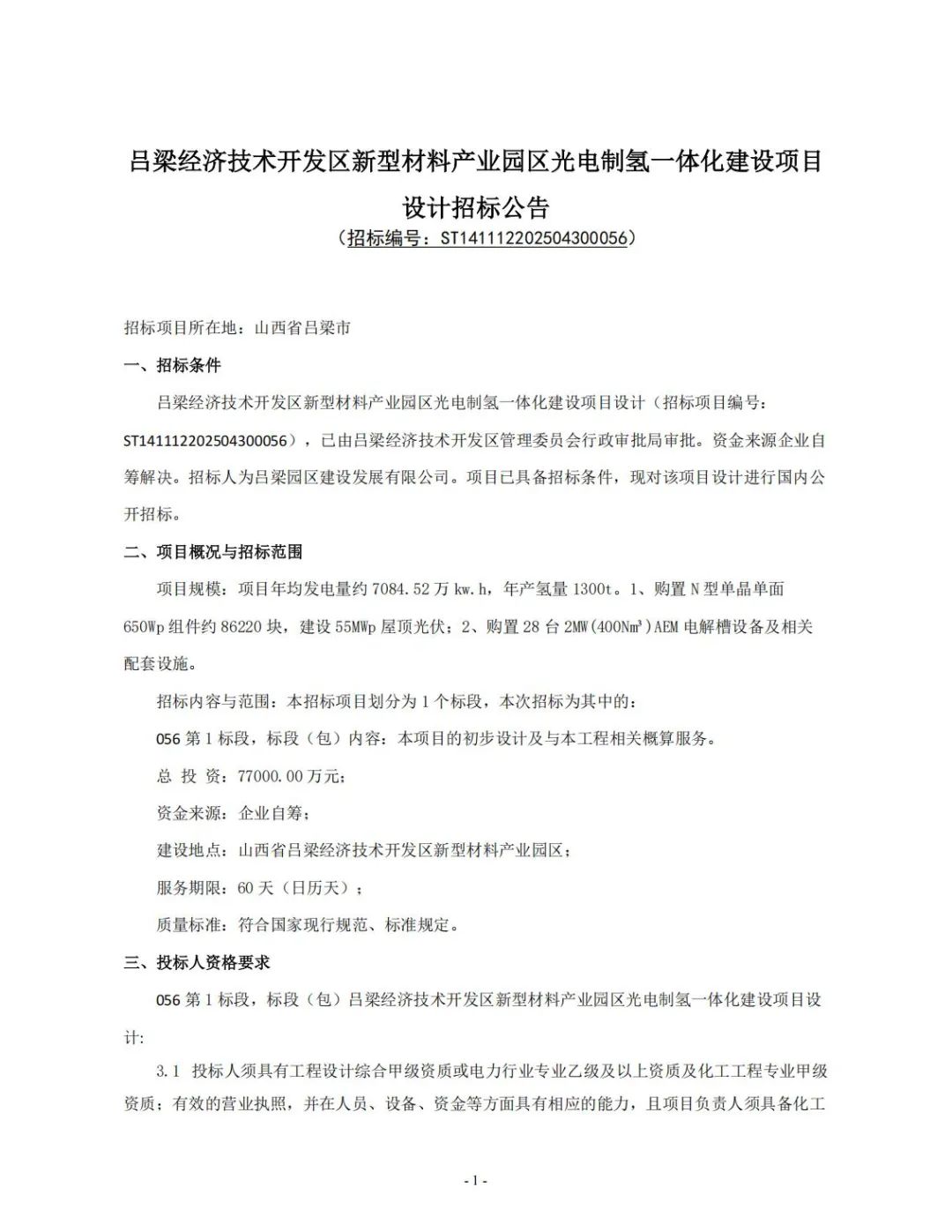 近日,呂(lv)梁經濟技術開發區(qu)新型材料產業(ye)園區(qu)光(guang)電制氫一體化建設項目(mu)設計招標公告(gao)。 根據招標公告(gao),呂梁(liang)經濟(ji)技術開(kai)發區(qu)新型材(cai)料產業園區(qu)光電制氫(qing)一體化建設項目位于(yu)山西省(sheng)呂梁(liang)經濟(ji)技術開(kai)發區(qu)新型材(cai)料產業園區(qu),總投資77000萬元。 項(xiang)目(mu)年(nian)均發電量約(yue)7084.52萬kw.h,年(nian)產氫量1300t。 1、購(gou)置N型單晶單面650Wp組件約86220塊,建(jian)設55MWp屋頂光伏; 2、購置28臺(tai)2MW(400Nm3)AEM電解槽(cao)設備(bei)及相關(guan)配套設施。 服務期(qi)限:60天(日(ri)歷天)。 本次(ci)招標項目(mu)接(jie)受聯合體投標。 招標公告如下: