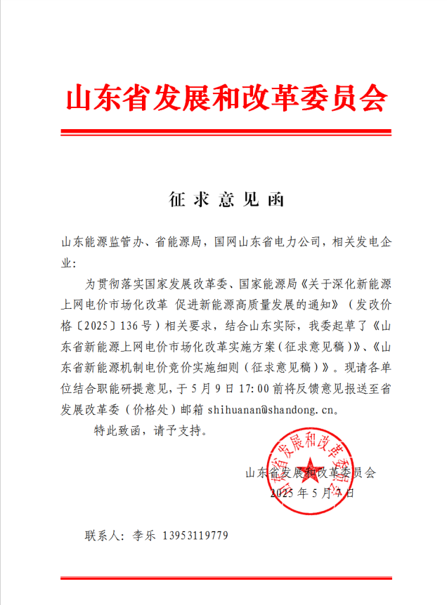 5月7日,山東省發改委發布《山東省新能源上網電價市場化改革實施方案(征求意見稿)》《山東省新能源機制電價競價實施細則(征求意見稿)》。 《山東省新能源上網電價市場化改革實施方案(征求意見稿)》表示,2025年5月31日前投產的存量新能源項目全電量參與市場交易后,機制電價水平按國家政策上限執行,統一明確為每千瓦時0.3949元(含稅);單個項目機制電量上限參考外省新能源非市場化率,適度優化;執行期限按照全生命周期合理利用小時數剩余小時數執行。 建立新能源可持續發展價格競爭機制。2025年6月1日起投產的增量新能源項目,由省發展改革委會同有關單位明確機制電量規模、執行期限,通過價格競爭方式確定機制電價水平。設置申報充足率下限,引導新能源充分競爭,降低全社會用能成本,2025年競價申報充足率不低于125%。競價時按申報價格從低到高確定入選項目,機制電價原則上按入選項目最高報價確定(不高于競價上限)。支持分布式光伏企業委托代理商參與競價工作,初期分布式光伏代理商應參考售電公司相應資質。2025年競價工作原則上于6月份組織。自2026年起競價工作原則上于前一年10月份組織。各地不得將配置儲能作為新建項目核準、并網、上網等的前置條件。 《山東省新能源機制電價競價實施細則(征求意見稿)》指出,本細則新能源項目,是指2025年6月1日及以后全容量并網的風電、太陽能發電項目(以下簡稱新能源項目 )。 全容量認定方式:新能源項目全容量并網規模,以項目核準(備案)容量為準。國網山東省電力公司應嚴格按照項目核準(備案)文件,出具接入系統設計方案書面回復意見(答復單),并組織并網驗收。 原文如下: