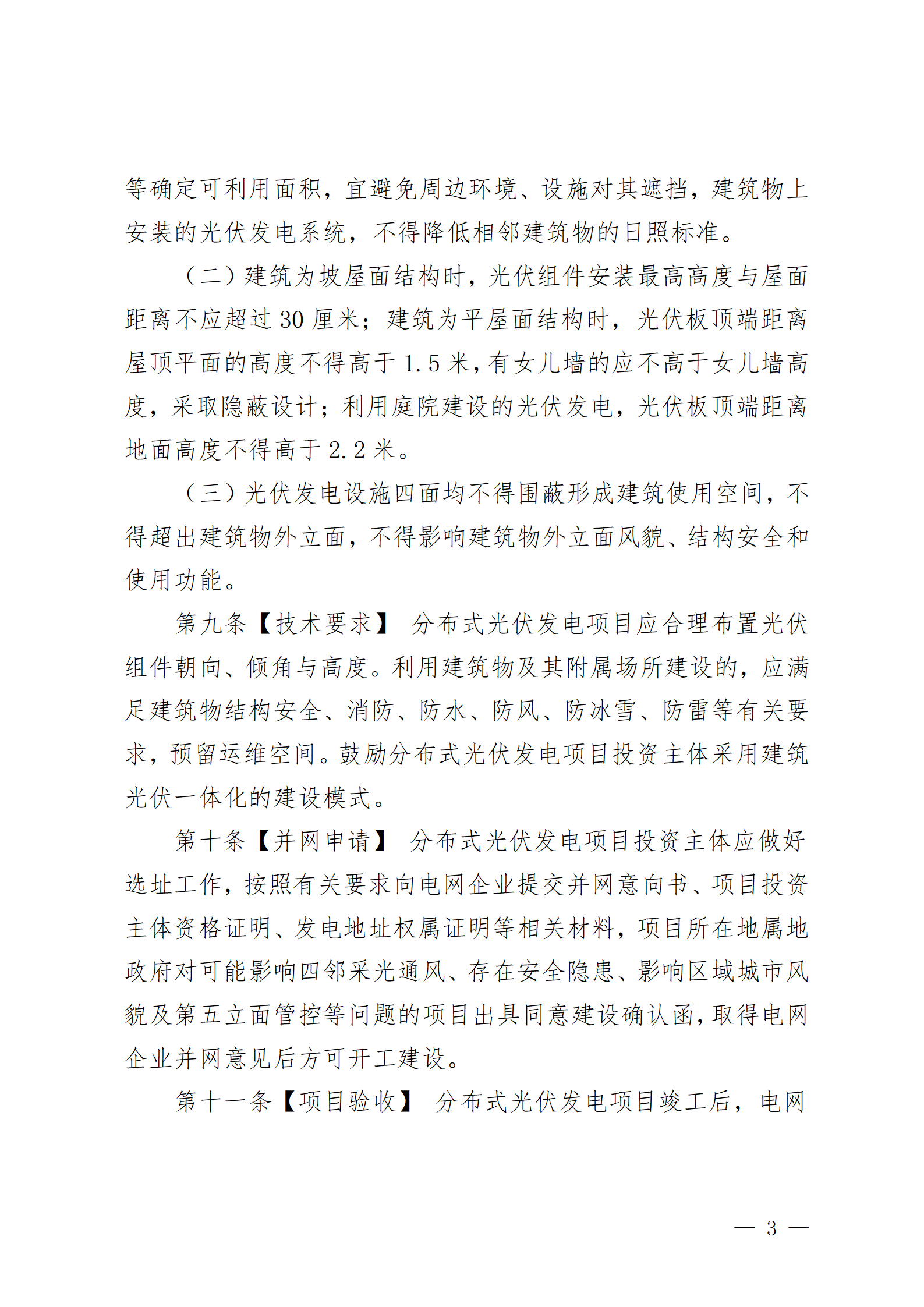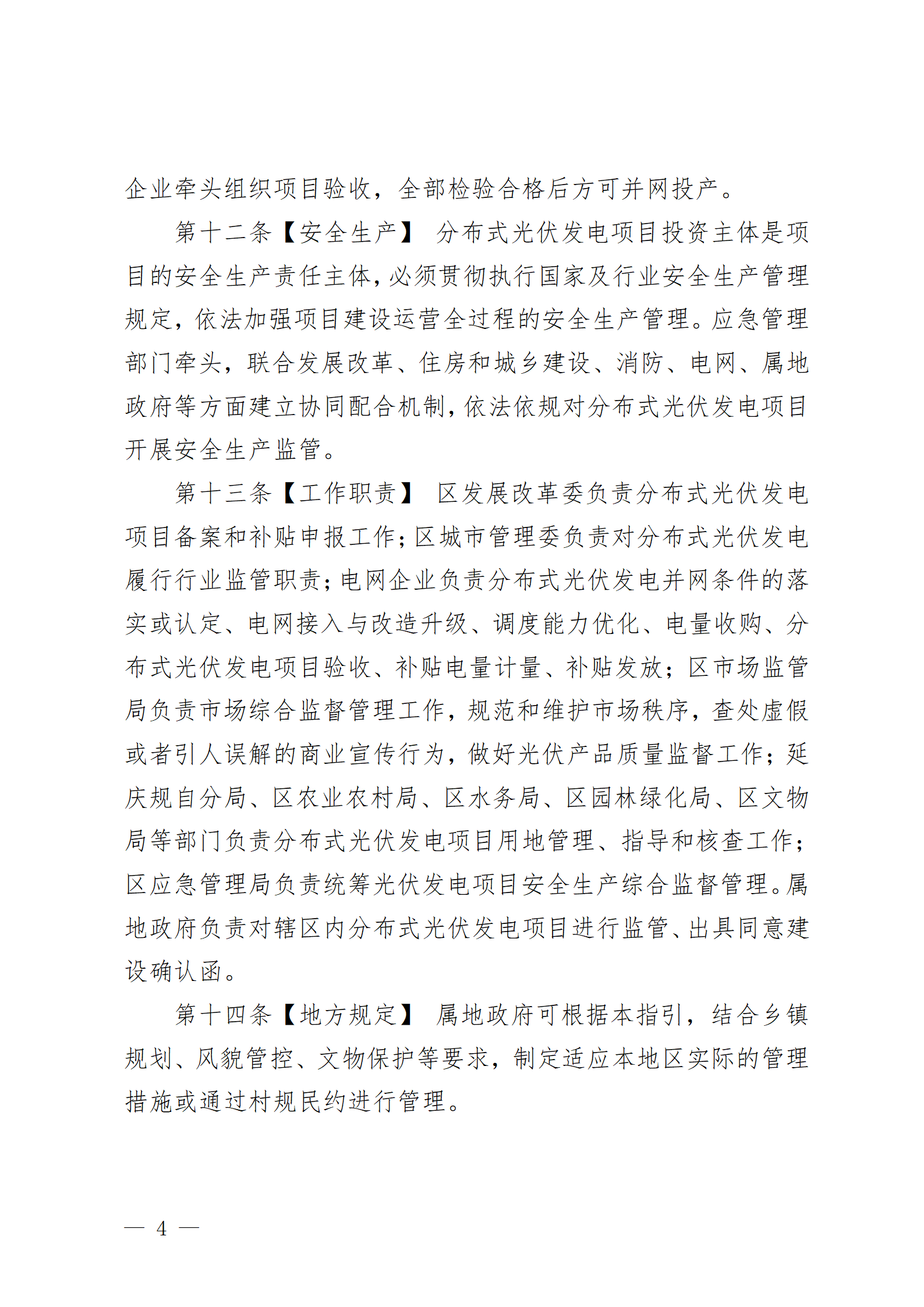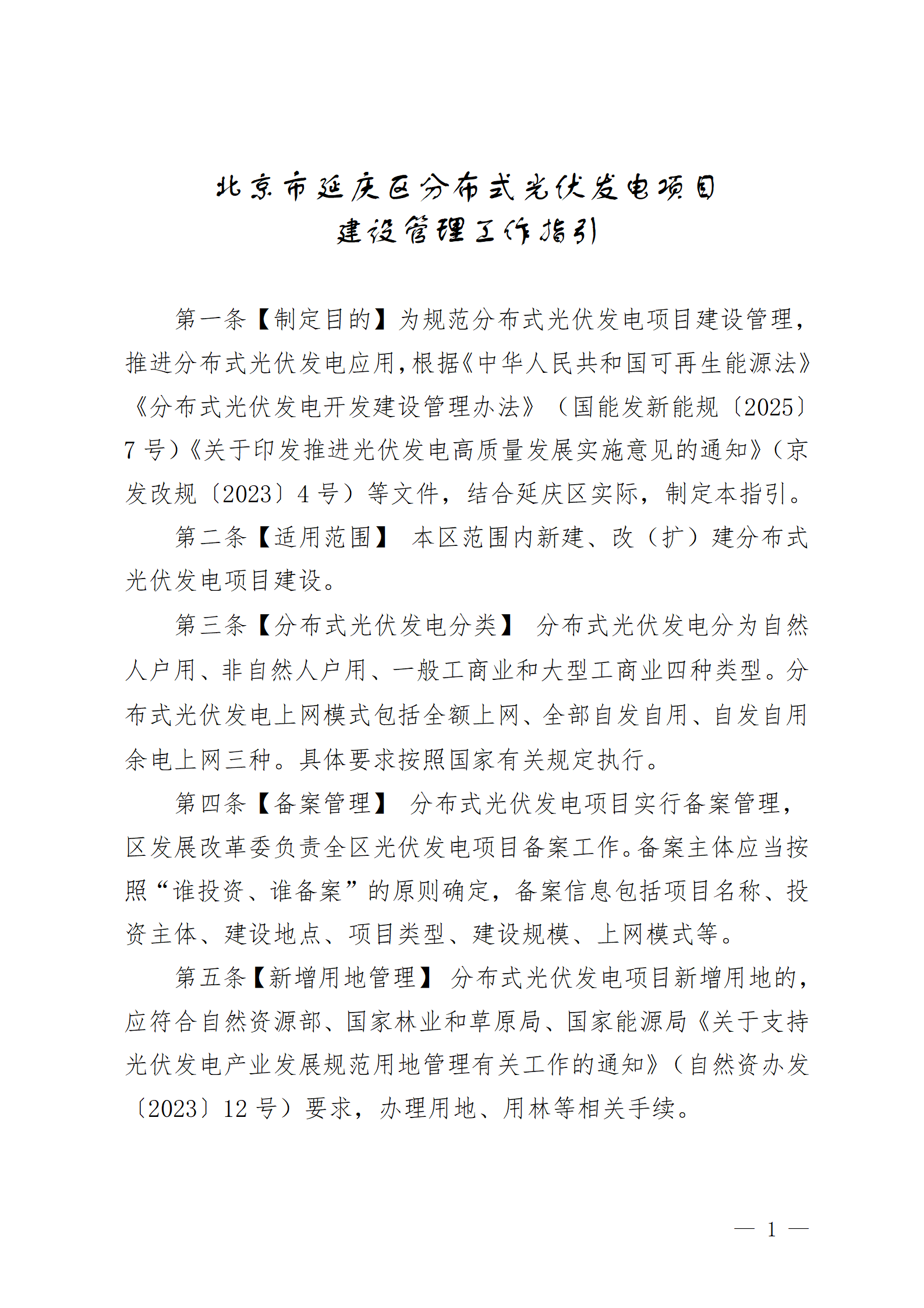 5月8日,北京市延慶區發改委發布該區分布式光伏發電項目建設管理辦法征求意見稿的反饋結果,意見征集期間,未收到與征求意見稿相關的意見建議。 據悉,4月22日,該區發布《北京市延慶區分布式光伏發電項目建設管理辦法(征求意見稿)》,文件明確:建筑為坡屋面結構時,光伏組件安裝最高高度與屋面距離不應超過30厘米;建筑為平屋面結構時,光伏板頂端距離屋頂平面的高度不得高于1.5米,有女兒墻的應不高于女兒墻高度,采取隱蔽設計;利用庭院建設的光伏發電,光伏板頂端距離地面高度不得高于2.2米。 詳情如下: 關于《北京市延慶區分布式光伏發電項目建設管理辦法(征求意見稿)》公開征求意見的反饋 2025年4月22日至4月29日,北京市延慶區發展和改革委員會在政府門戶網站(北京市政府門戶網站和延慶區政府門戶網站)對《北京市延慶區分布式光伏發電項目建設管理辦法(征求意見稿)》向社會公開征集意見。意見征集期間,未收到與征求意見稿相關的意見建議。 感謝社會各界對我們工作的關心和支持。 北京市延慶區發展和改革委員會 2025年5月8日