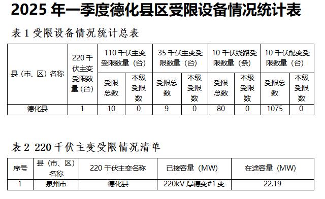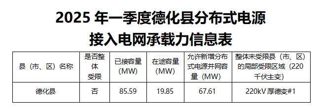 5月8日,福建省泉州市德化縣發改局公布該縣分布式光伏接入電網承載力信息,截至2025年3月31日,德化縣分布式光伏已接入容量85.59MW,在途容量19.85MW,全縣可新增開放容量67.61MW。