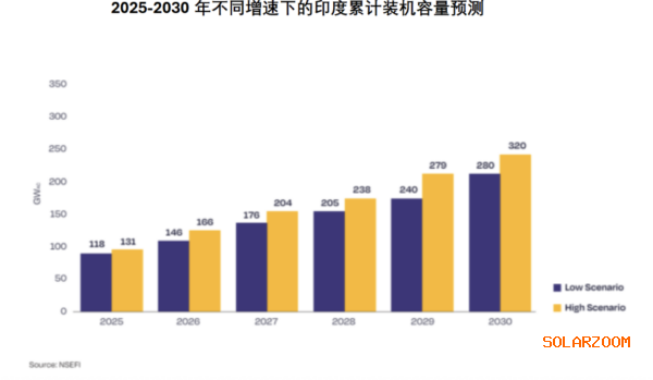 印(yin)度(du)的(de)(de)太(tai)陽(yang)能組件(jian)制造能力將(jiang)大幅提升(sheng),預(yu)計到(dao)2030年(nian)(nian),將(jiang)從(cong)2025年(nian)(nian)的(de)(de)80GW增(zeng)加(jia)至160GW。太(tai)陽(yang)能電池的(de)(de)生(sheng)產(chan)能力預(yu)計將(jiang)從(cong)15GW增(zeng)長至120GW。歐洲(zhou)光伏產(chan)業協會的(de)(de)一份最新報(bao)告援引了印(yin)度(du)國家太(tai)陽(yang)能聯合會針(zhen)對(dui)印(yin)度(du)的(de)(de)預(yu)測,該(gai)報(bao)告稱(cheng),到(dao)2030年(nian)(nian),印(yin)度(du)晶圓和多晶硅產(chan)能預(yu)計將(jiang)從(cong)2025年(nian)(nian)的(de)(de)6GW擴大至100GW。 這一預(yu)期增(zeng)長(chang)凸顯了印(yin)度對(dui)擴大(da)其太陽(yang)能制造基地的(de)關注,旨在支持可再生(sheng)能源目標并減少對(dui)進(jin)口的(de)依(yi)賴。 印度的目(mu)標(biao)(biao)是(shi)到(dao)2030年(nian)(nian)(nian)非化(hua)石燃料發(fa)電能力達到(dao)500GW。2025年(nian)(nian)(nian)2月,該國太(tai)陽能裝機容量超(chao)過100GW,其(qi)中一半以上是(shi)在(zai)過去三年(nian)(nian)(nian)中安(an)裝的。為了實現其(qi)2030年(nian)(nian)(nian)的可再生能源目(mu)標(biao)(biao),印度計劃在(zai)未來(lai)五(wu)年(nian)(nian)(nian)內再安(an)裝200GW的太(tai)陽能。2024年(nian)(nian)(nian),印度年(nian)(nian)(nian)度光(guang)伏裝機量同比增(zeng)長145%,達到(dao)30.7GW,預(yu)計到(dao)2025年(nian)(nian)(nian)將增(zeng)長21%,達到(dao)37.3GW。 根據目前的趨勢和政策支持(chi),該報(bao)告(gao)預(yu)測,到2030年,印度(du)的累(lei)計太陽能光伏裝機容量在(zai)低增長情況(kuang)(kuang)下和高增長情況(kuang)(kuang)下,將(jiang)分別達(da)到280GW和320GW(AC)。 下一篇: 法國公社使用當地太陽能