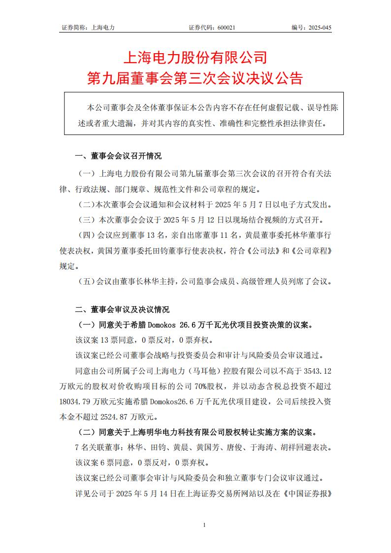 5月14日,上海電力發布上海電力股份有限公司第九屆董事會第三次會議決議公告。 根據公告,上海電力董事會同意關于希臘 Domokos 26.6 萬千瓦光伏項目投資決策的議案。 該議案已經公司董事會戰略與投資委員會和審計與風險委員會審議通過。 同意由公司所屬子公司上海電力(馬耳他)控股有限公司以不高于 3543.12萬歐元的股權對價收購項目標的公司 70%股權,并以動態含稅總投資不超過18034.79 萬歐元實施希臘 Domokos26.6 萬千瓦光伏項目建設,公司后續投入資本金不超過 2524.87 萬歐元。